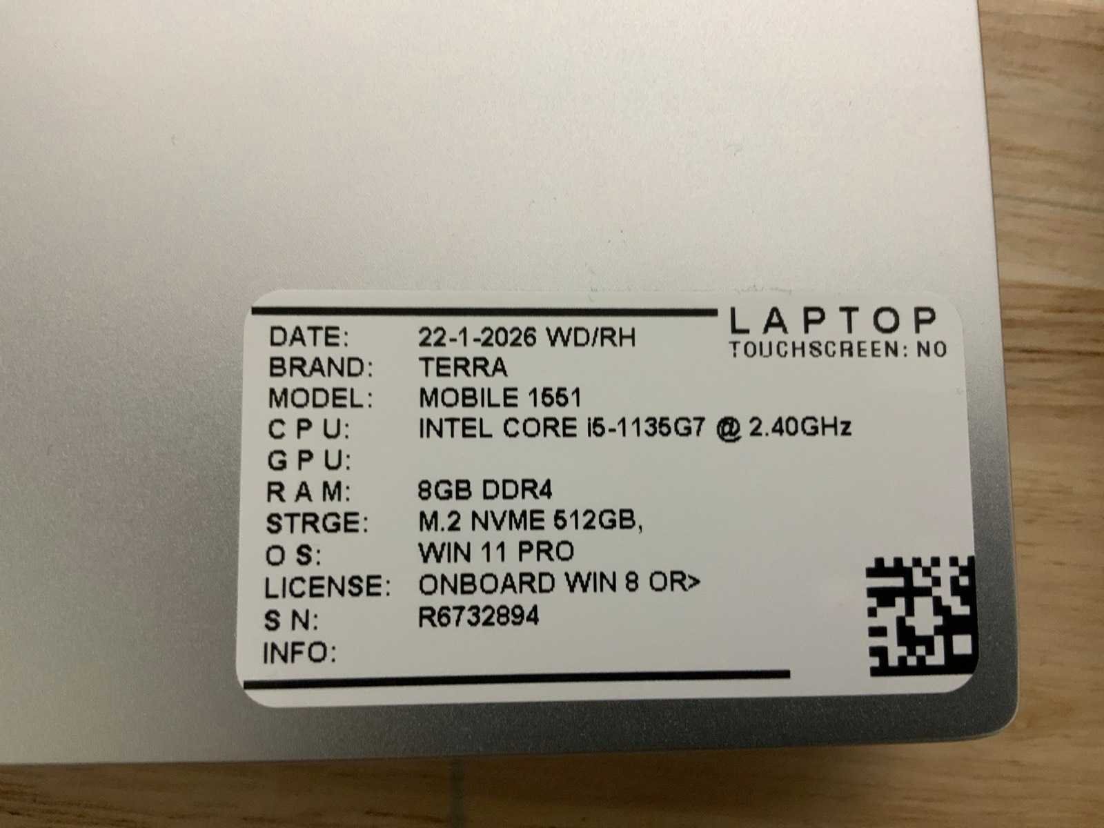 Merk: Terra Type: Mobile 1551 (i5-gen11) Processor type: Intel core i5-1135G7 Processorsnelheid Ghz: 2,40 RAM Geheugen: 8GB RAM Geheugen Type: Ddr4 Totale opslagcapaciteit: 512GB Type datadrager: Nvme Aantal datadragers: 1 Besturingssysteem: Windows 11 pro Zonder adapter: true Wifi: true Bluetooth: true USB-Type: Usb-A/Usb-C USB poorten: 4 Card reader: true Koptelefoon aansluiting: true Webcam: true HDMI: 1