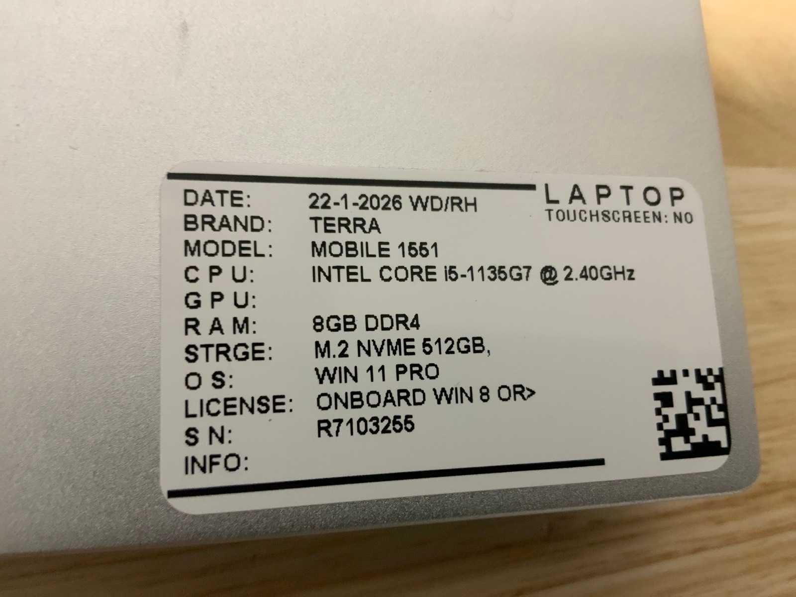 Merk: Terra Type: Mobile 1551 (i5-gen11) Processor type: Intel core i5-1135G7 Processorsnelheid Ghz: 2,40 RAM Geheugen: 8GB RAM Geheugen Type: Ddr4 Totale opslagcapaciteit: 512GB Type datadrager: Nvme Aantal datadragers: 1 Besturingssysteem: Windows 11 pro Zonder adapter: true Wifi: true Bluetooth: true USB-Type: Usb-A/Usb-C USB poorten: 4 Card reader: true Koptelefoon aansluiting: true Webcam: true HDMI: 1