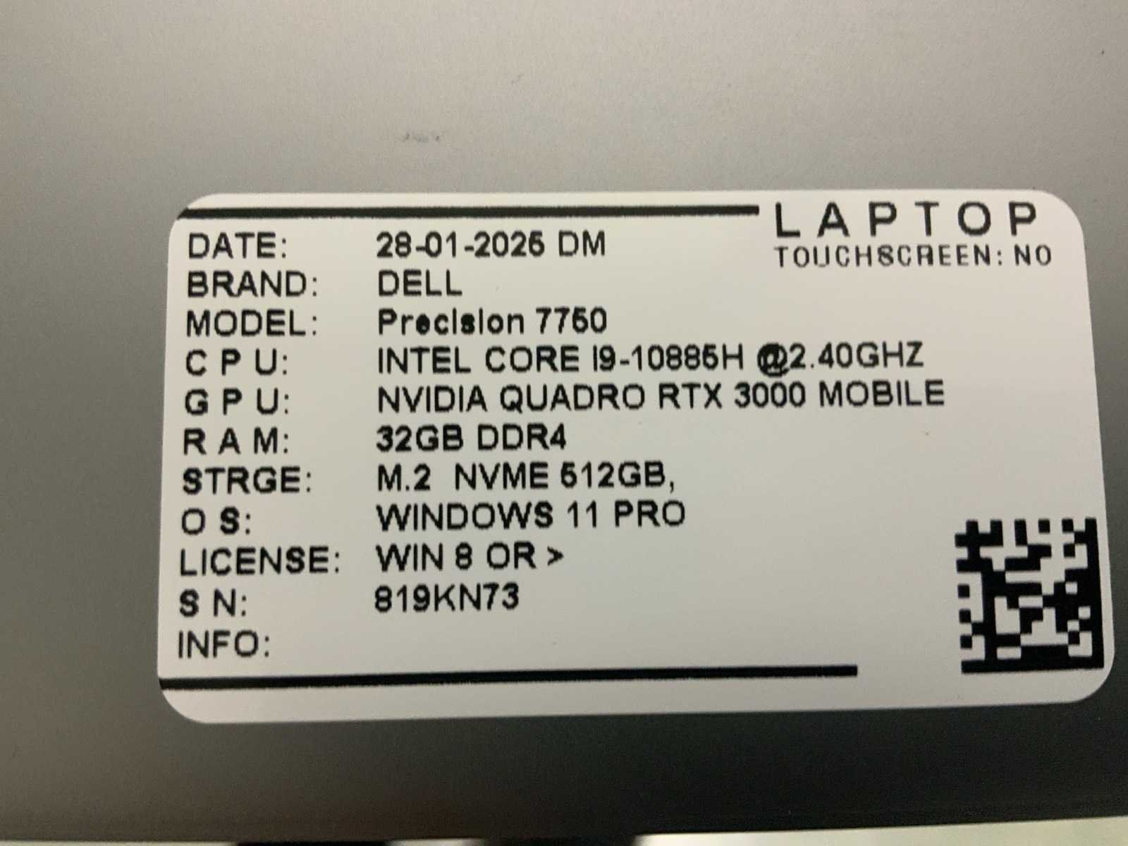 Merk: Dell Type: Precision 7750(i9) Processor type: Intel core i9-10885H Processorsnelheid Ghz: 2,4 RAM Geheugen: 32GB RAM Geheugen Type: Ddr4 Totale opslagcapaciteit: 512GB Type datadrager: Nvme Aantal datadragers: 1 Type videokaart: Nvidia rtx 3000 Besturingssysteem: Windows 11 pro Licentie: Onboard Zonder adapter: true Wifi: true Bluetooth: true Ethernet: 1 USB-Type: Usb-A/Usb-C USB poorten: 5 Card reader: true Koptelefoon aansluiting: true Webcam: true Toetsenbord: Qwertz HDMI: 1