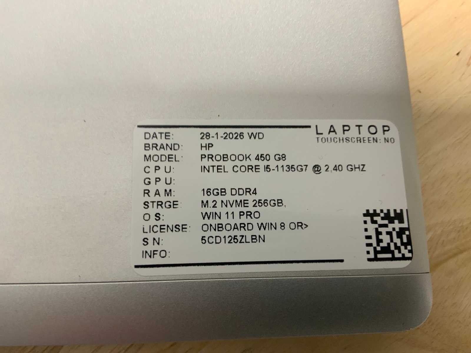 Merk: Hp Type: ProBook 450 G8 Processor type: Intel core i5-1135G7 Processorsnelheid Ghz: 2,4 RAM Geheugen: 16GB RAM Geheugen Type: DDR4 Totale opslagcapaciteit: 256GB Type datadrager: M.2 SSD Aantal datadragers: 1 Besturingssysteem: Windows 11 Pro Licentie: Onboard Zonder adapter: true Wifi: true Bluetooth: true Ethernet: 1 USB-Type: USB-A & USB-C USB poorten: 4 Card reader: true Koptelefoon aansluiting: true Webcam: true Toetsenbord: QWERTY HDMI: 1