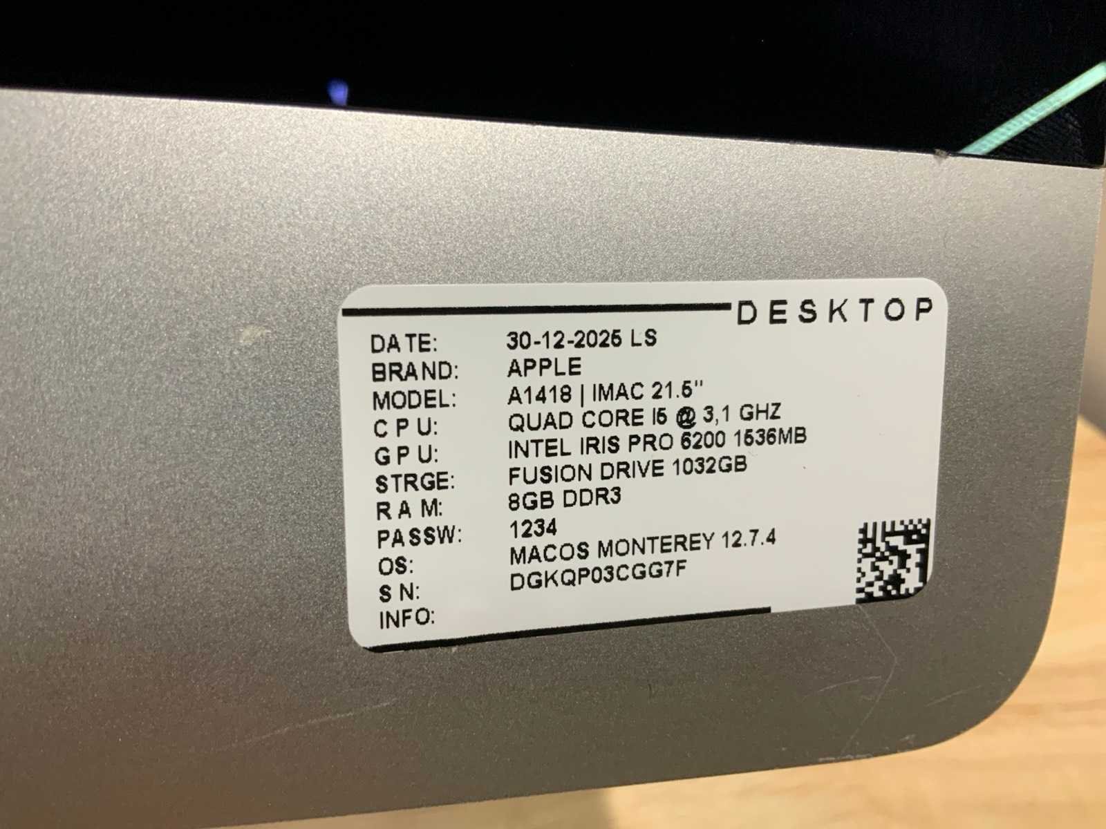 Merk: Apple Type: iMAC A1418 Processor type: Intel core i5 Processorsnelheid Ghz: 3,1 Besturingssysteem: Monterey Type datadrager: Fusion RAM Geheugen: 8GB RAM Geheugen Type: DDR3 Opslagcapaciteit: 1032GB Type videokaart: Intel hd graphics 6200 Bluetooth: true Wifi: true Ethernet: 1 USB poorten: 4 Zonder voedingskabel: true Beelddiagonaal: 21.5''