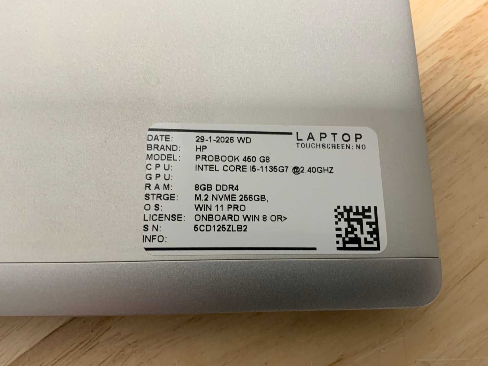 Merk: Hp Type: ProBook 450 G8 Processor type: Intel core i5-1135G7 Processorsnelheid Ghz: 2,40 RAM Geheugen: 8GB RAM Geheugen Type: DDR4 Totale opslagcapaciteit: 256GB Type datadrager: M.2 SSD Aantal datadragers: 1 Besturingssysteem: Windows 11 Pro Licentie: Onboard Zonder adapter: true Wifi: true Bluetooth: true Ethernet: 1 USB-Type: USB-A & USB-C USB poorten: 4 Card reader: true Koptelefoon aansluiting: true Webcam: true Toetsenbord: QWERTY HDMI: 1