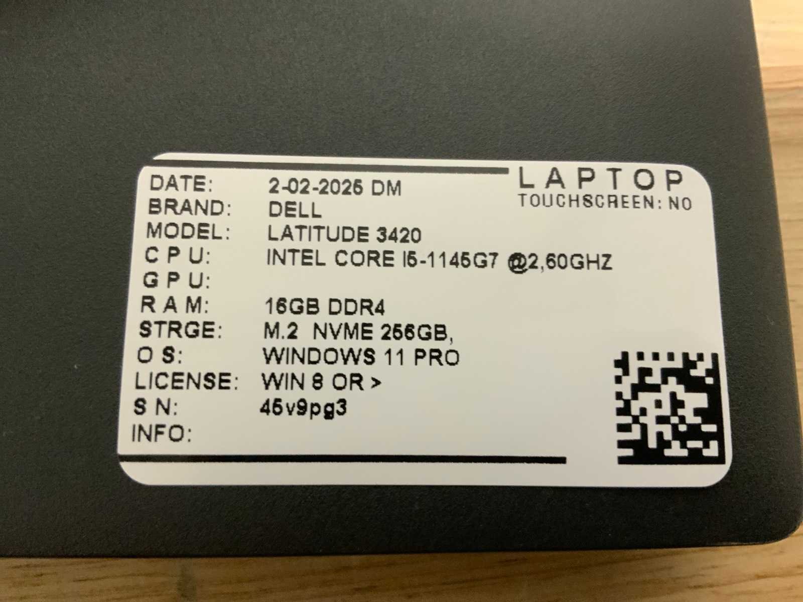 Merk: Dell Type: Latitude 3420(i5-gen11) Processor type: Intel core i5-1145G7 Processorsnelheid Ghz: 2,60 RAM Geheugen: 16GB RAM Geheugen Type: Ddr4 Totale opslagcapaciteit: 256GB Type datadrager: Nvme Aantal datadragers: 1 Besturingssysteem: Windows 11 pro Licentie: Onboard Zonder adapter: true Wifi: true Bluetooth: true Ethernet: 1 USB-Type: Usb-C/Usb-A USB poorten: 4 Card reader: true Koptelefoon aansluiting: true Webcam: true Toetsenbord: Qwertz HDMI: 1