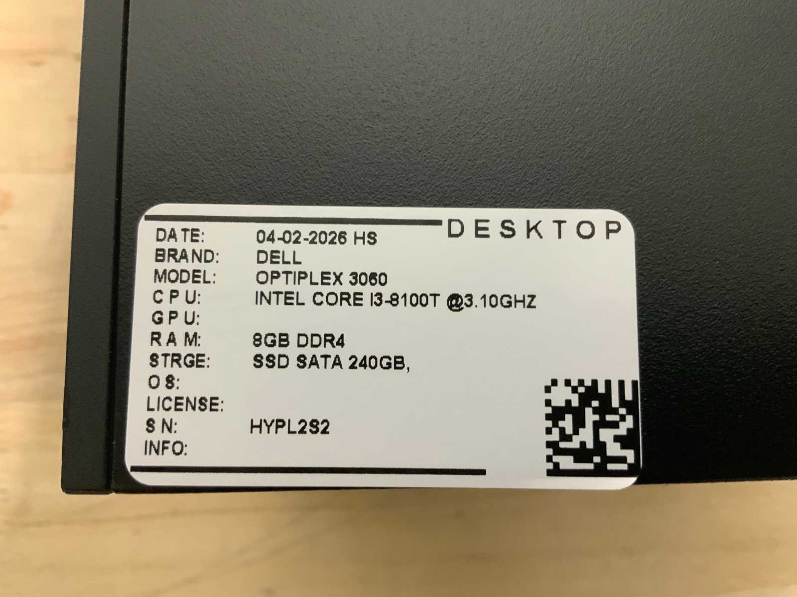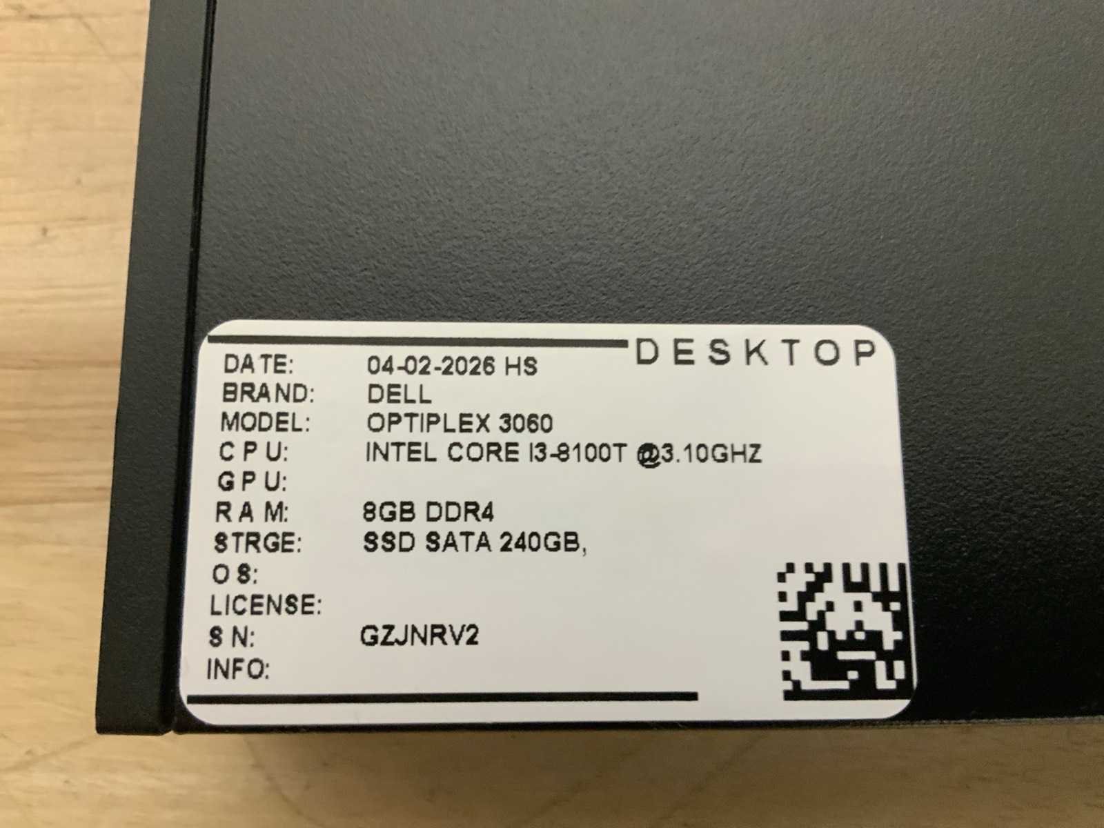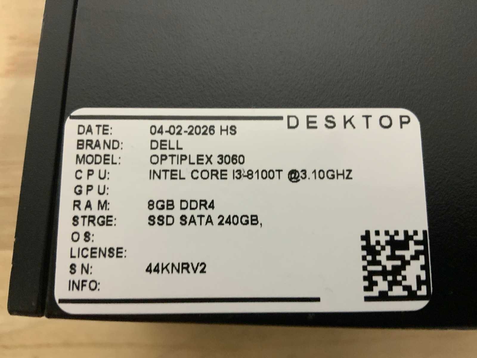 Merk: Dell Type: Optiplex 3060 micro Processor type: Intel core i3-8100T Processorsnelheid Ghz: 3,10 Besturingssysteem: Nvt Type datadrager: Ssd RAM Geheugen: 8GB RAM Geheugen Type: Ddr4 Opslagcapaciteit: 240GB Displaypoort: 1 HDMI: 1 Ethernet: 1 USB poorten: 6 Zonder voedingskabel: true