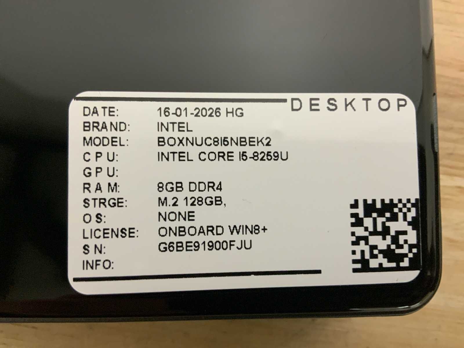 Merk: Intel Type: BOXNUC8I5NBEK2 Processor type: Intel core i5-8259U Processorsnelheid Ghz: 2,3 Besturingssysteem: None Type datadrager: M2 RAM Geheugen: 8GB RAM Geheugen Type: DDR4 Opslagcapaciteit: 128GB Bluetooth: true HDMI: 1 Wifi: true USB poorten: 5 Zonder voedingskabel: true