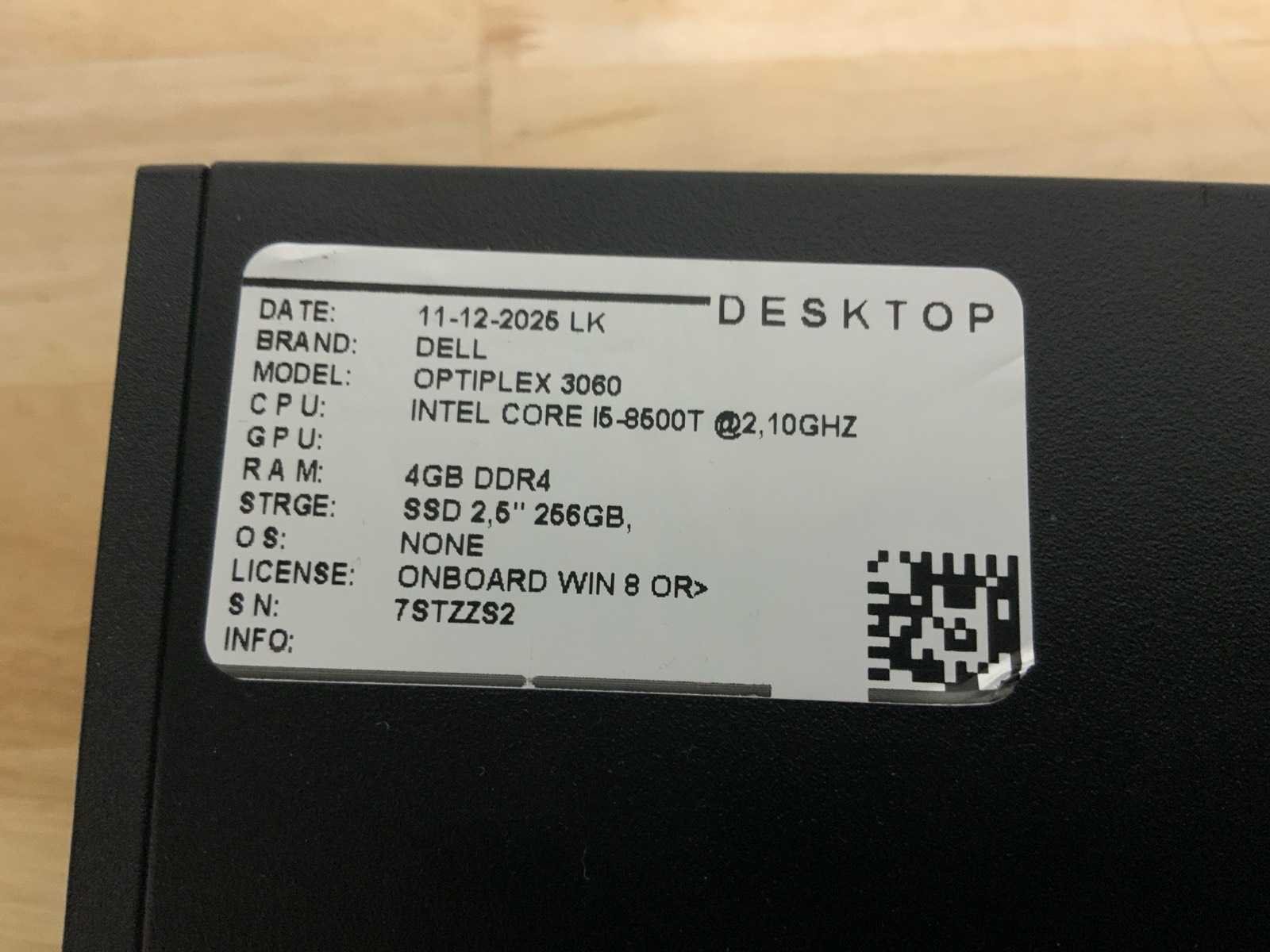 Merk: Dell Type: Optiplex 3060 micro Processor type: Intel core i3-8100T Processorsnelheid Ghz: 3,10 Besturingssysteem: Nvt Type datadrager: Ssd RAM Geheugen: 8GB RAM Geheugen Type: Ddr4 Opslagcapaciteit: 256GB Displaypoort: 1 HDMI: 1 Ethernet: 1 USB poorten: 6 Zonder voedingskabel: true