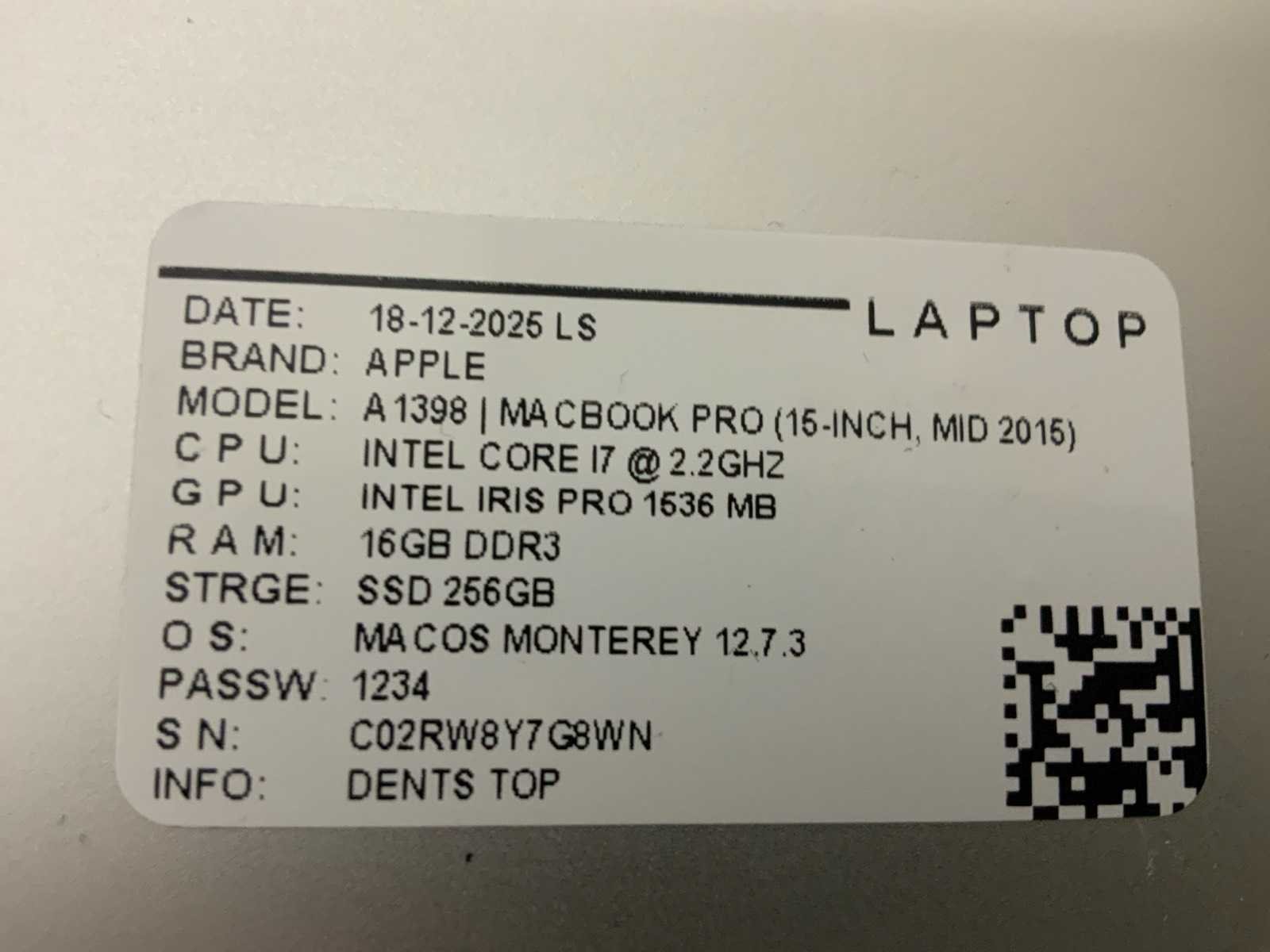 Merk: Apple Type: MacBook Pro A1398(i7) Processor type: Intel core i7 RAM Geheugen: 16GB RAM Geheugen Type: DDR3 Totale opslagcapaciteit: 256GB Type datadrager: M.2 SSD Aantal datadragers: 1 Type videokaart: Intel iris pro Besturingssysteem: Monterey Zonder adapter: true Beelddiagonaal: 15.4'' Wifi: true Bluetooth: true USB-Type: USB-A USB poorten: 2 Thunderbolt: true Koptelefoon aansluiting: true Webcam: true Toetsenbord: QWERTY Refurbished: true HDMI: 1