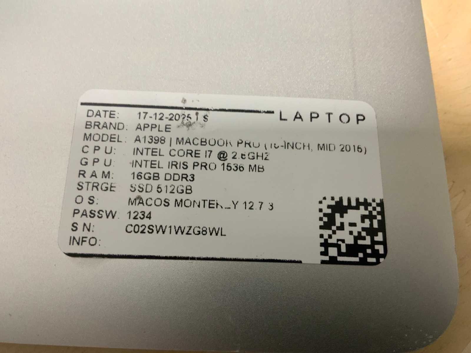 Merk: Apple Type: MacBook Pro A1398(i7) Processor type: Intel core i7 RAM Geheugen: 16GB RAM Geheugen Type: DDR3 Totale opslagcapaciteit: 512GB Type datadrager: M.2 SSD Aantal datadragers: 1 Type videokaart: Inteliris pro Besturingssysteem: Monterey/big sur Zonder adapter: true Beelddiagonaal: 15.4'' Wifi: true Bluetooth: true USB-Type: USB-A USB poorten: 2 Thunderbolt: true Koptelefoon aansluiting: true Webcam: true Toetsenbord: QWERTY Refurbished: true HDMI: 1