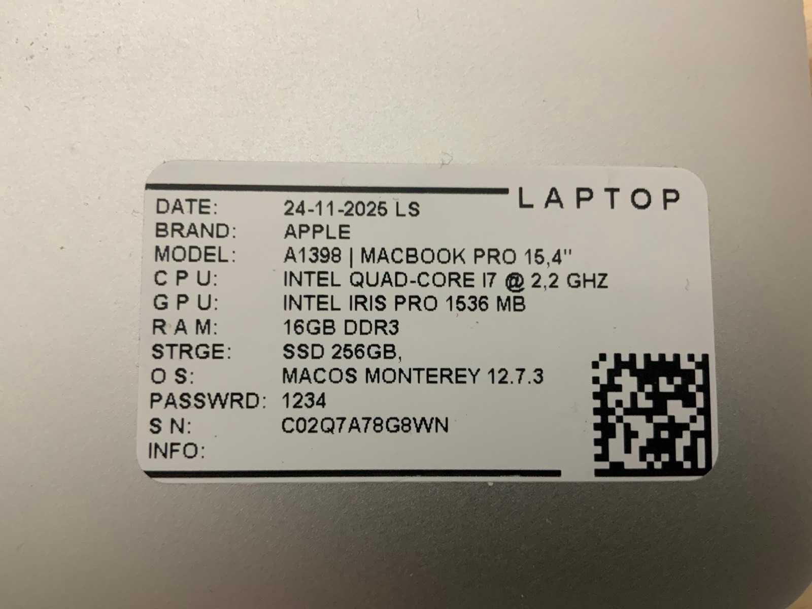 Merk: Apple Type: MacBook Pro A1398(i7) Processor type: Intel core i7 RAM Geheugen Type: DDR3 Totale opslagcapaciteit: 256GB Type datadrager: M.2 SSD Aantal datadragers: 1 Type videokaart: Inteliris pro Besturingssysteem: Monterey/big sur Zonder adapter: true Beelddiagonaal: 15.4'' Wifi: true Bluetooth: true USB-Type: USB-A USB poorten: 2 Thunderbolt: true Koptelefoon aansluiting: true Webcam: true Toetsenbord: QWERTY Refurbished: true HDMI: 1