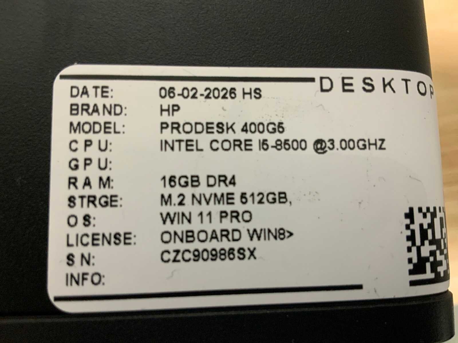 Merk: Hp Type: ProDesk 600 G5 Sff Processor type: Intel core i5-8500 Processorsnelheid Ghz: 3.0 Besturingssysteem: Windows 11 Pro Type datadrager: NvMe SSD RAM Geheugen: 16GB RAM Geheugen Type: DDR4 Opslagcapaciteit: 512GB Displaypoort: 2 VGA: 1 Ethernet: 1 USB poorten: 11 Zonder voedingskabel: true
