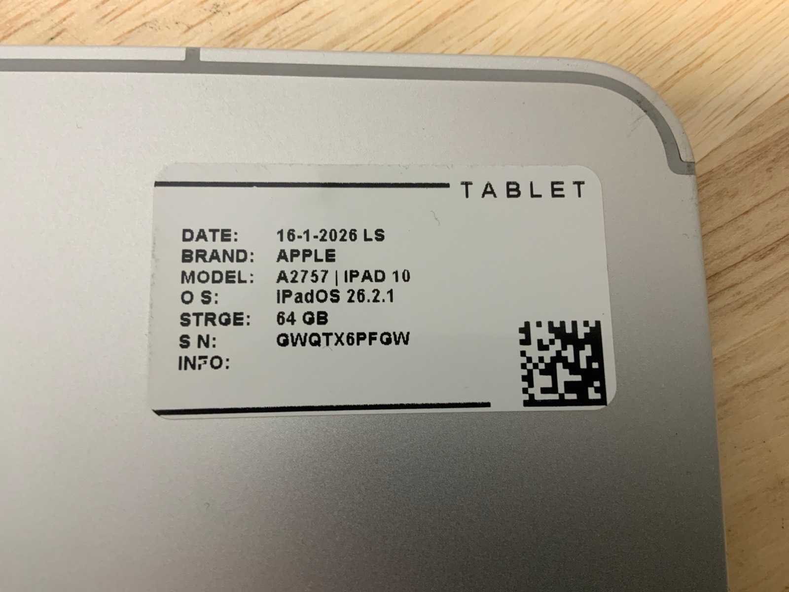Getest; exlusief oplader; Merk: Apple Type: iPad 10 |A2757 Opslagcapaciteit: 64GB Frontcamera: true Camera: true Integrated microphone: true Wifi: true Bluetooth: true Touchscreen: true Zonder oplader: true