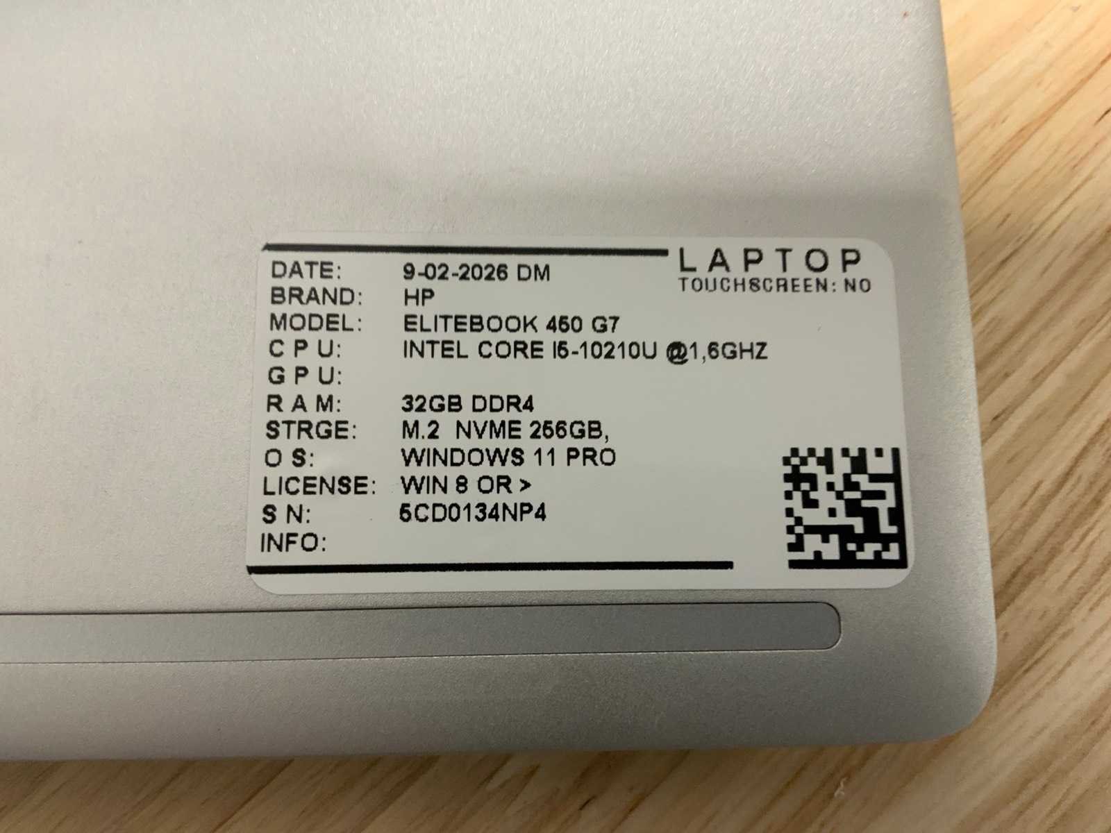 Merk: Hp Type: ProBook 450 G7 Processor type: Intel core i5-10210U Processorsnelheid Ghz: 1,6 RAM Geheugen Type: DDR4 Totale opslagcapaciteit: 256GB Type datadrager: M.2 SSD Aantal datadragers: 1 Besturingssysteem: Windows 11 Pro Licentie: Onboard Zonder adapter: true Wifi: true Bluetooth: true Ethernet: 1 USB-Type: USB-A & USB-C USB poorten: 4 Card reader: true Koptelefoon aansluiting: true Webcam: true Toetsenbord: QWERTY HDMI: 1