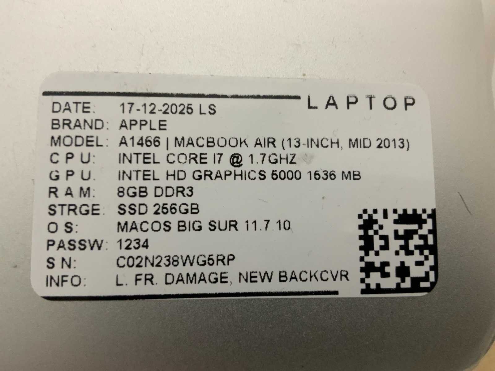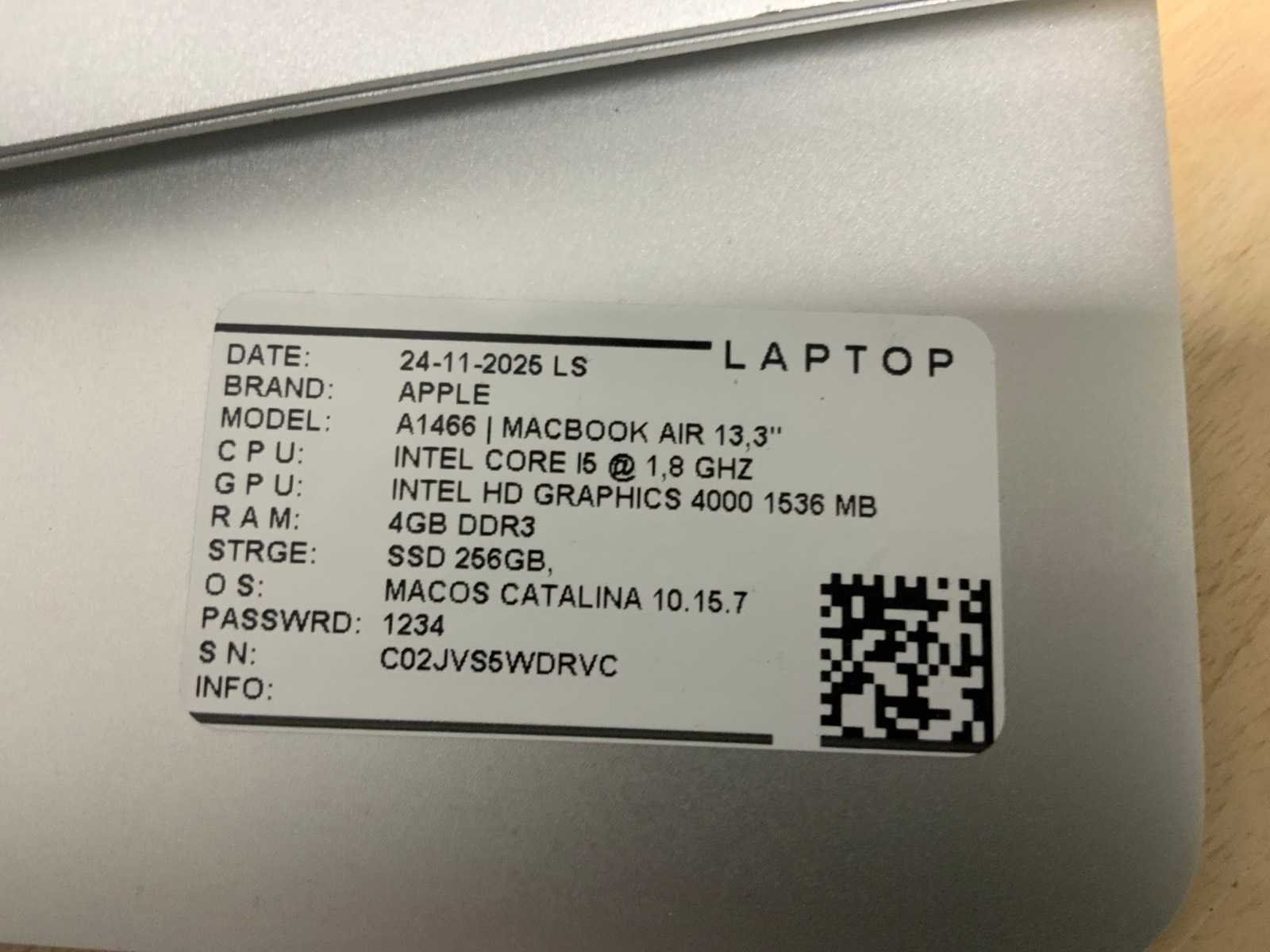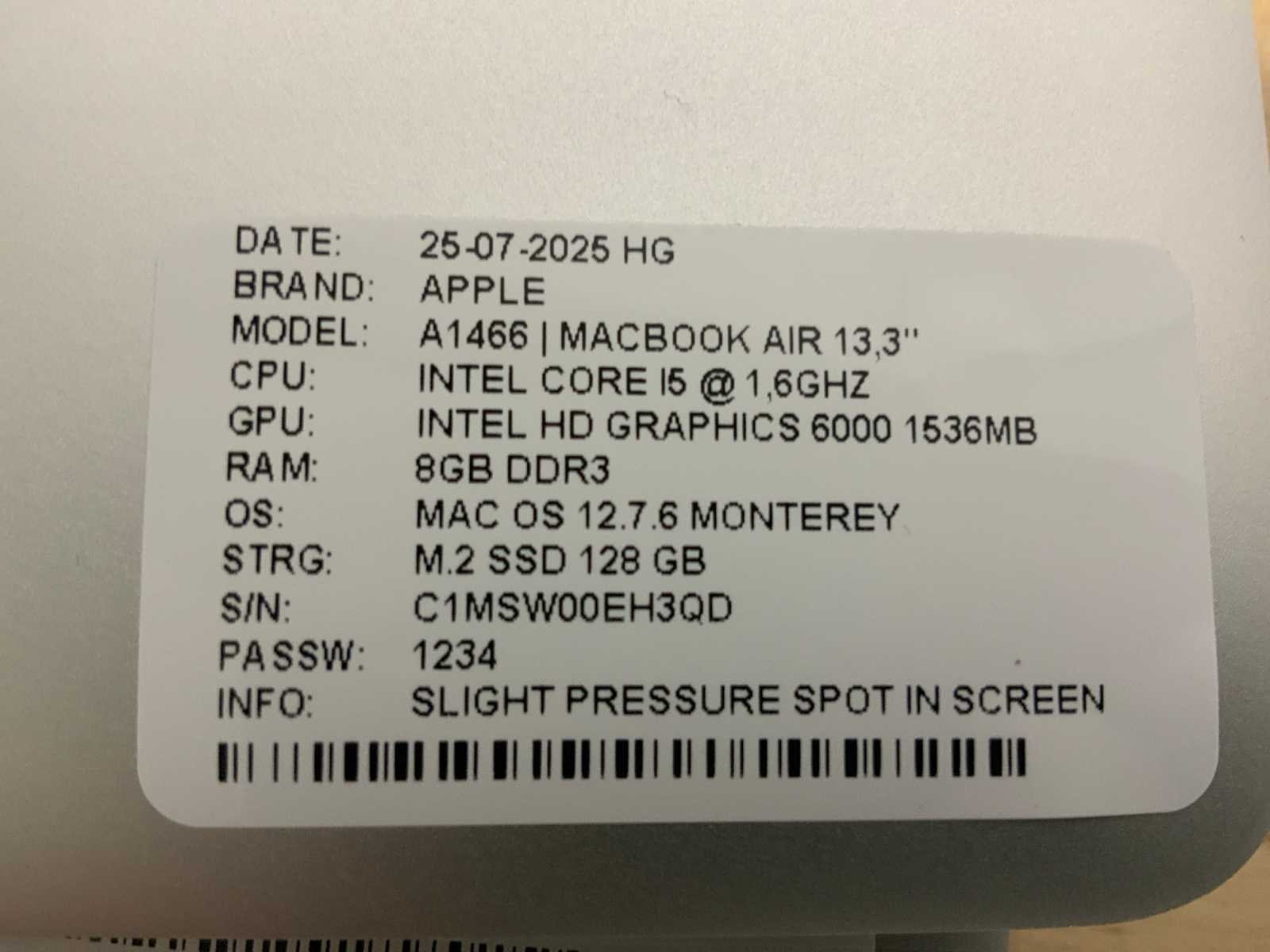 Merk: Apple Type: MACBook Air A1466 Processor type: Intel core i5/i7 RAM Geheugen Type: DDR3 Type datadrager: M.2 NVMe Aantal datadragers: 1 Type videokaart: Intel HD Graphics 4000/5000 Besturingssysteem: Monterey Zonder adapter: true Beelddiagonaal: 13'' Wifi: true Bluetooth: true USB-Type: USB-A USB poorten: 2 Card reader: true Thunderbolt: true Koptelefoon aansluiting: true Webcam: true Toetsenbord: QWERTY