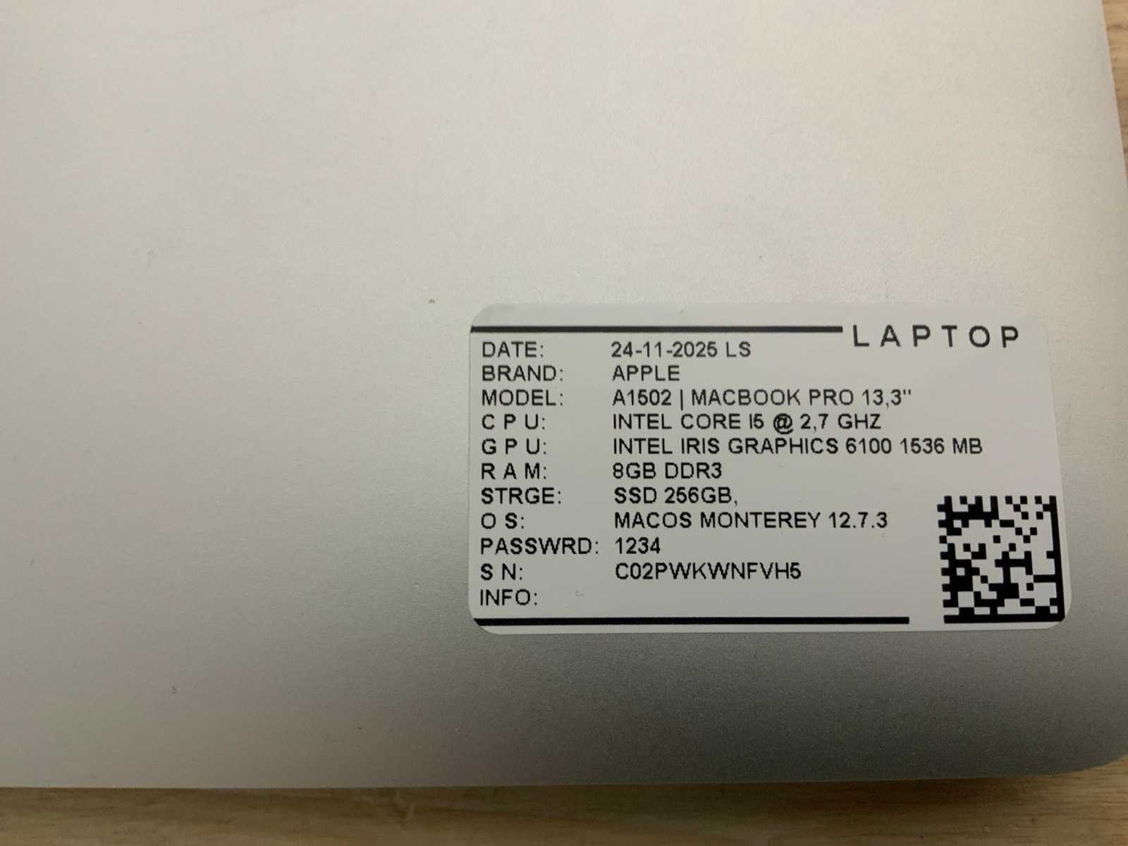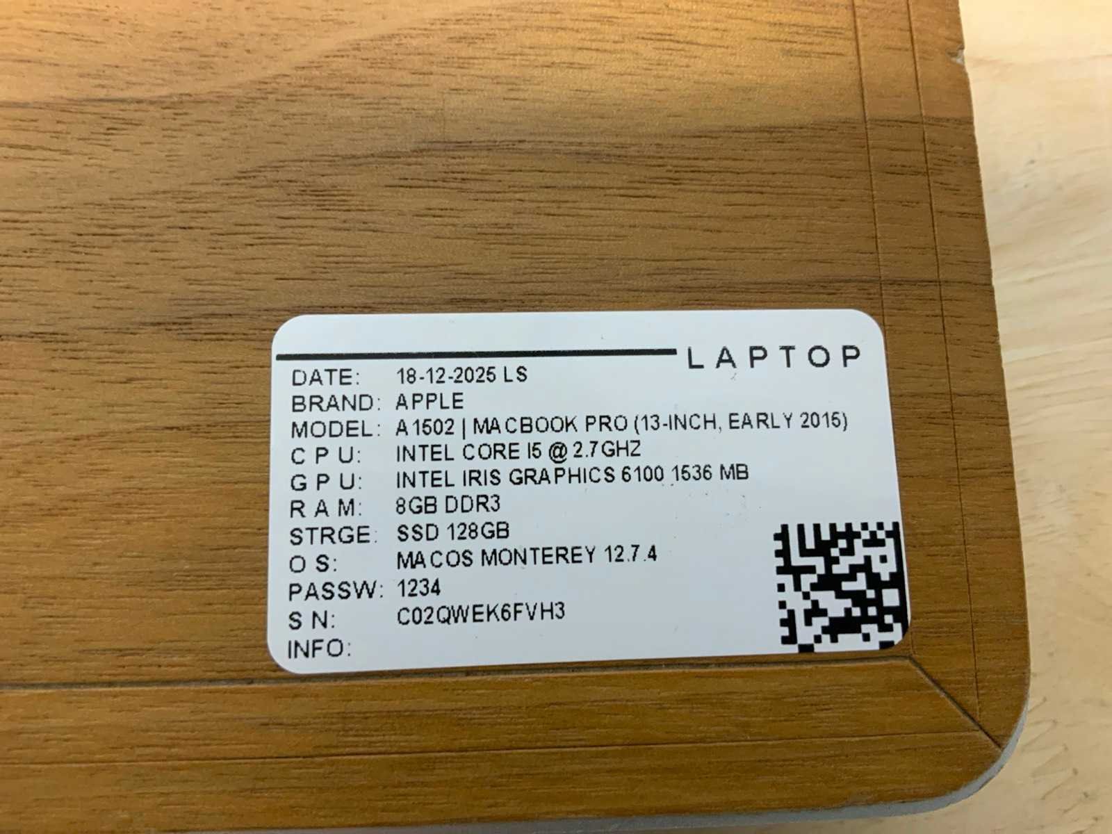 Merk: Apple Type: MACBook Pro A1502 Processor type: Intel core i5 RAM Geheugen: 8GB RAM Geheugen Type: DDR3 Type datadrager: SSD Aantal datadragers: 1 Type videokaart: Intel Iris Graphics Besturingssysteem: Big sur/ monterey Licentie: Nvt Zonder adapter: true Beelddiagonaal: 13'' Wifi: true Bluetooth: true USB-Type: USB-A USB poorten: 2 Thunderbolt: true HDMI: 1