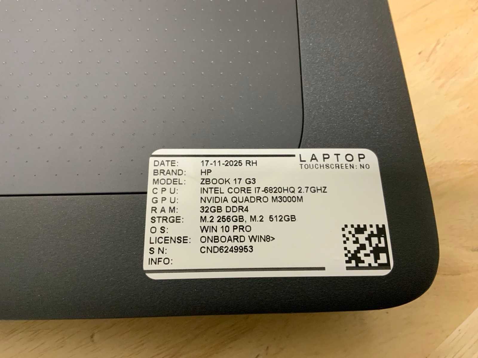 Merk: Hp Type: ZBook 17 G3(i7) Processor type: Intel core i7-6820HQ Processorsnelheid Ghz: 2,7 RAM Geheugen: 32GB RAM Geheugen Type: DDR4 Totale opslagcapaciteit: 768GB Type datadrager: M-SATA Aantal datadragers: 2 Type videokaart: Nvidia Quadro M3000M Besturingssysteem: Windows 10 Pro Licentie: Onboard Zonder adapter: true Beelddiagonaal: 17'' Wifi: true Bluetooth: true Ethernet: 1 USB-Type: USB-A &. USB-C USB poorten: 6 Card reader: true Koptelefoon aansluiting: true Webcam: true Toetsenbord: QWERTY HDMI: 1