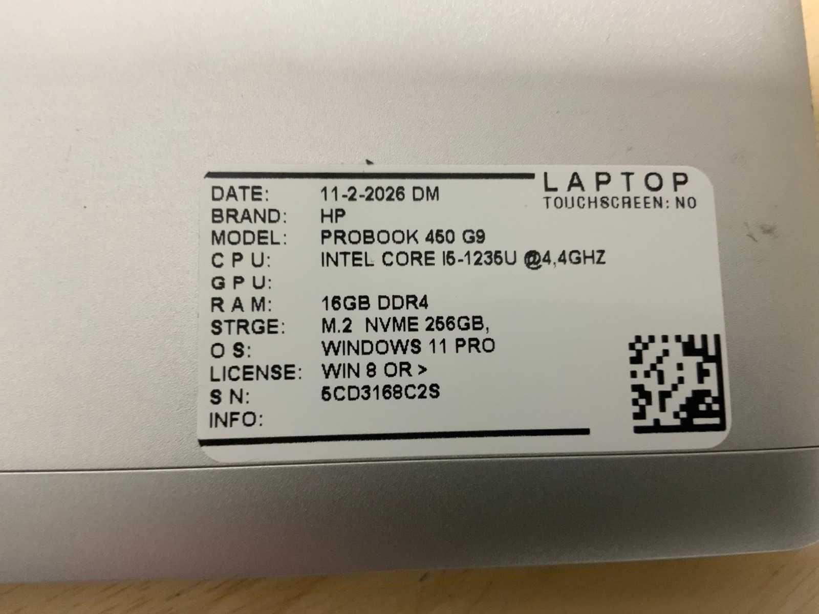Merk: Hp Type: ProBook 450 G9(i5-gen12) Processor type: Intel core i5-1235U Processorsnelheid Ghz: 4,4 RAM Geheugen: 16GB RAM Geheugen Type: DDR4 Totale opslagcapaciteit: 256GB Type datadrager: M.2 SSD Aantal datadragers: 1 Besturingssysteem: Windows 11 Pro Licentie: Onboard Zonder adapter: true Wifi: true Bluetooth: true Ethernet: 1 USB-Type: USB-A & USB-C USB poorten: 4 Card reader: true Koptelefoon aansluiting: true Webcam: true Toetsenbord: QWERTY HDMI: 1