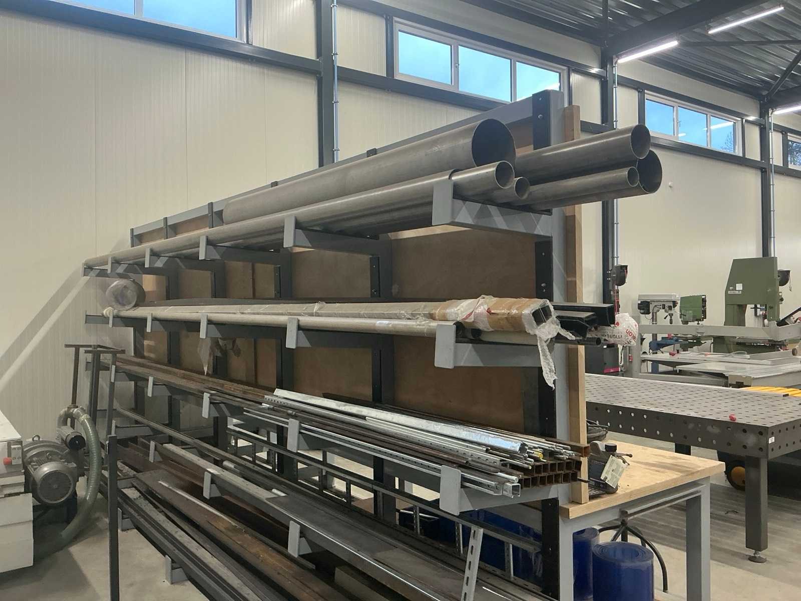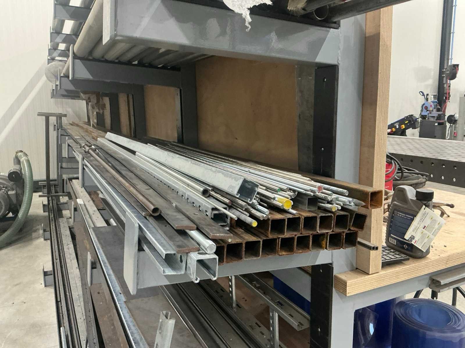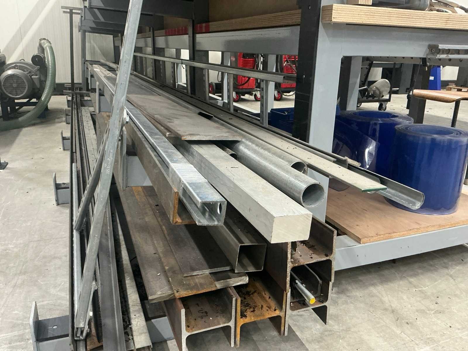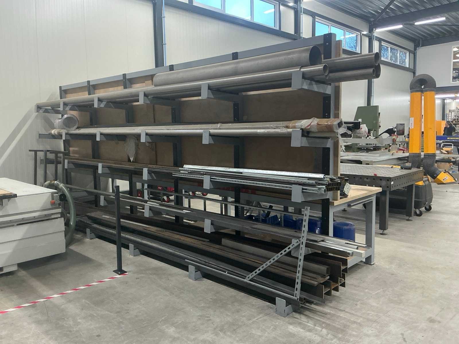 Met uitzondering van genummerde kavels. Voorzien van houten werkblad (4 cm), Iiyama monitor met mini pc en toetsenbord. Aan de achterzijde voorzien van 6-delige draagarmstelling met inhoud staal, aluminium en rvs. De werkbank is in één geheel gelast en zal als zodanig vervoerd moeten worden. Breedte: 1600mm Lengte: 6100mm Hoogte: 2500mm