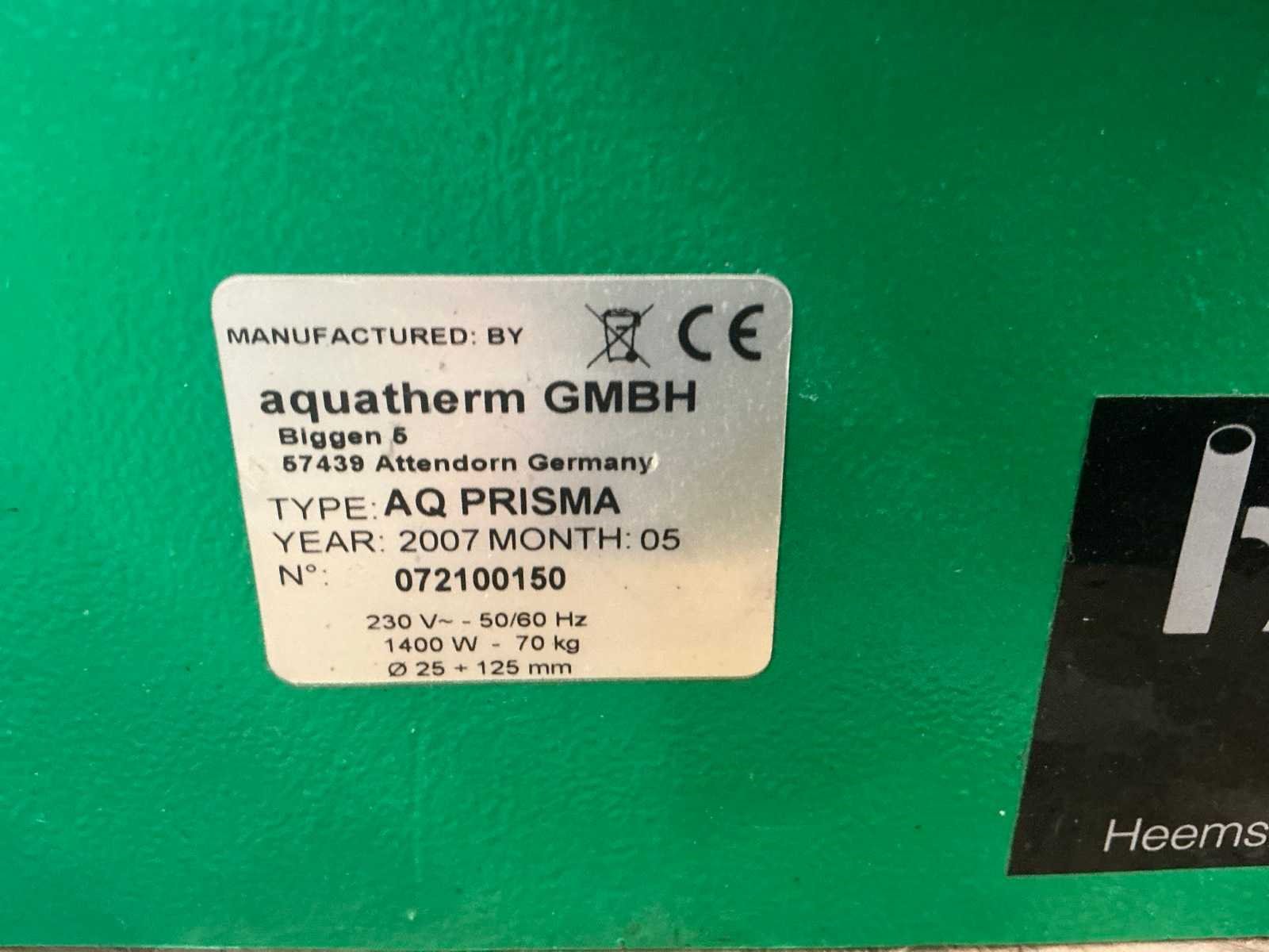 Inclusief Aquatherm handlasspiegel, lasbussen en verrijdbare transportkist Merk: Aquatherm Type: AQ Prisma Serienummer: 072100150 Aansluiting: 230V Machinegewicht: 70kg