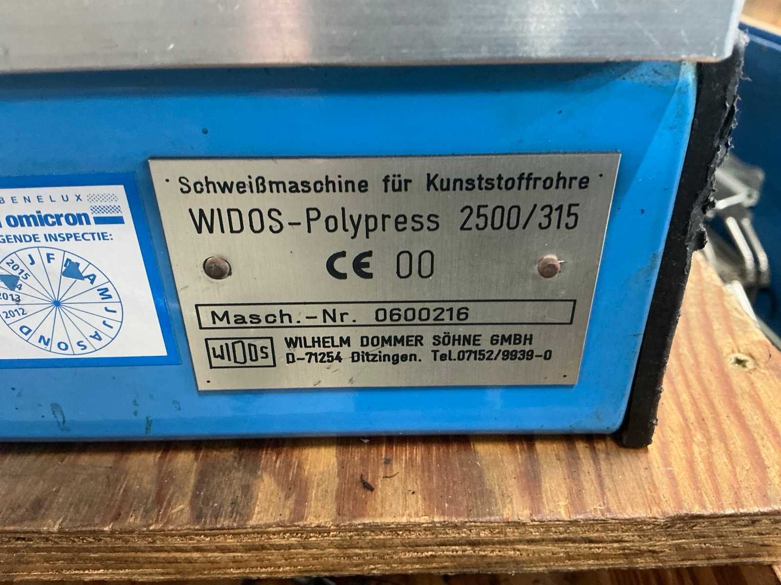 D50-d315 met elektrische schaaf, verwarmingselement en set span-inzetten Merk: Widos Type: 2500/315 Serienummer: 0600216 Aansluiting: 230V