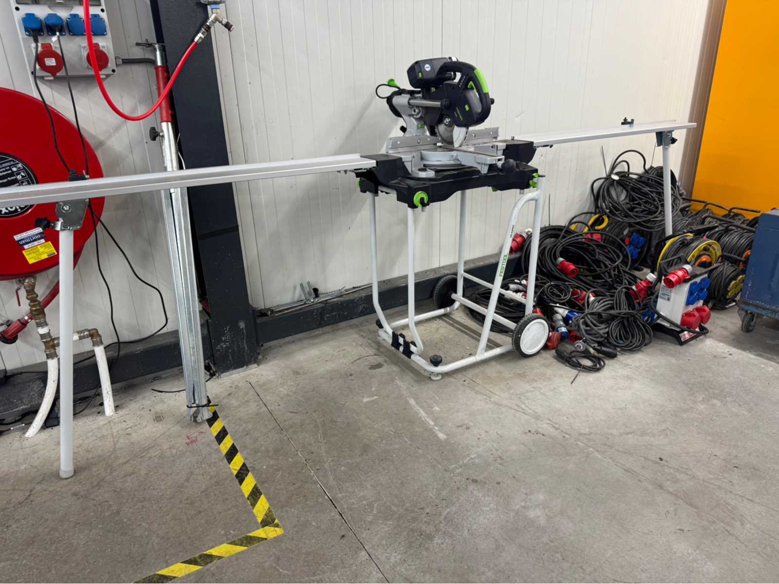 Inclusief: Festool UG-AD-KS60 verrijdbaar onderstel, Festool KA-UG-KS60 afkortaanslag links en rechts (klem van de rechteraanslag ontbreekt) en Festool zwaaihaak Merk: Festool Model: KS 60 E Spanning: 230V Diameter zaagblad: 216mm