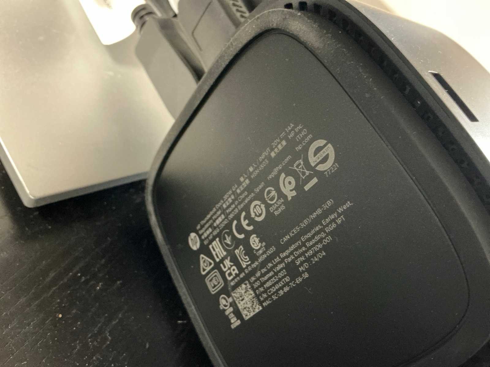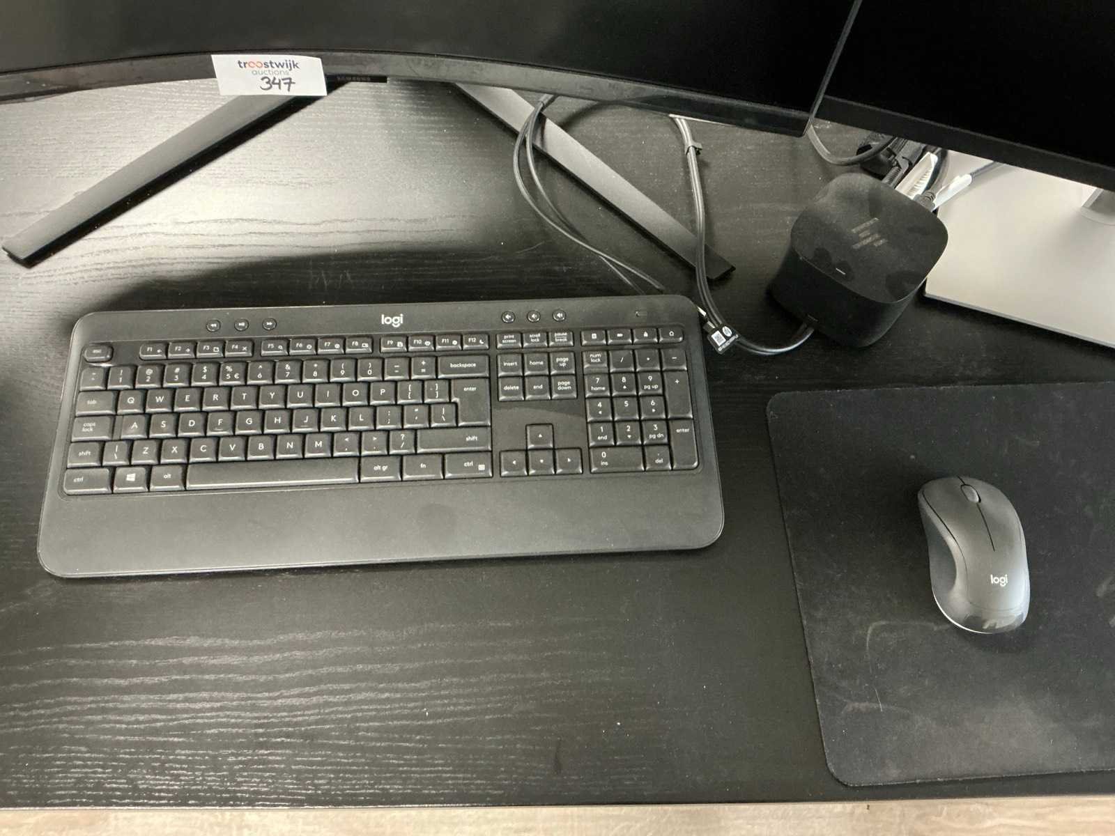 Bestaande uit HP thunderbolt dock G4 docking station, Logitech draadloos toetsenbord en muis, 2x HP E243 monitor en Samsung curved monitor
