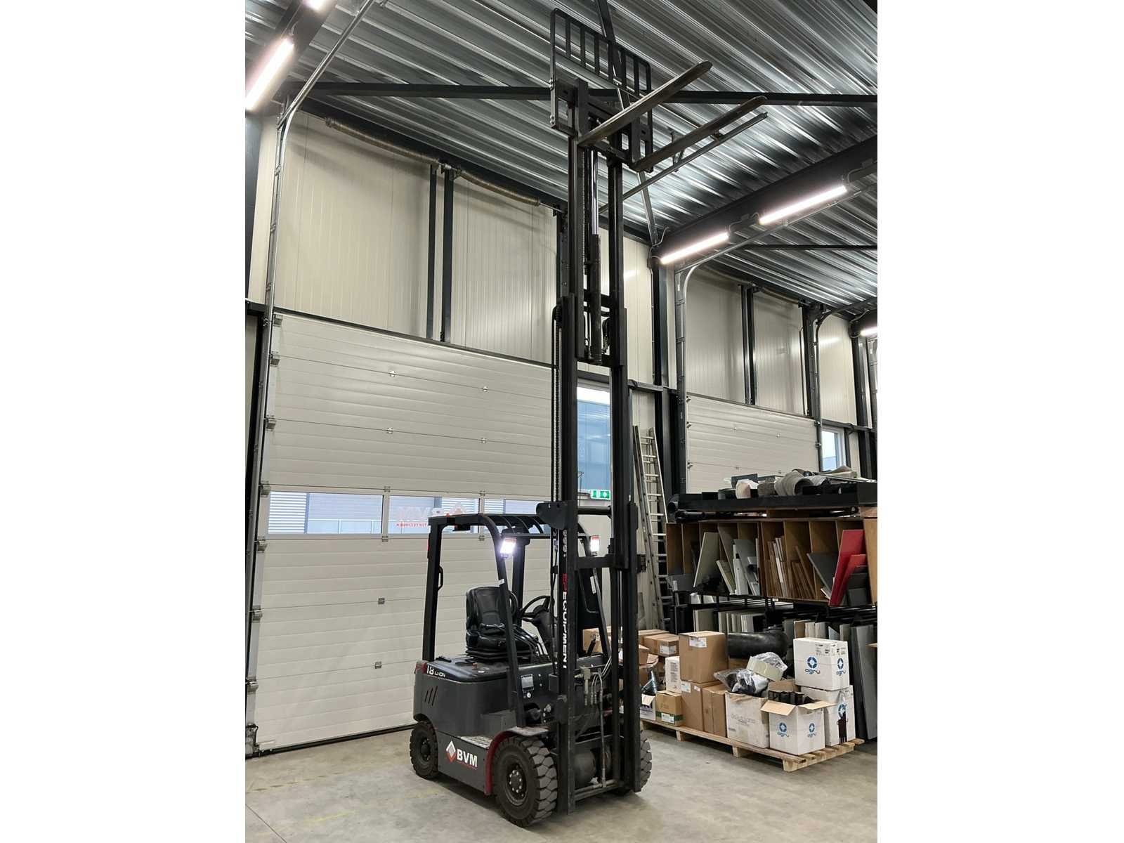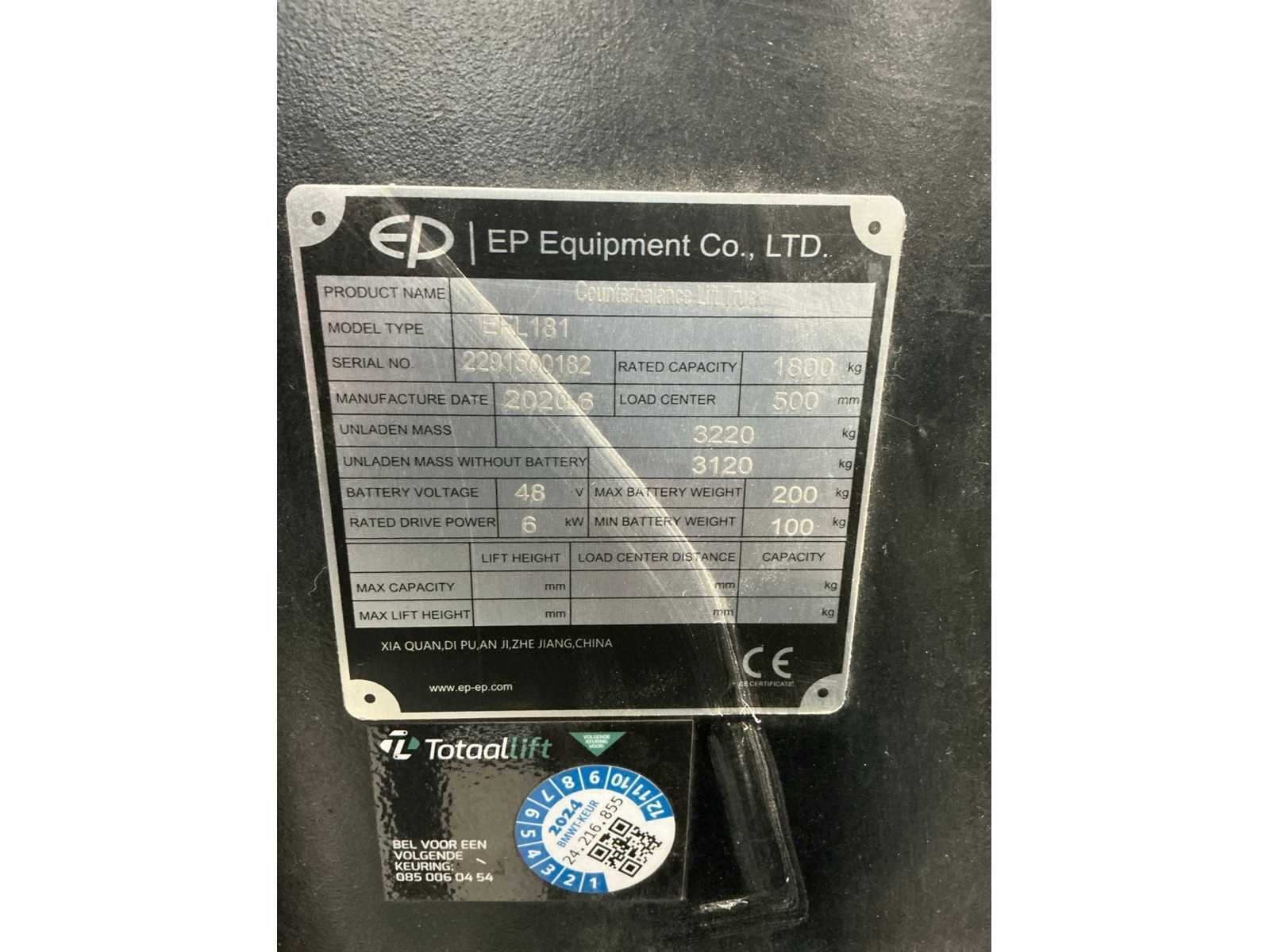 Urenstand loopt nog iets op Merk: EP Type: EFL181 Bouwjaar: 2020 Serienummer: 2291500182 Aantal wielen: 4 Afgelezen urenstand: 720 Free-lift: true Side-shift: true Triple mast: true Eigen gewicht: 3420kg Hefvermogen: 1800kg Lepellengte: 1200mm Max. hefhoogte: 4800mm Minimale doorrijhoogte: 2150mm