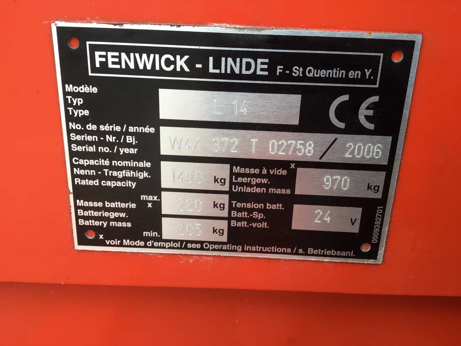 24 volt Merk: Linde Type: L14 Bouwjaar: 2006 Serienummer: W4X 372 T 02758 Hefvermogen: 1400kg Hefhoogte: 2500mm Lepellengte: 1150mm Afgelezen urenstand: 3462 Eigen gewicht: 425kg Totale afmeting L: 1900mm Totale afmeting Breedte: 820mm Totale afmeting Hoogte: 1670mm Accu lader: true