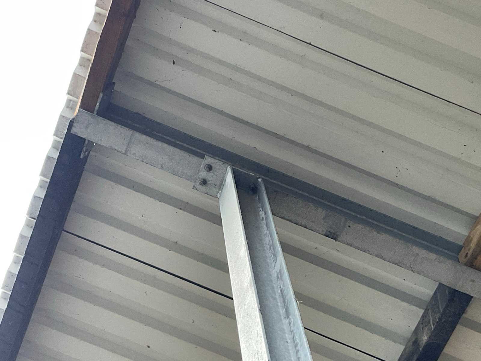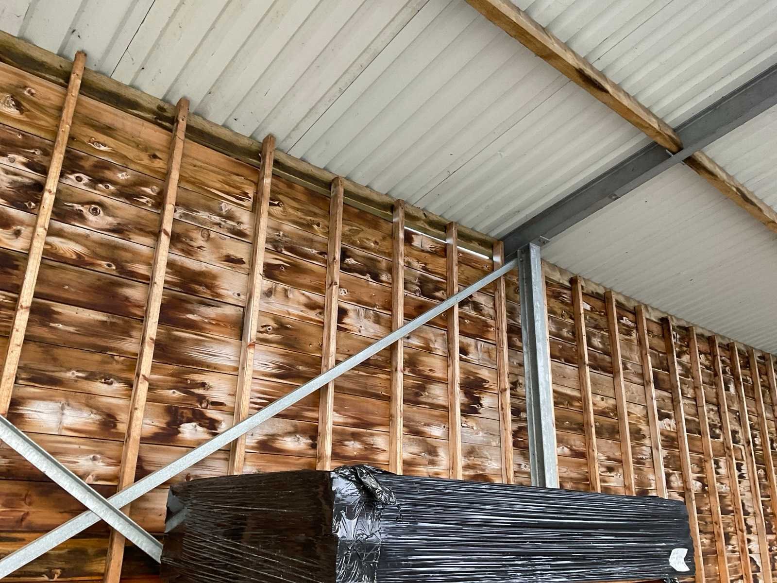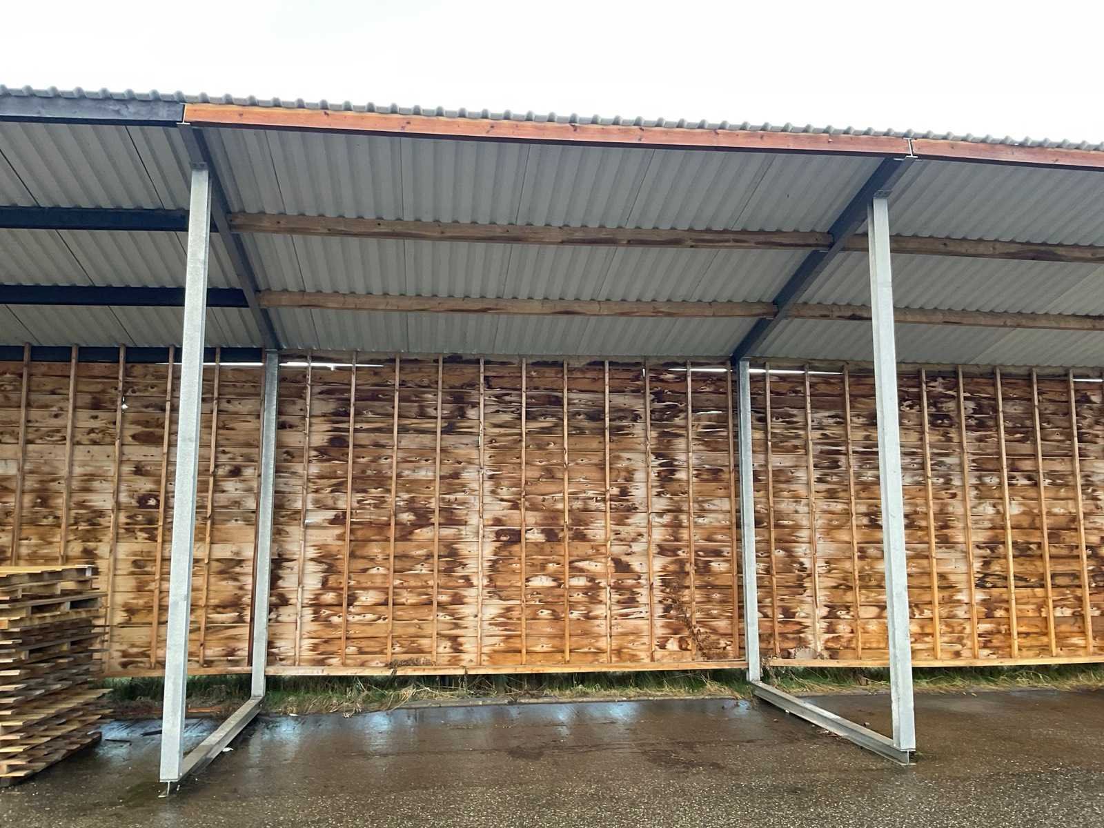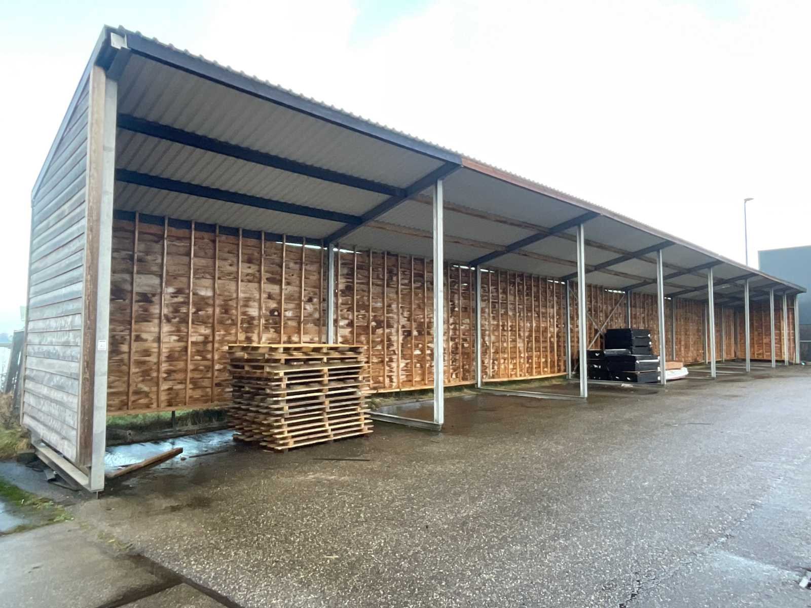 Bestaande uit: 9x gegalvaniseerde spanten, 24 houten liggers, hout planken achterwand, damwand dakplaten. Lengte: 4015 Breedte: 374 Hoogte: 500