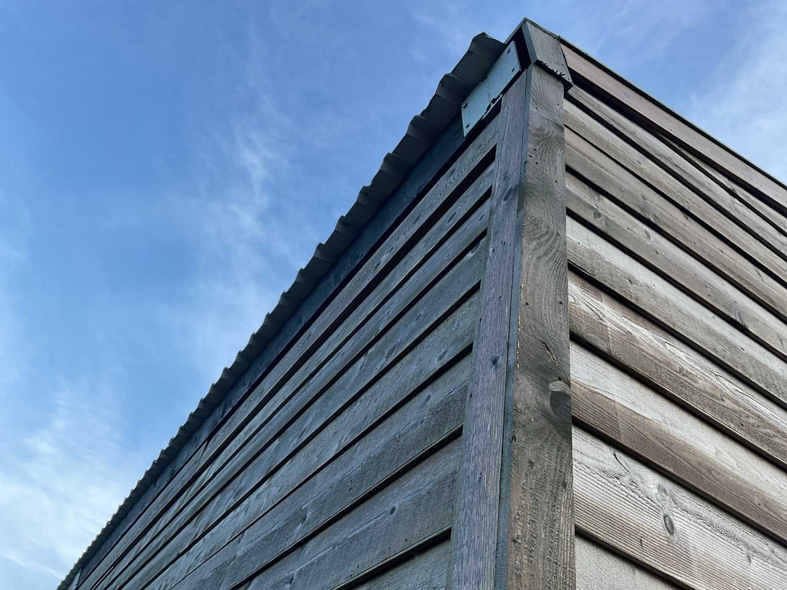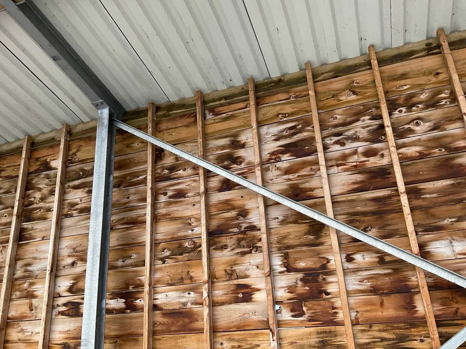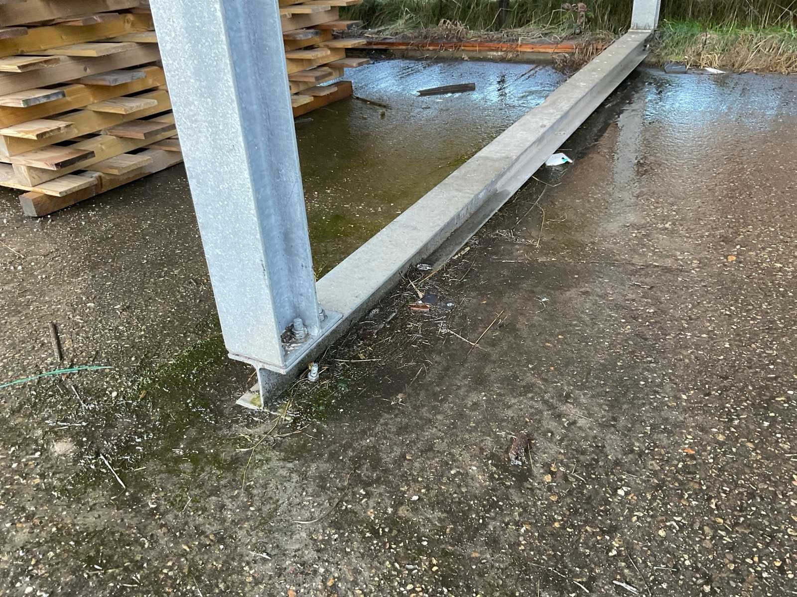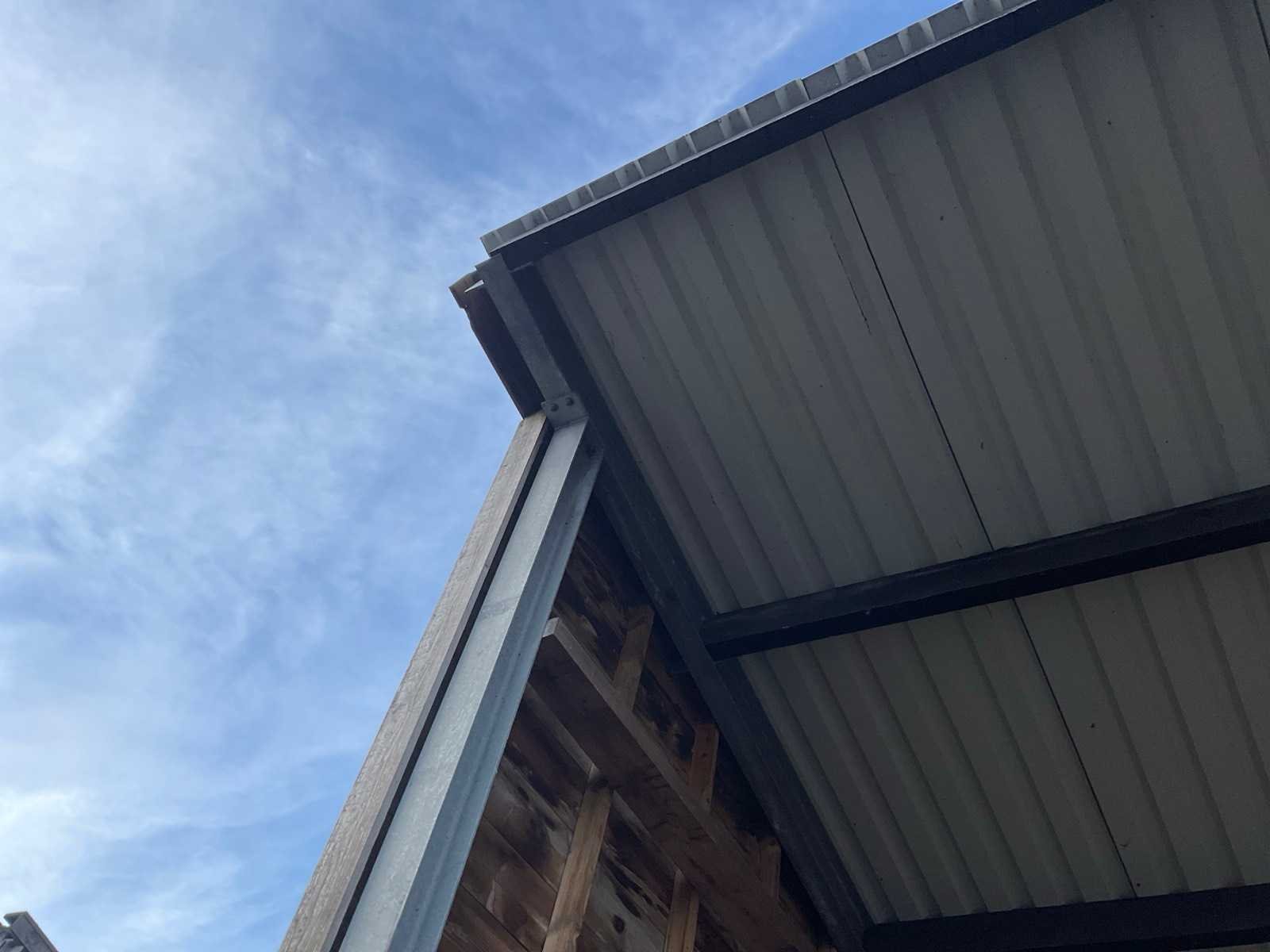 Bestaande uit: 9x gegalvaniseerde spanten, 24 houten liggers, hout planken achterwand, damwand dakplaten. Lengte: 4015 Breedte: 374 Hoogte: 500