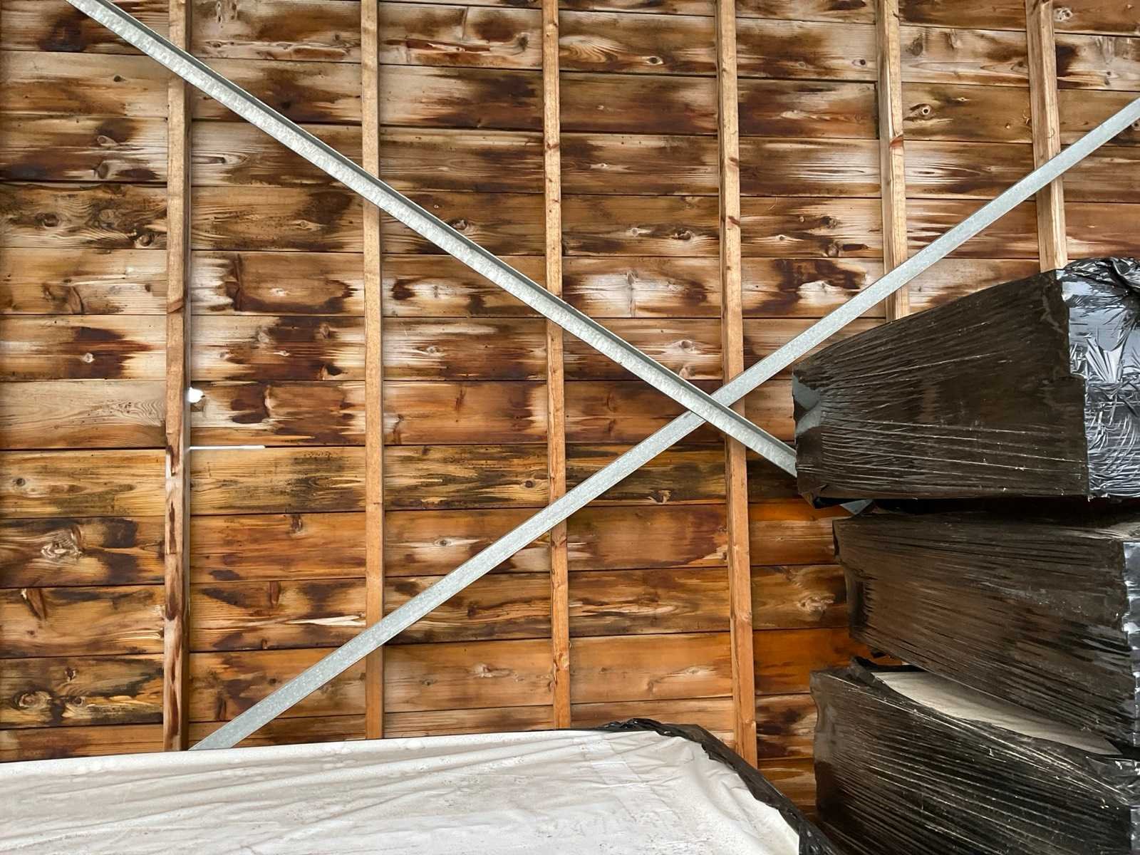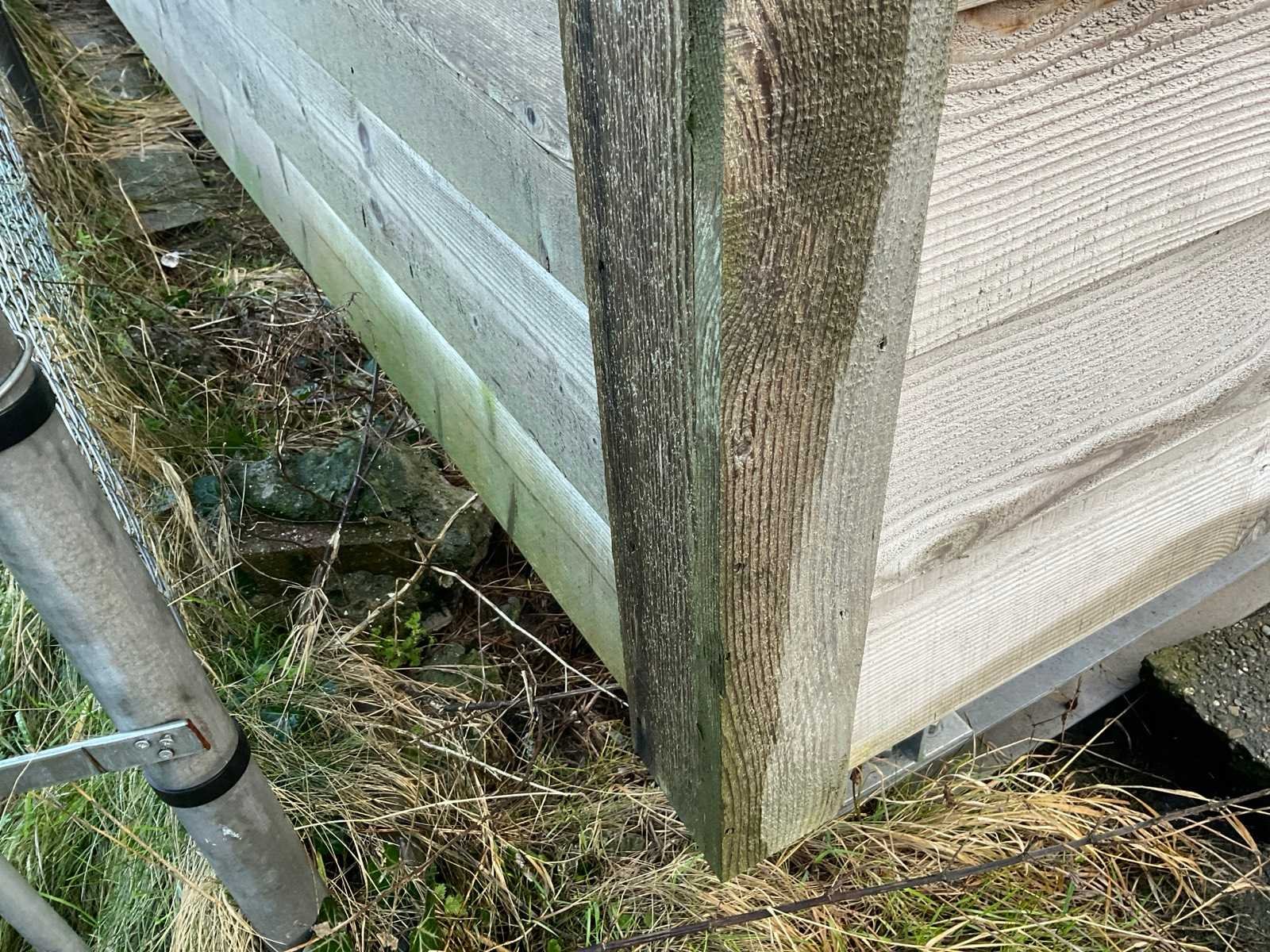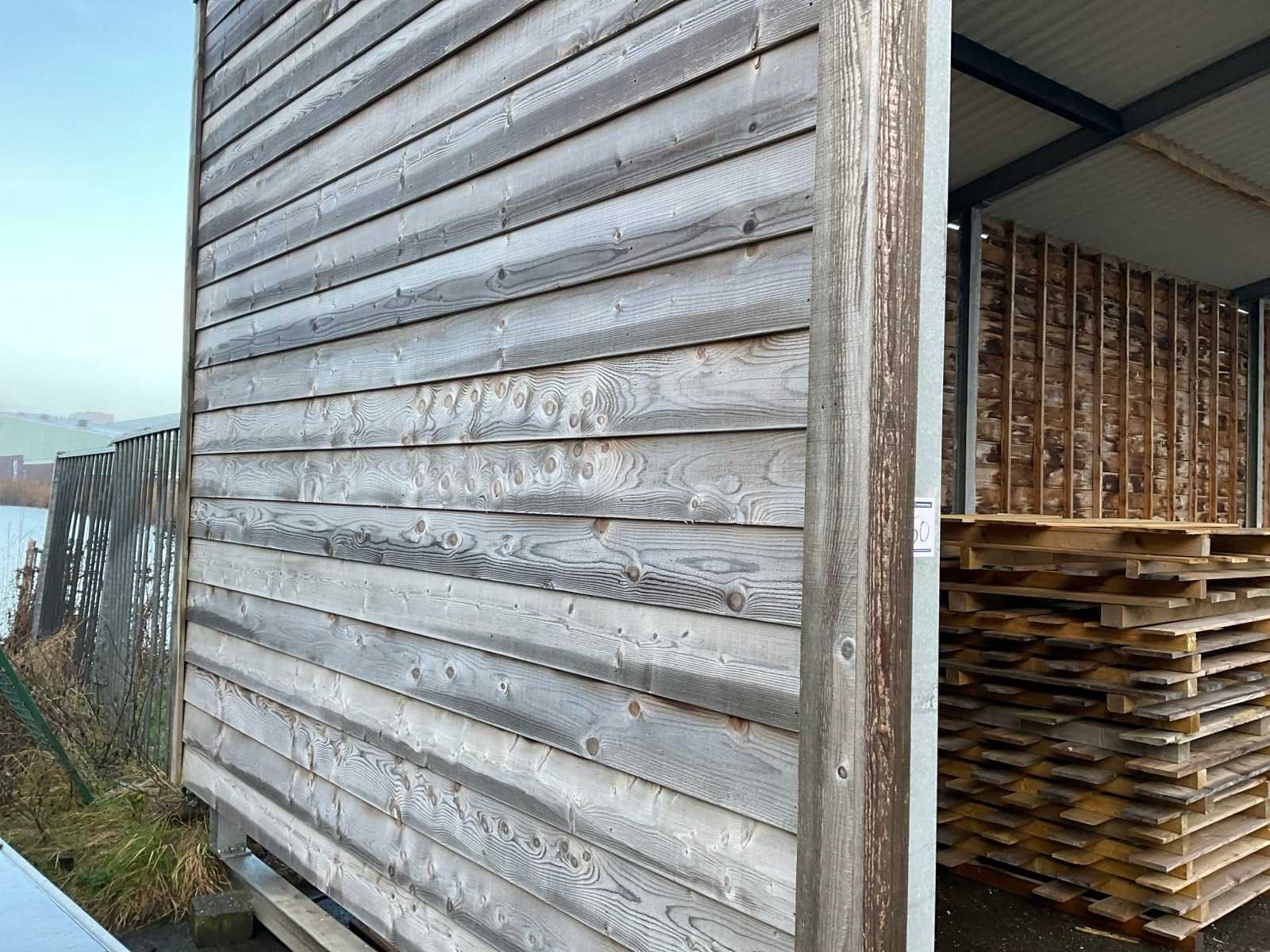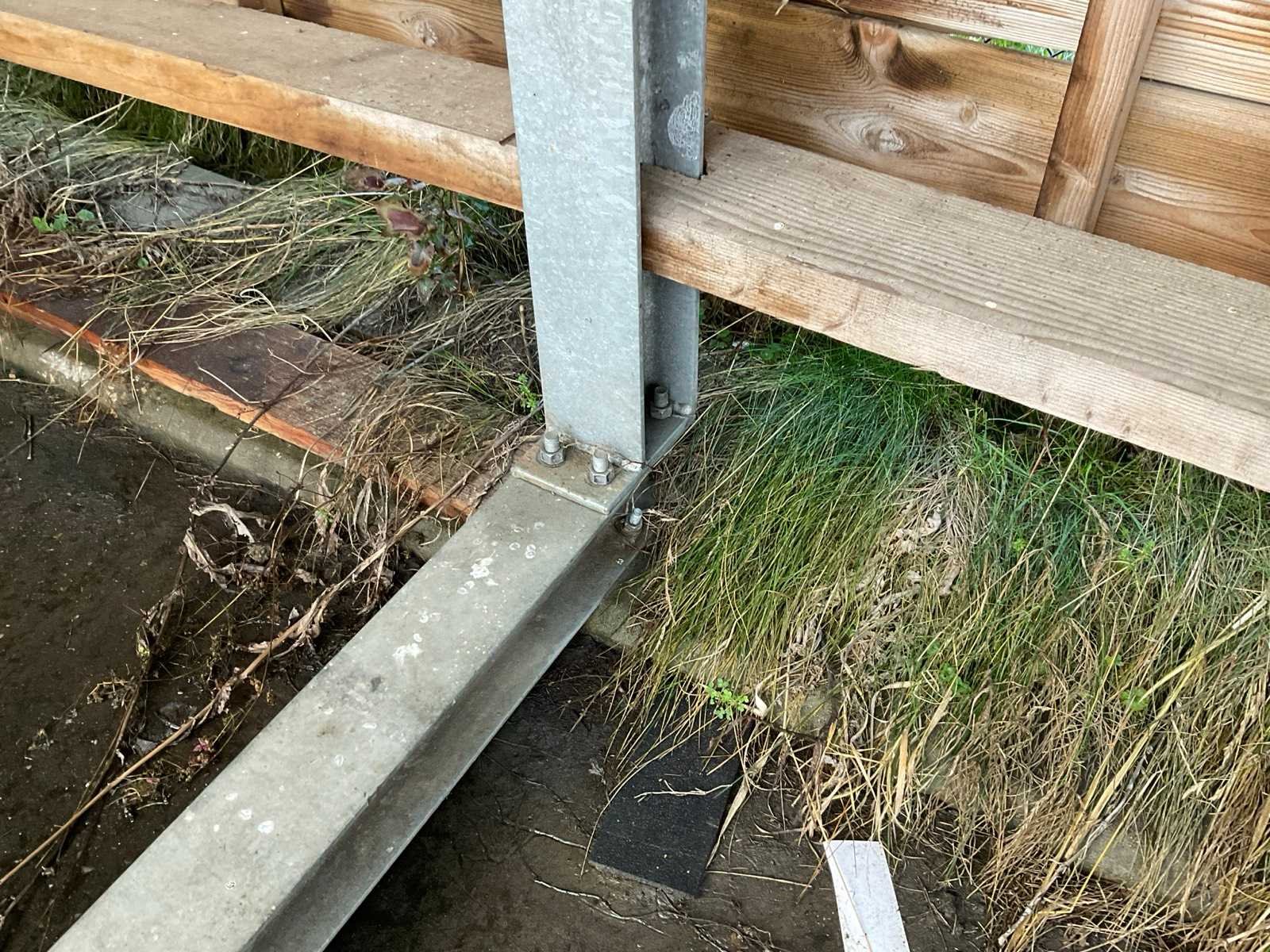 Bestaande uit: 9x gegalvaniseerde spanten, 24 houten liggers, hout planken achterwand, damwand dakplaten. Lengte: 4015 Breedte: 374 Hoogte: 500
