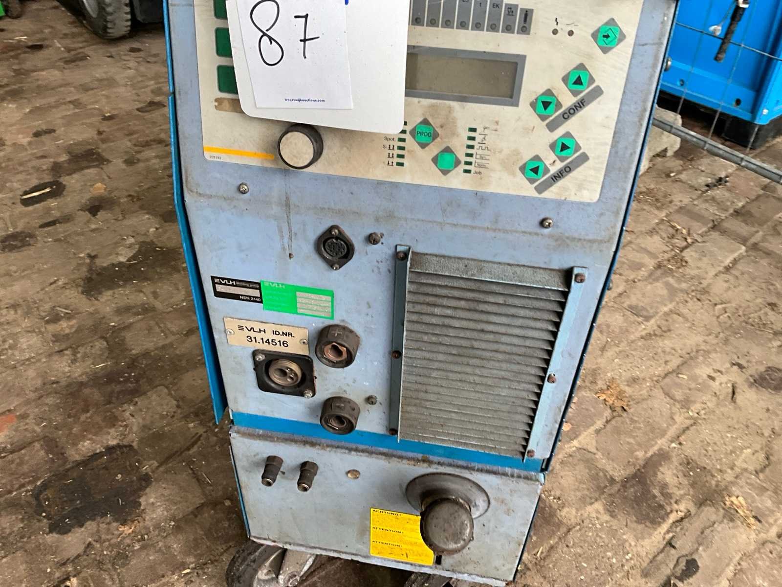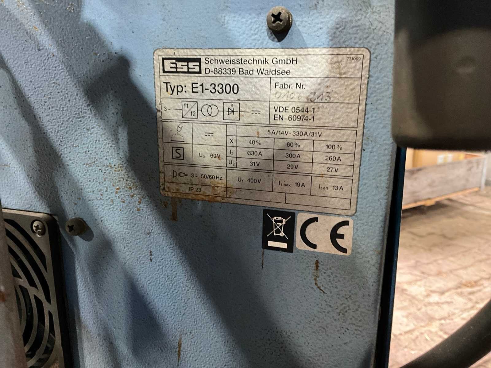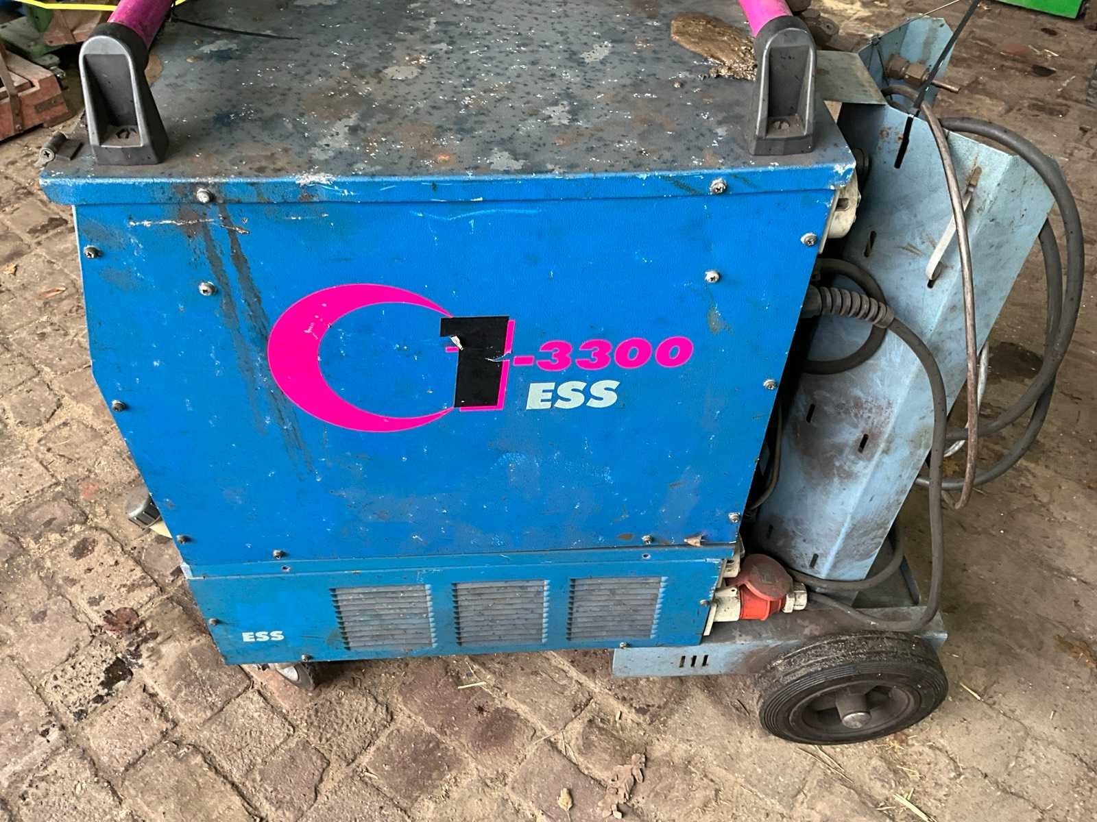 Merk: ESS Type: E1-3300 Inschakelduur: 40% Max. lasvermogen: 330A Aansluiting: 400V Digitale uitlezing: true Afmeting l: 900mm Afmeting b: 500mm Afmeting h: 1000mm