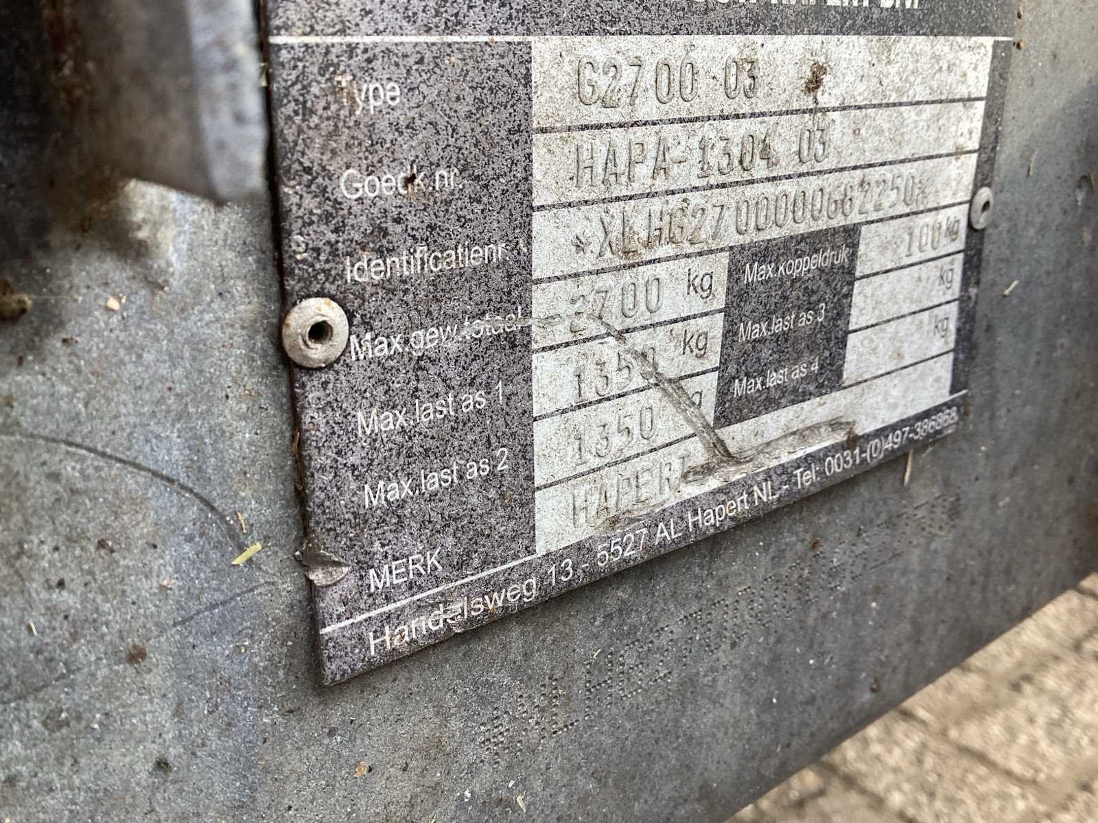 Voorzien van. Kabel lier; hydraulisch kiepen Merk: Hapert Type: G2700 Model: Machine Transporter Bouwjaar: 2006 Aantal assen: 2 Laadbak afmeting l: 460cm Laadbak afmeting b: 205cm Ledig gewicht: 731kg Laadvermogen: 1969kg Datum eerste toelating: 2006-04-12 Datum eerste toelating (NL): 2006-04-12 Kenteken: WT-DG-44