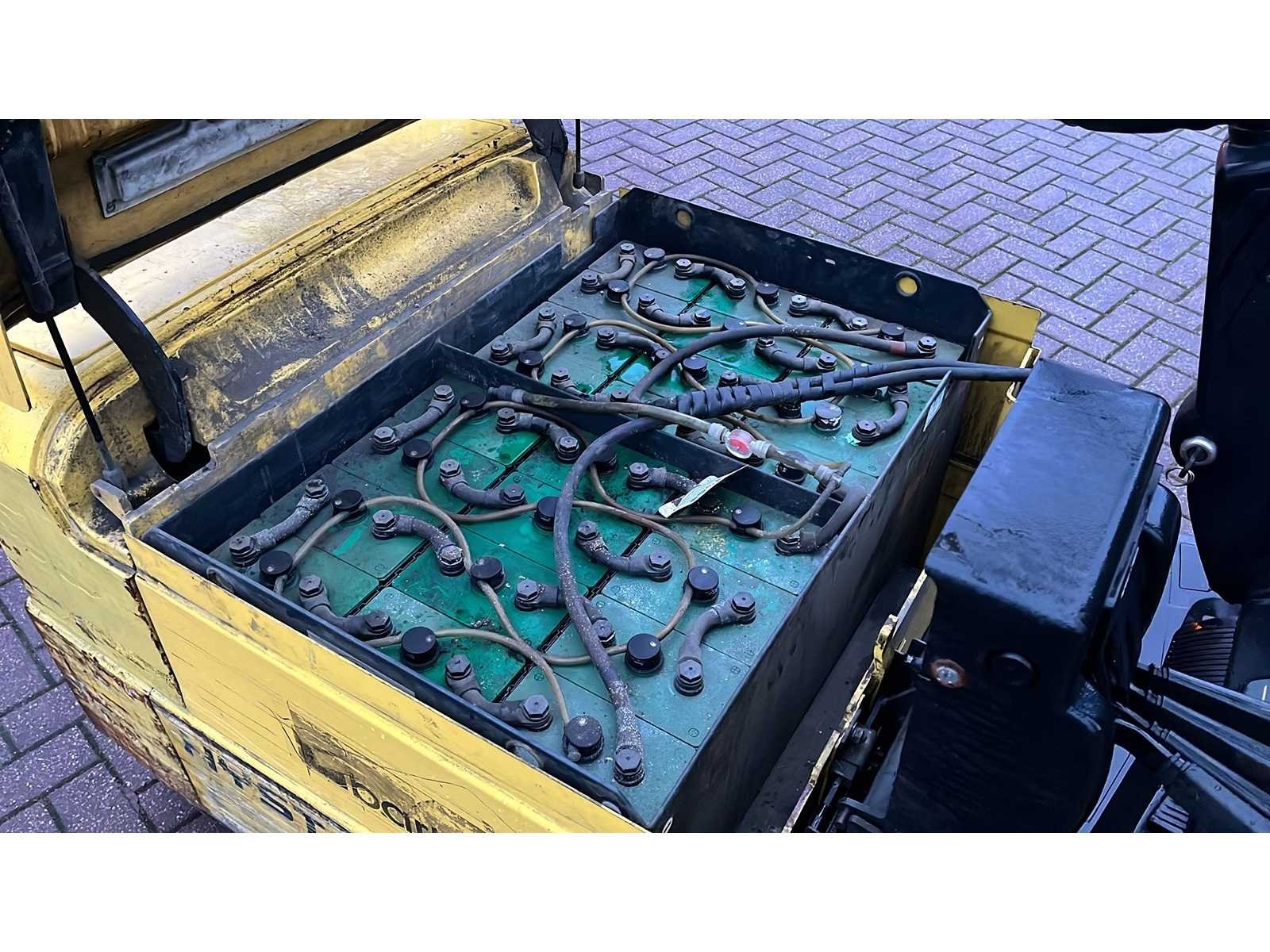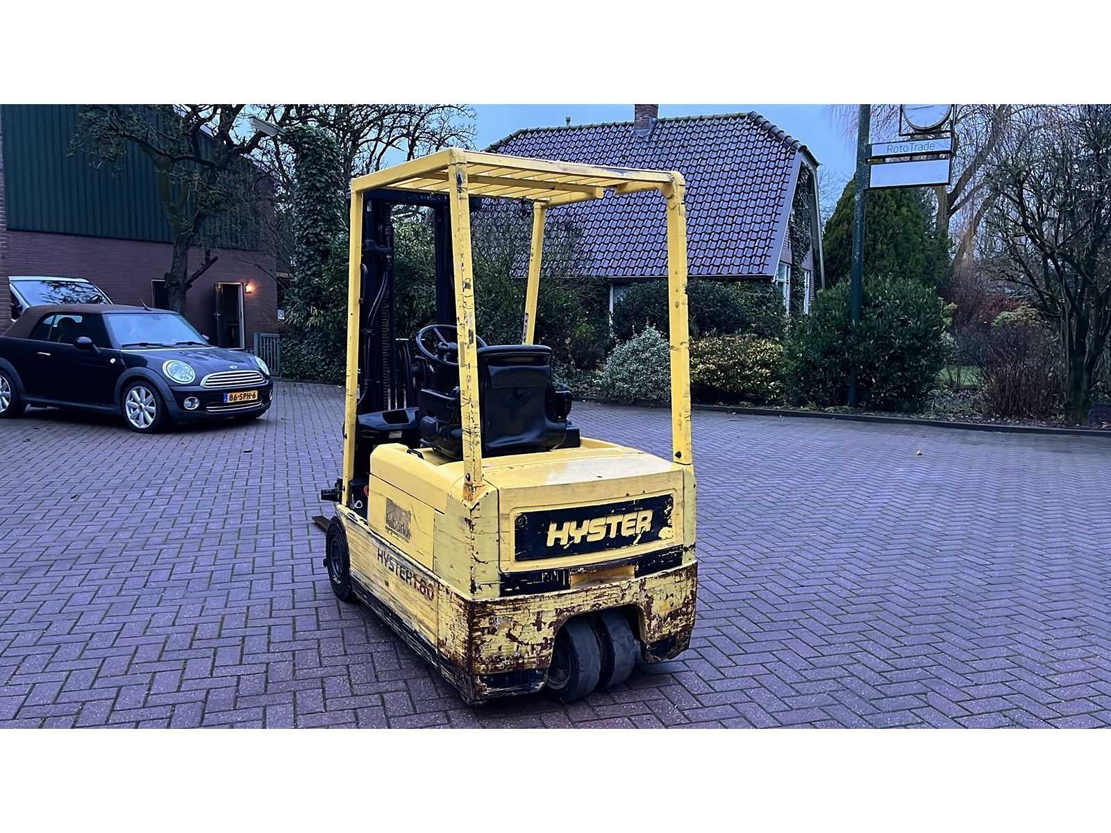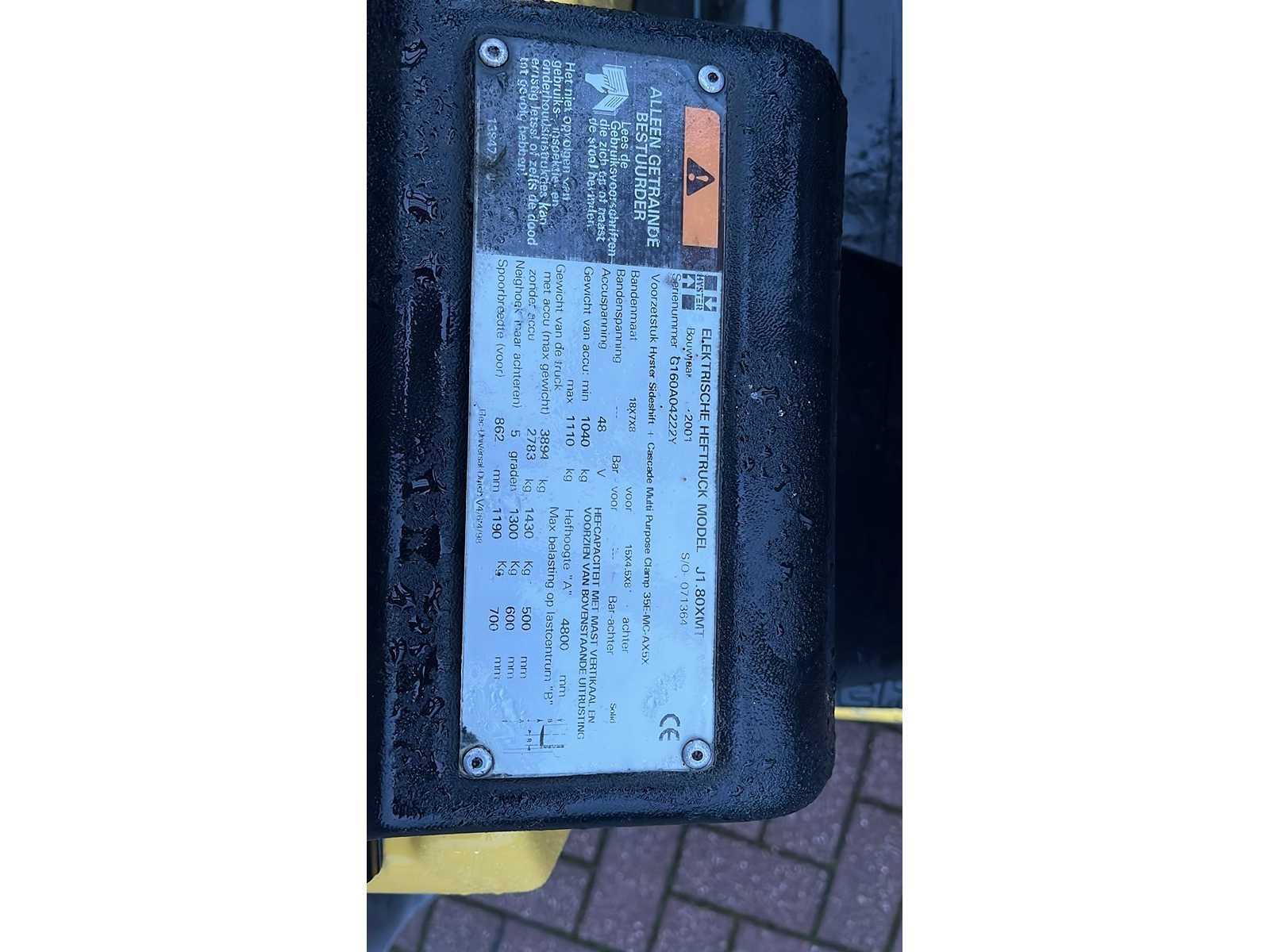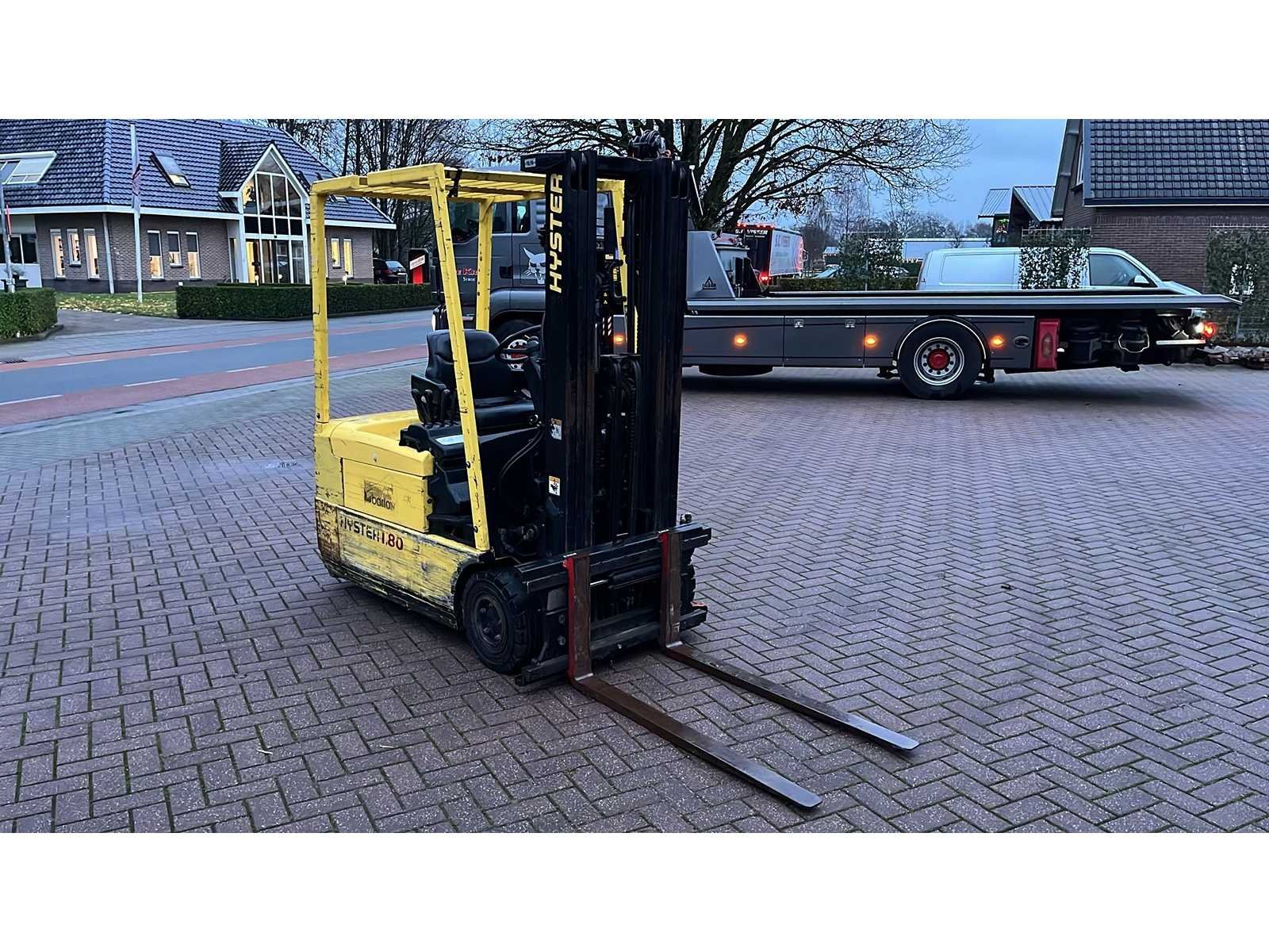 48volt Merk: Hyster Type: J1.80XMT Bouwjaar: 2001 Serienummer: G160A04222Y Aantal wielen: 3 Afgelezen urenstand: 1563 Side-shift: true Duplex mast: true Eigen gewicht: 3894kg Hefvermogen: 1800kg Lepellengte: 1200mm Max. hefhoogte: 4800mm