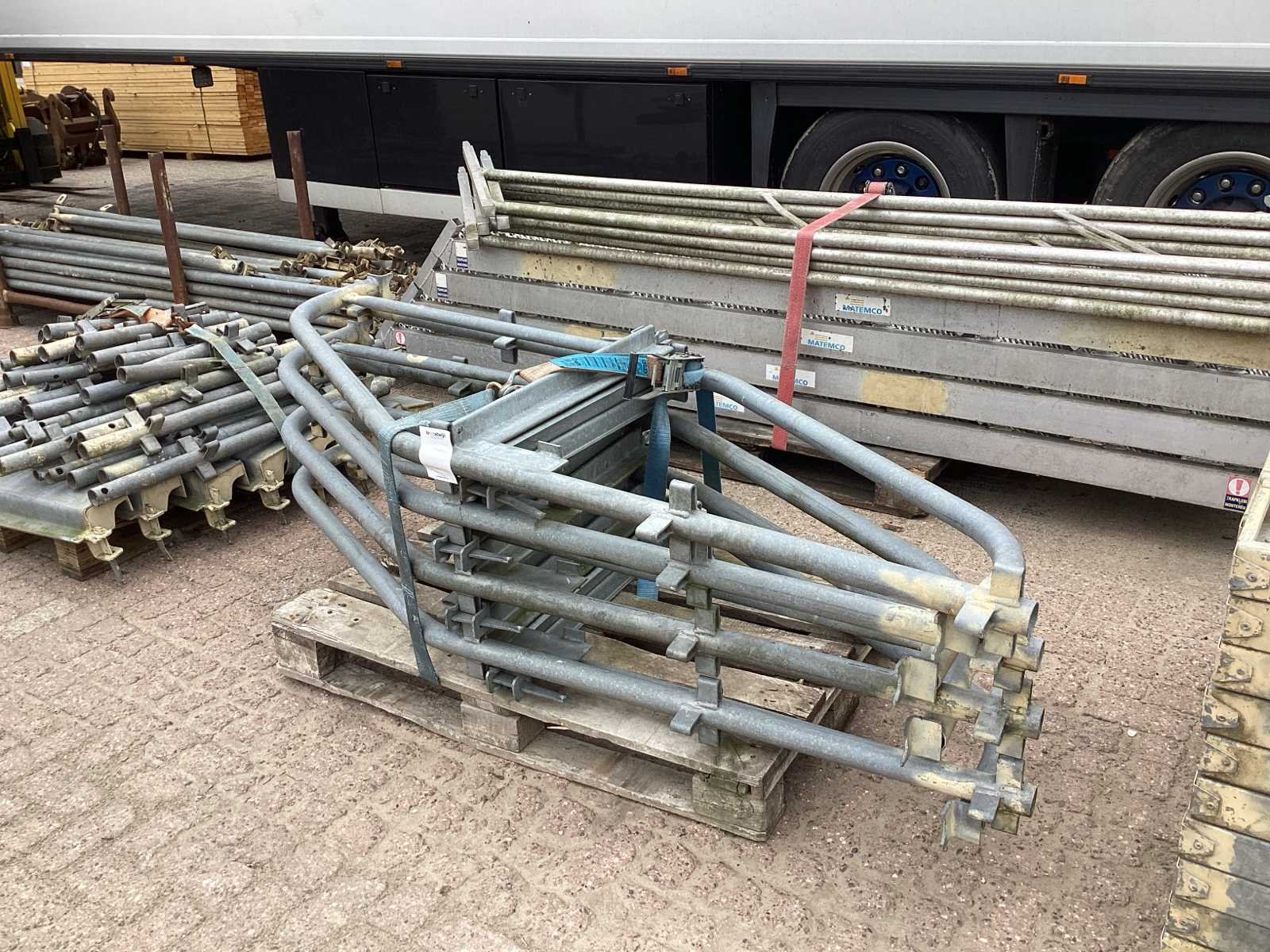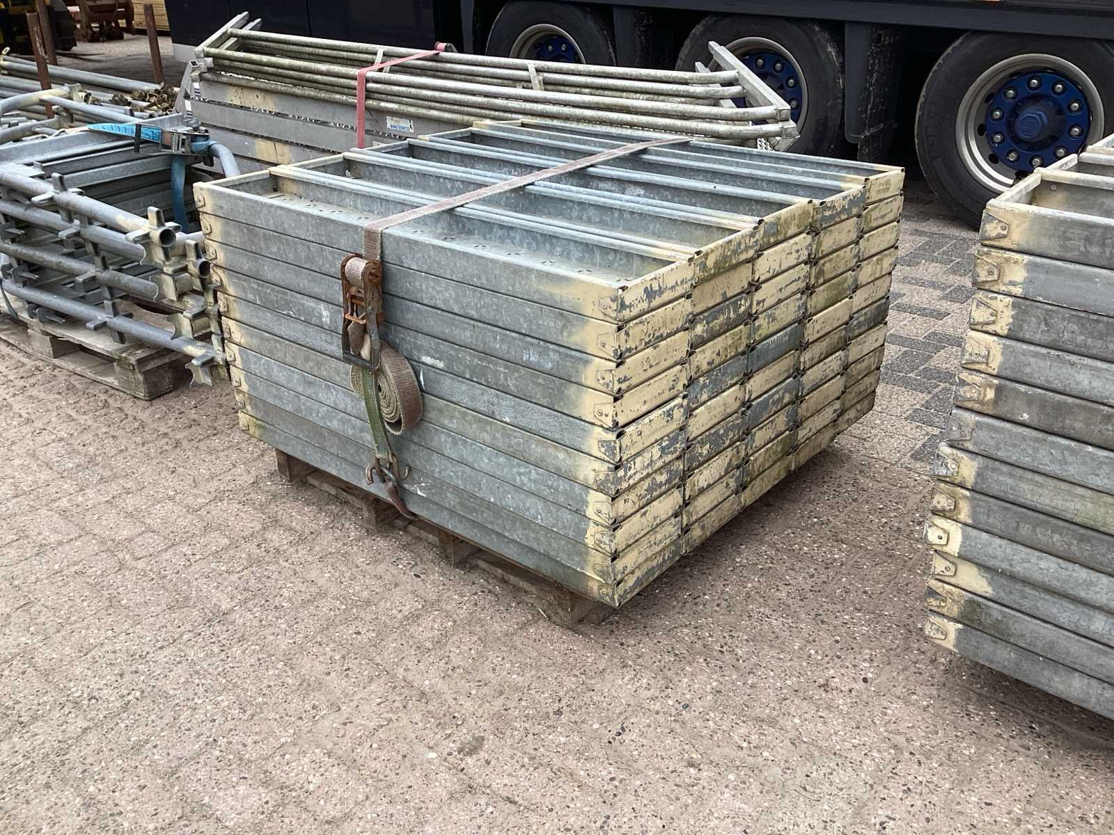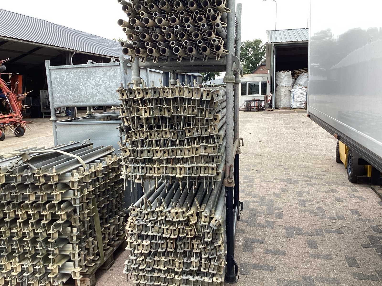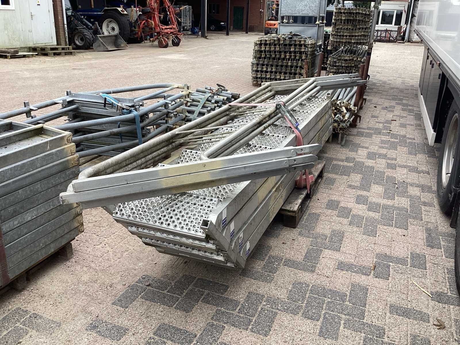 Voorzien van: 170 stalen steiger planken L= 240 cm; 50 stalen steiger planken L= 125 cm; 120 staanders L= 200cm; 120 liggers L= 240 cm; 150 korteling L= 110 cm; 16 korteling L= 60 cm; 6 hoek korteling L= 110 cm; q8 schoren div. L; 12 leuningen; 30 instelbare schroefpoten; 10 wielen; 4 aluminium trappen met leuning en toebehoren; 4 verzinkte stabelbakken; 6 verzinkte stapelblokken; Merk: Matemco Type: Kwiksteigersysteem Gegalvaniseerd: true