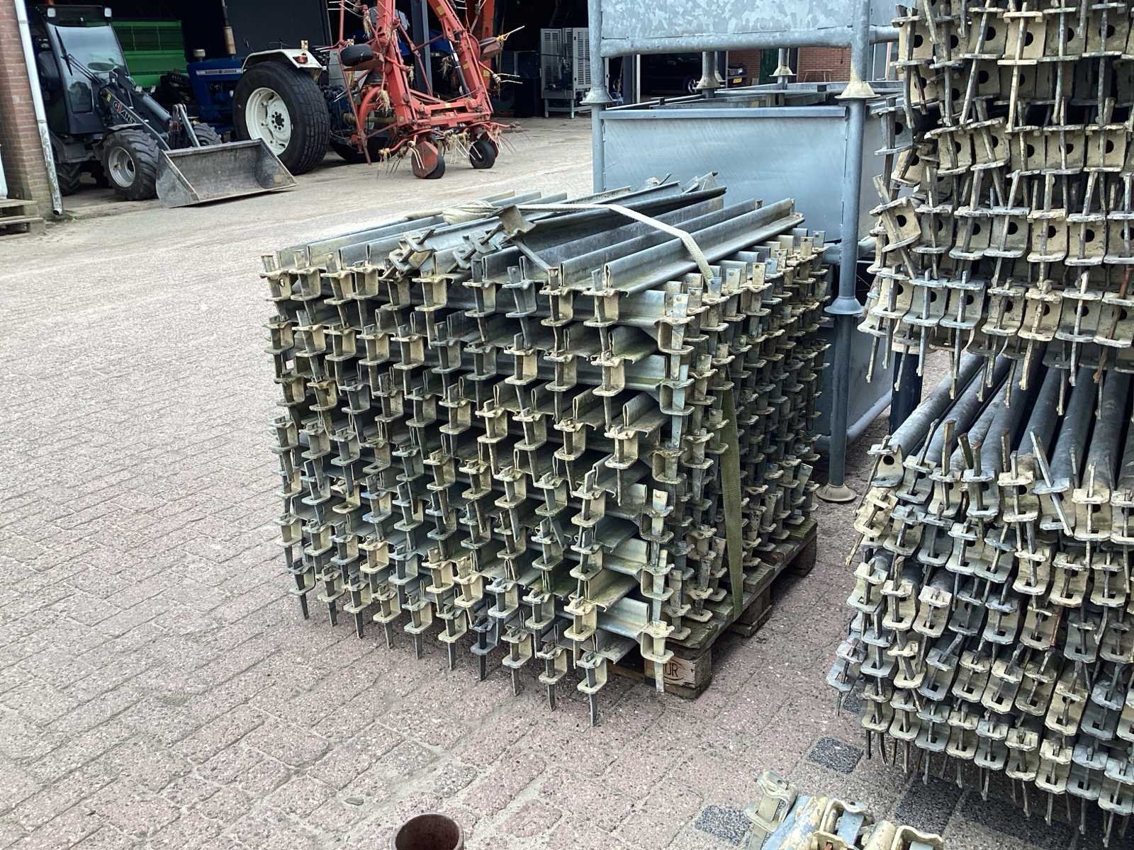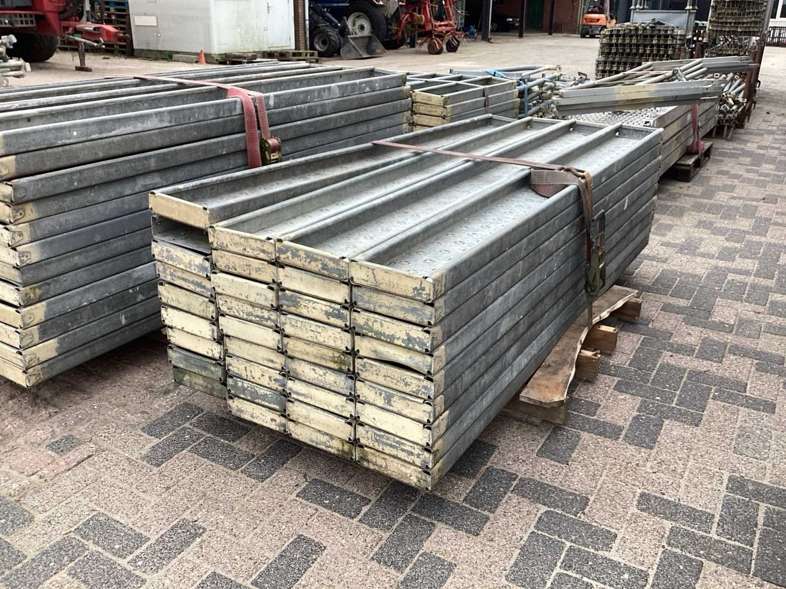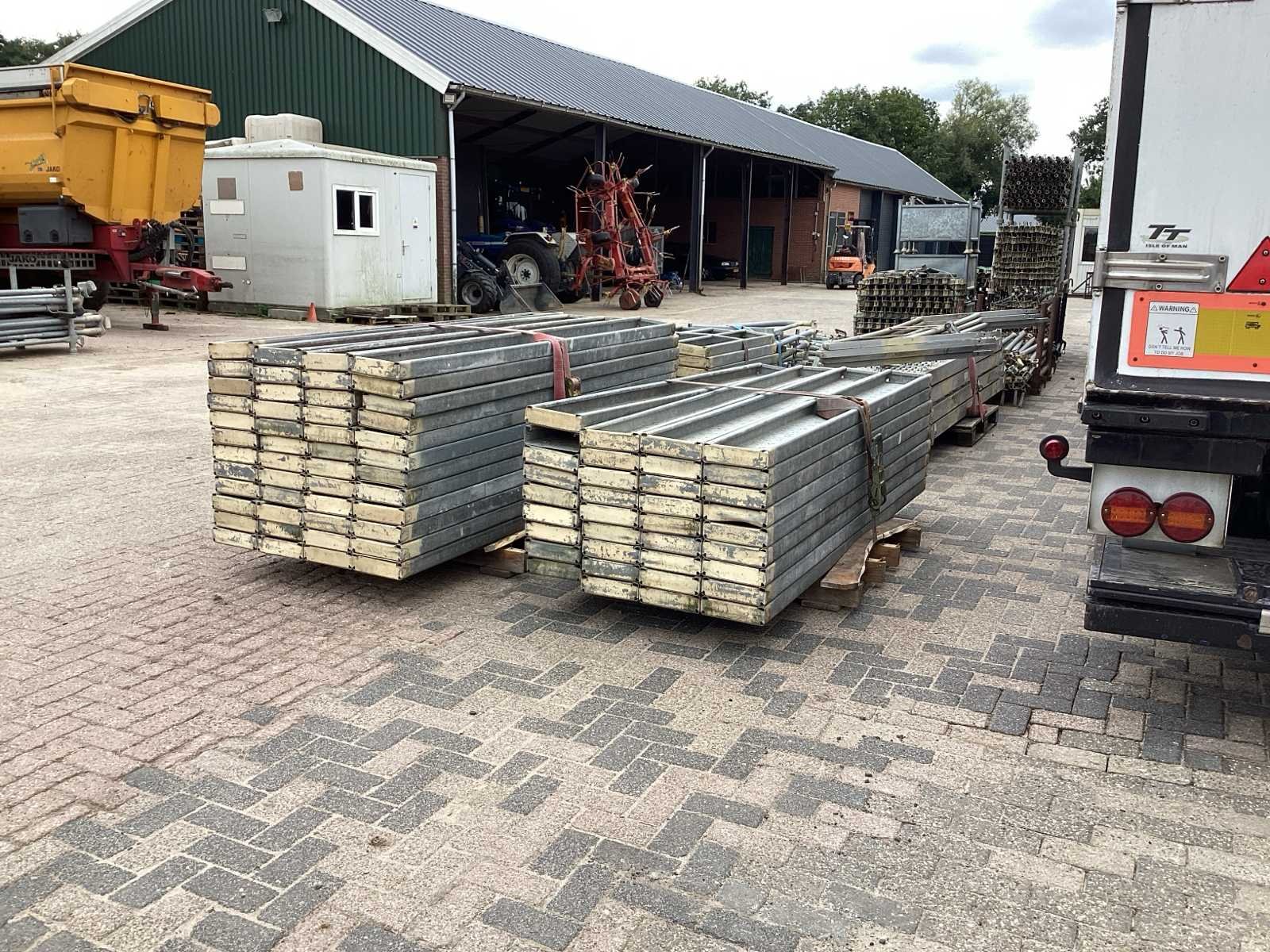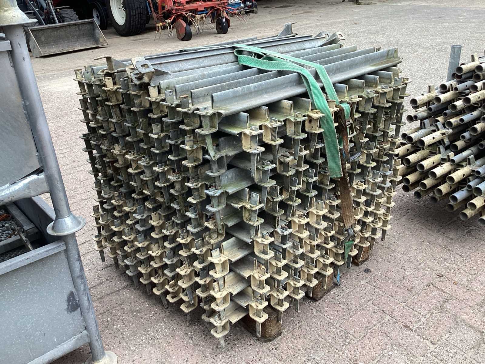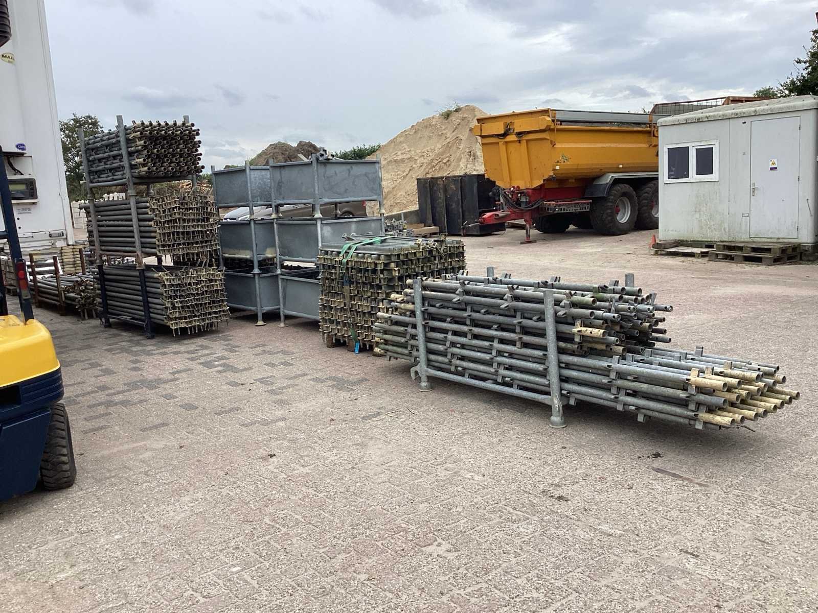 Voorzien van: 170 stalen steiger planken L= 240 cm; 50 stalen steiger planken L= 125 cm; 120 staanders L= 200cm; 120 liggers L= 240 cm; 150 korteling L= 110 cm; 16 korteling L= 60 cm; 6 hoek korteling L= 110 cm; q8 schoren div. L; 12 leuningen; 30 instelbare schroefpoten; 10 wielen; 4 aluminium trappen met leuning en toebehoren; 4 verzinkte stabelbakken; 6 verzinkte stapelblokken; Merk: Matemco Type: Kwiksteigersysteem Gegalvaniseerd: true
