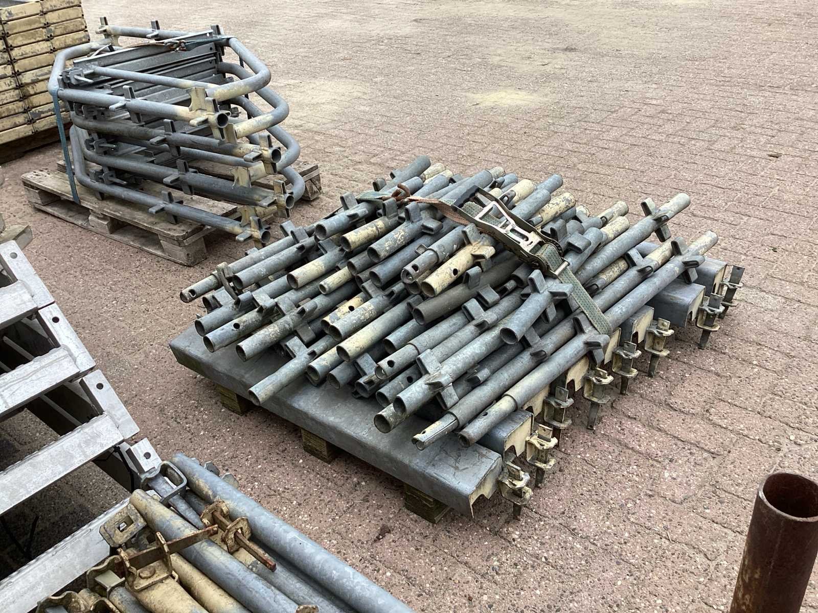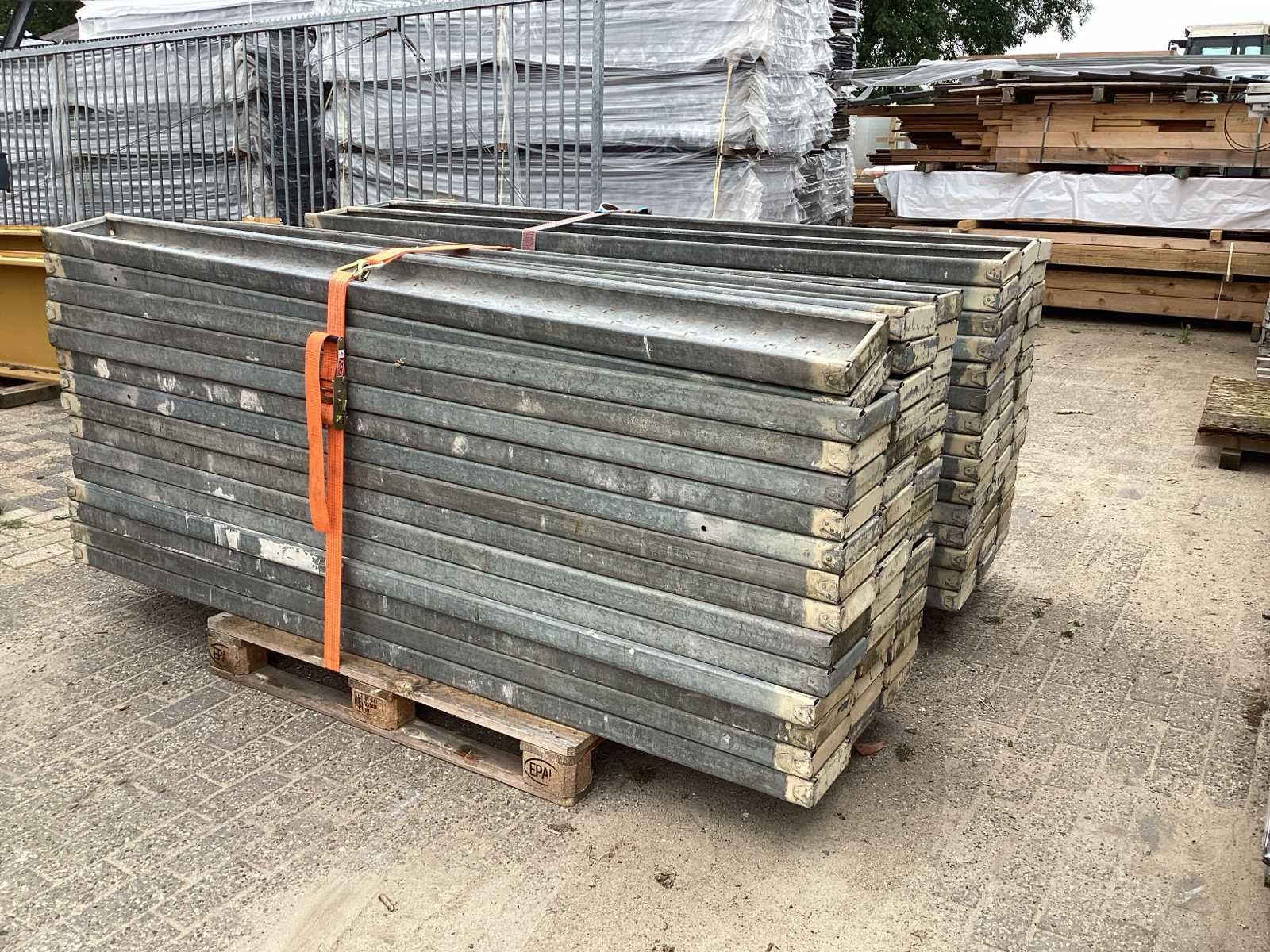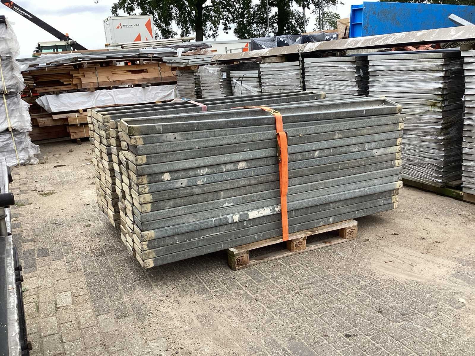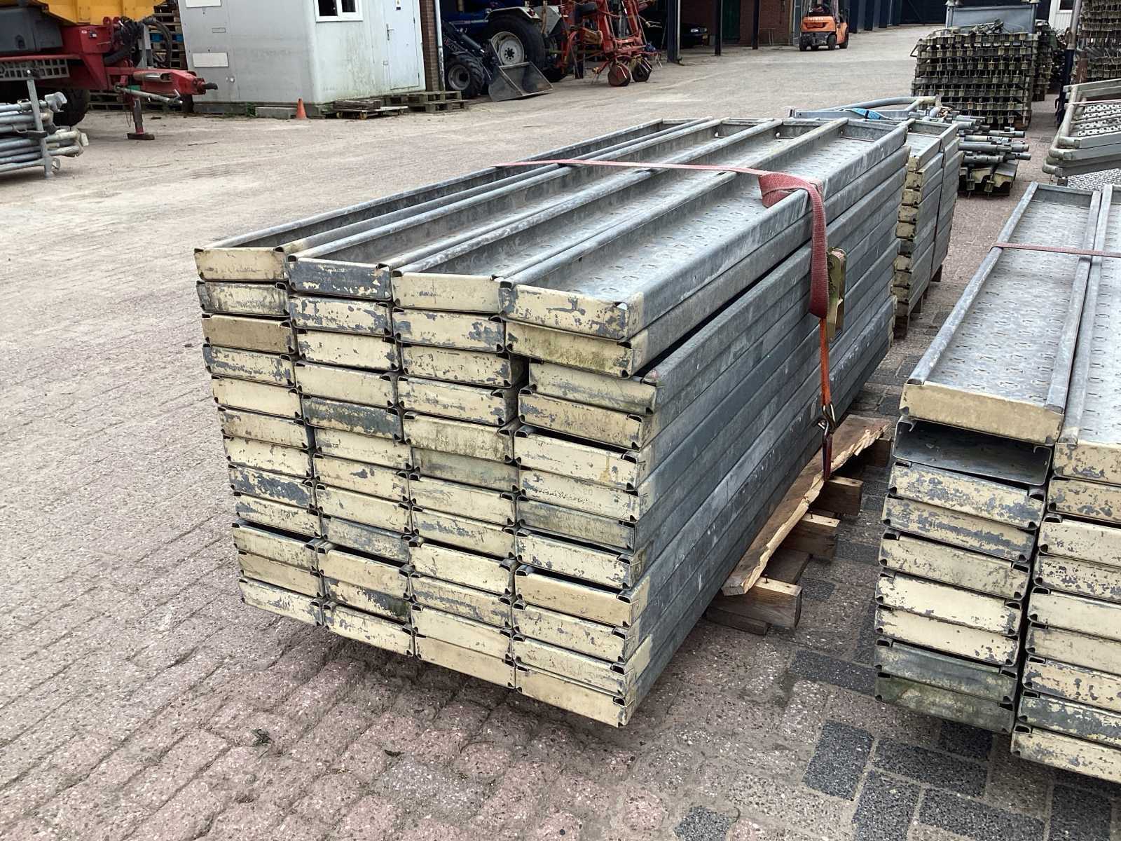 Voorzien van: 170 stalen steiger planken L= 240 cm; 50 stalen steiger planken L= 125 cm; 120 staanders L= 200cm; 120 liggers L= 240 cm; 150 korteling L= 110 cm; 16 korteling L= 60 cm; 6 hoek korteling L= 110 cm; q8 schoren div. L; 12 leuningen; 30 instelbare schroefpoten; 10 wielen; 4 aluminium trappen met leuning en toebehoren; 4 verzinkte stabelbakken; 6 verzinkte stapelblokken; Merk: Matemco Type: Kwiksteigersysteem Gegalvaniseerd: true