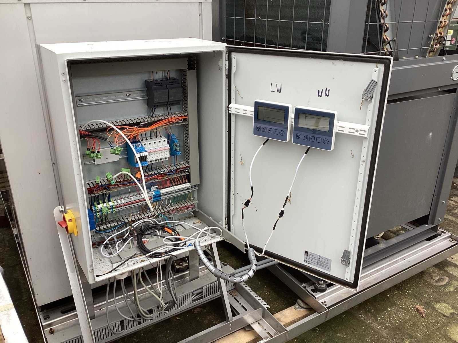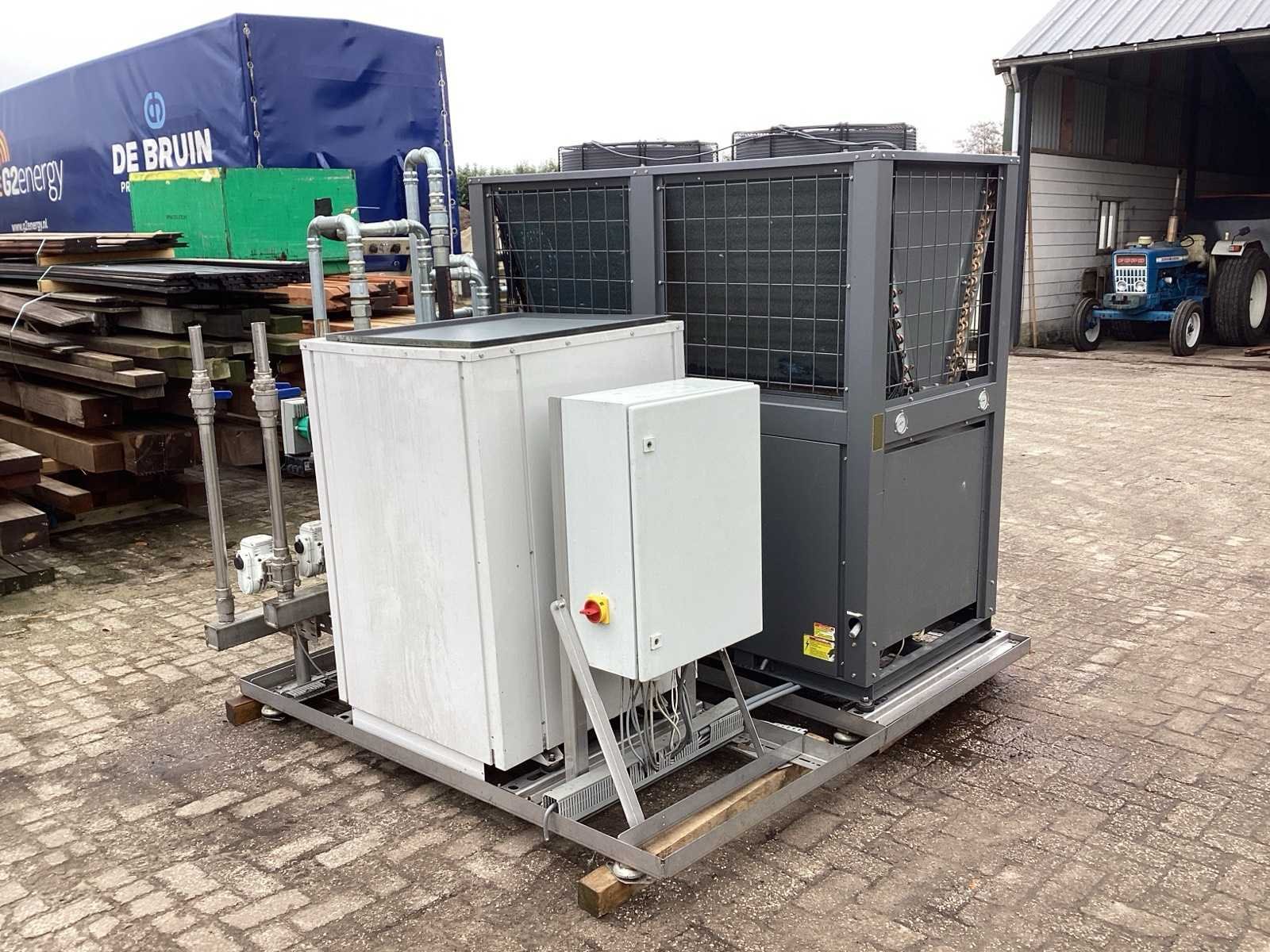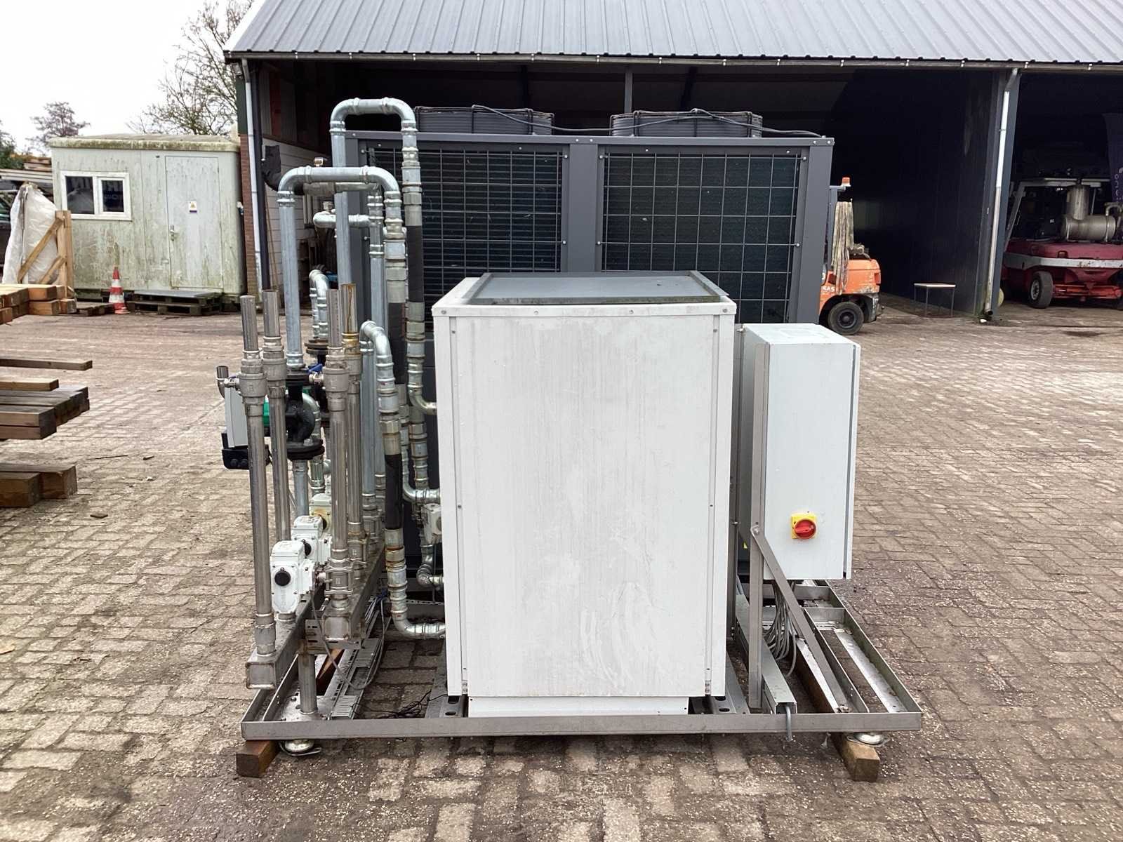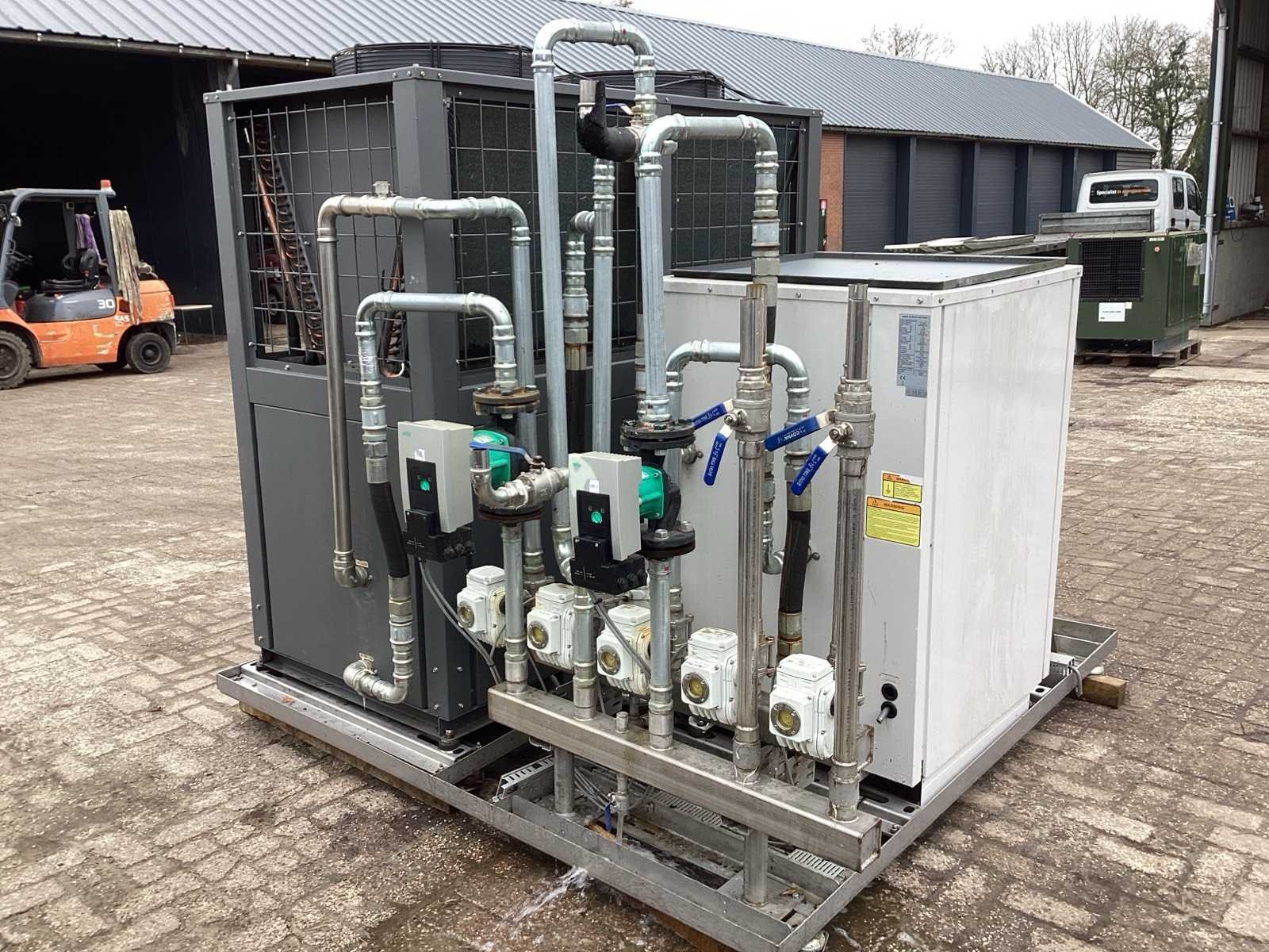 Unit beschikt zowel over: • Water/water bron 32KW thermisch vermogen • Lucht/water bron 55KW thermisch vermogen. Unit is geschikt voor 7K litertank van 10°C naar 70°C te brengen. Unit kan koelen en verwarmen. De warmte die vrij komt bij koelen kan 1:1 benut worden voor verwarmen van andere tank. Merk: Water to water heat pump Model: MWCRW120Z/S Lengte: 220cm Breedte: 200cm Hoogte: 185cm