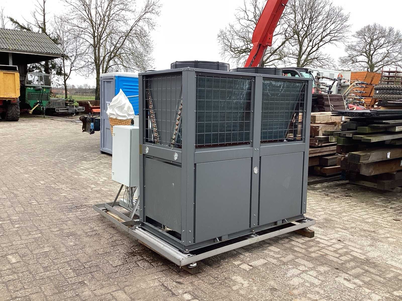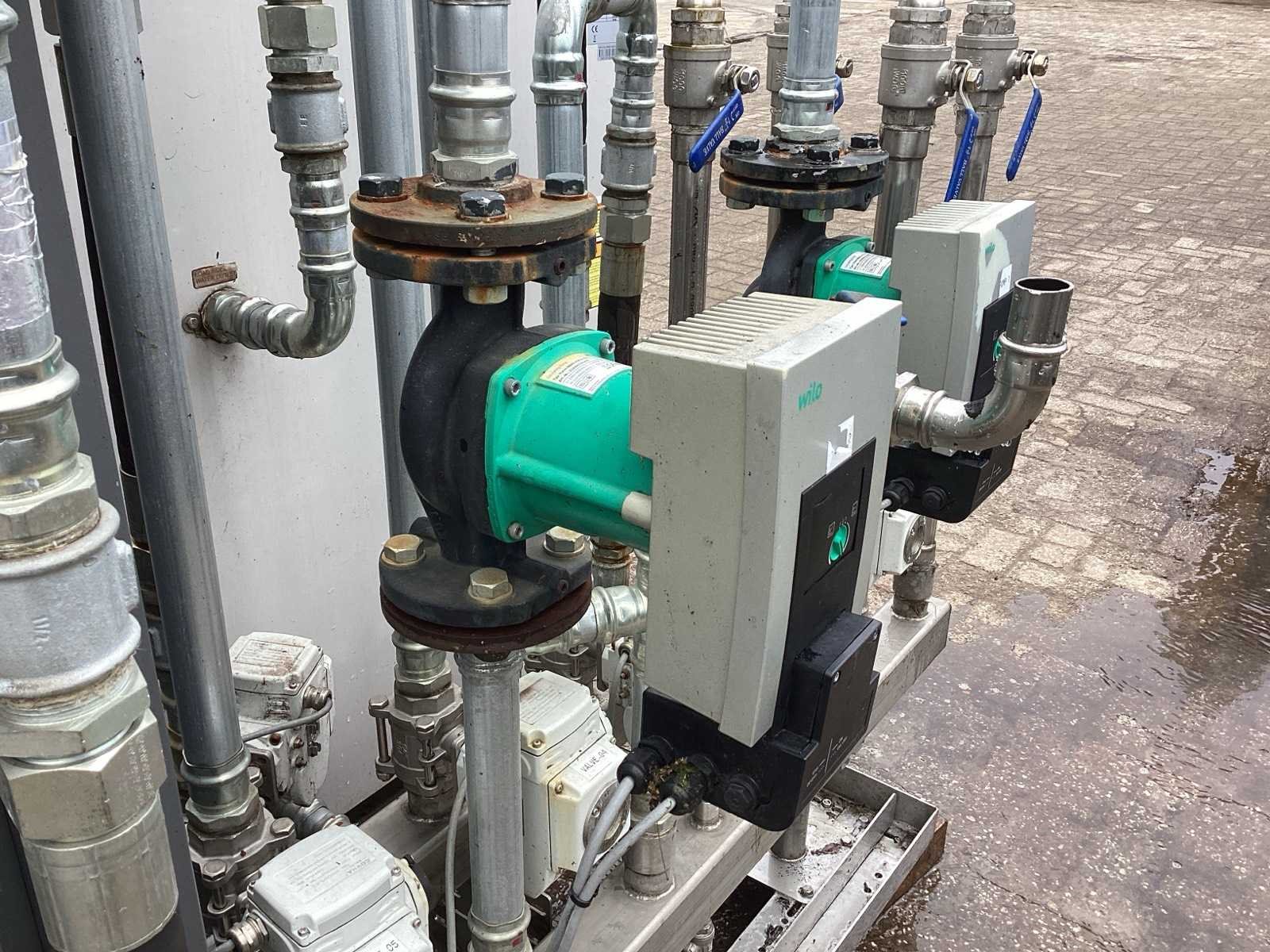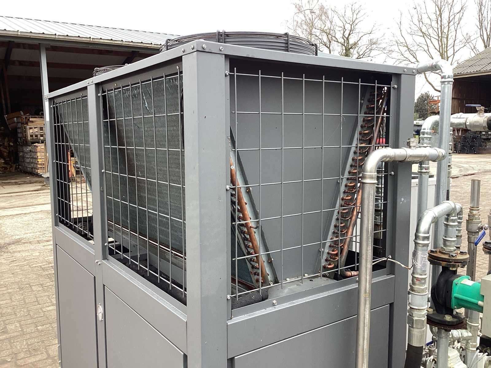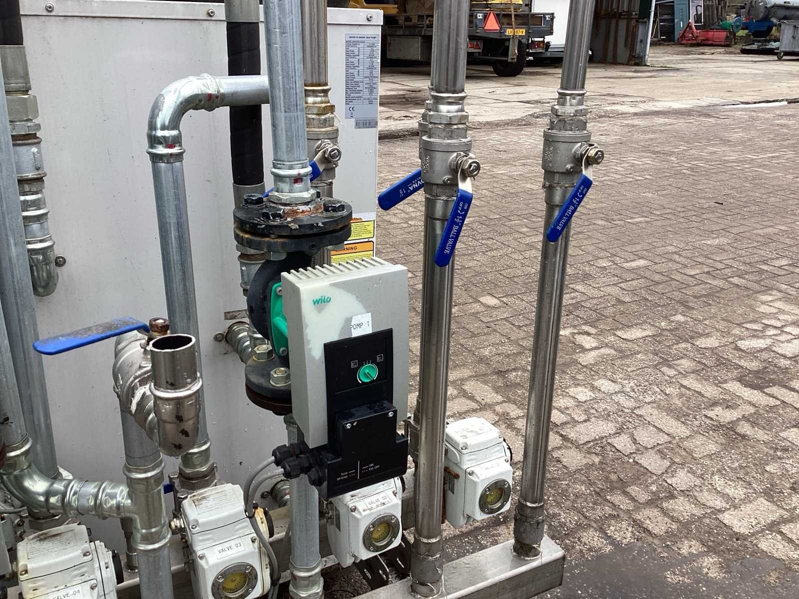 Unit beschikt zowel over: • Water/water bron 32KW thermisch vermogen • Lucht/water bron 55KW thermisch vermogen. Unit is geschikt voor 7K litertank van 10°C naar 70°C te brengen. Unit kan koelen en verwarmen. De warmte die vrij komt bij koelen kan 1:1 benut worden voor verwarmen van andere tank. Merk: Water to water heat pump Model: MWCRW120Z/S Lengte: 220cm Breedte: 200cm Hoogte: 185cm