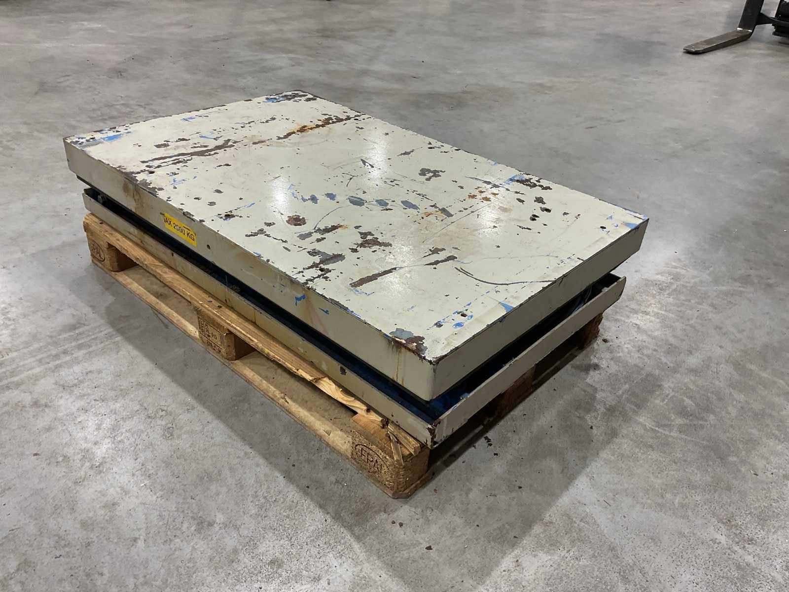 Schaarlift cap 2000kg; pomp zit onder de tafel; geen bediening; werking onbekend. Merk: Power lift Lengte: 125cm Breedte: 80cm Hoogte: 22cm Materiaal: Staal