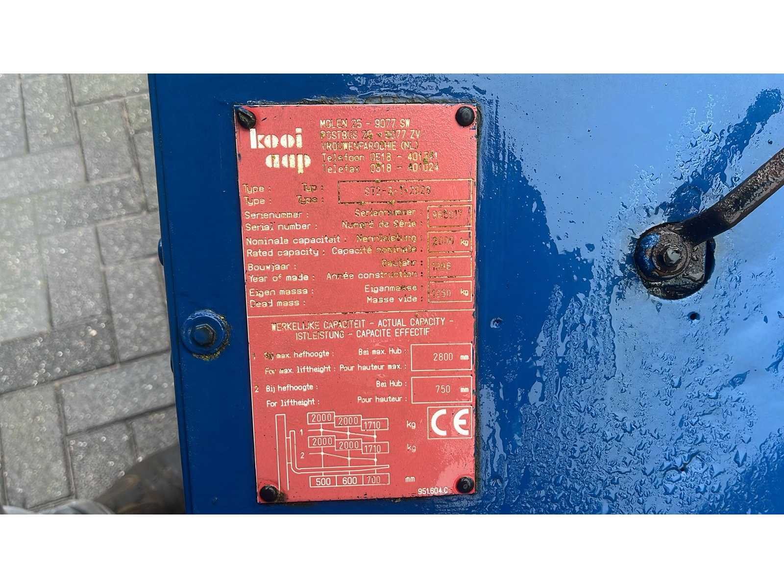 Kubota diesel; Merk: Kooiaap Type: ST2-3-1-2028 Bouwjaar: 1996 Serienummer: 965017 Aantal wielen: 3 Hefvermogen: 2000kg Hefhoogte: 2800mm Lepellengte: 900mm Luchtbanden: true Afgelezen urenstand: 3552 Eigen gewicht: 1250kg