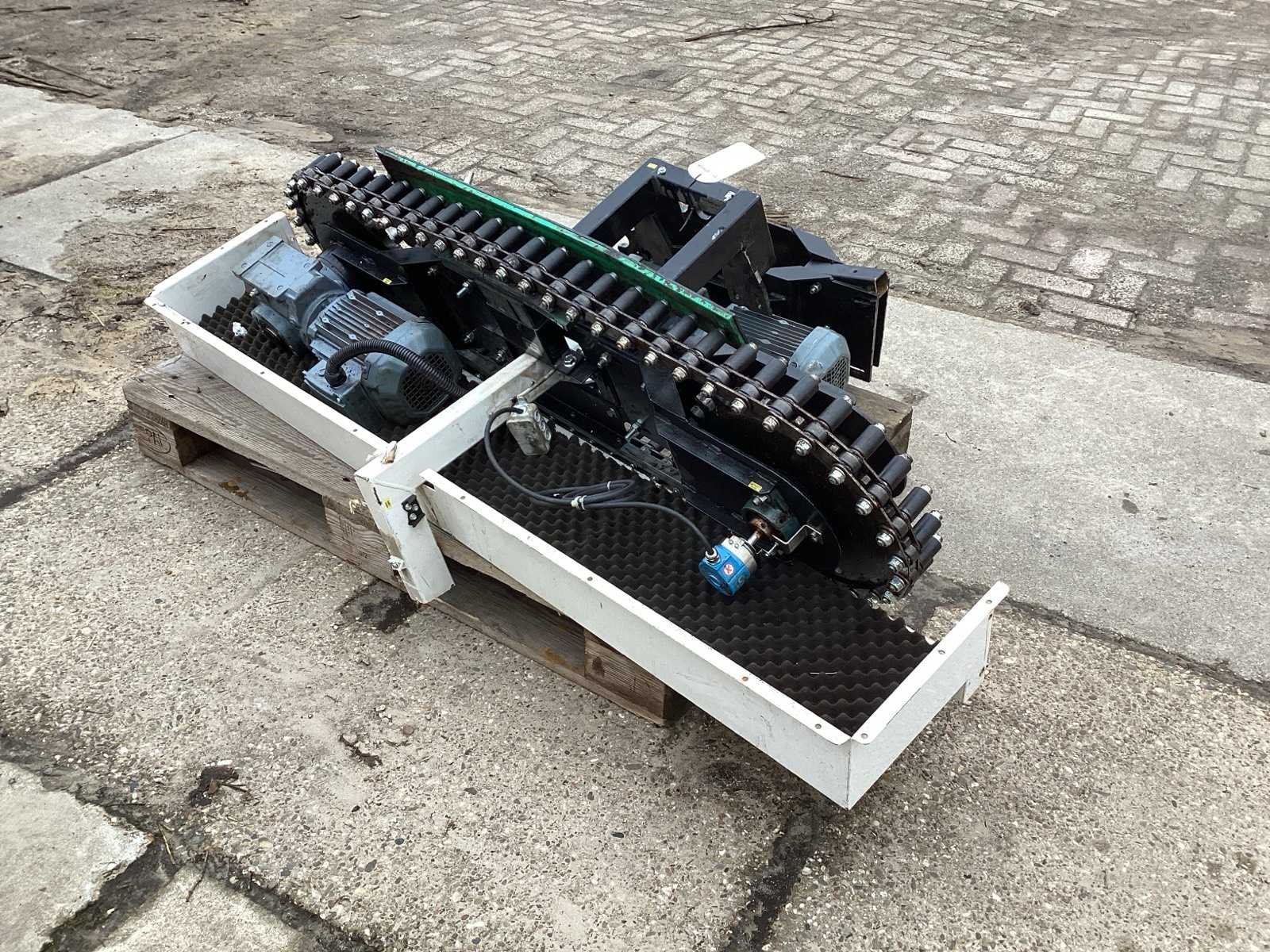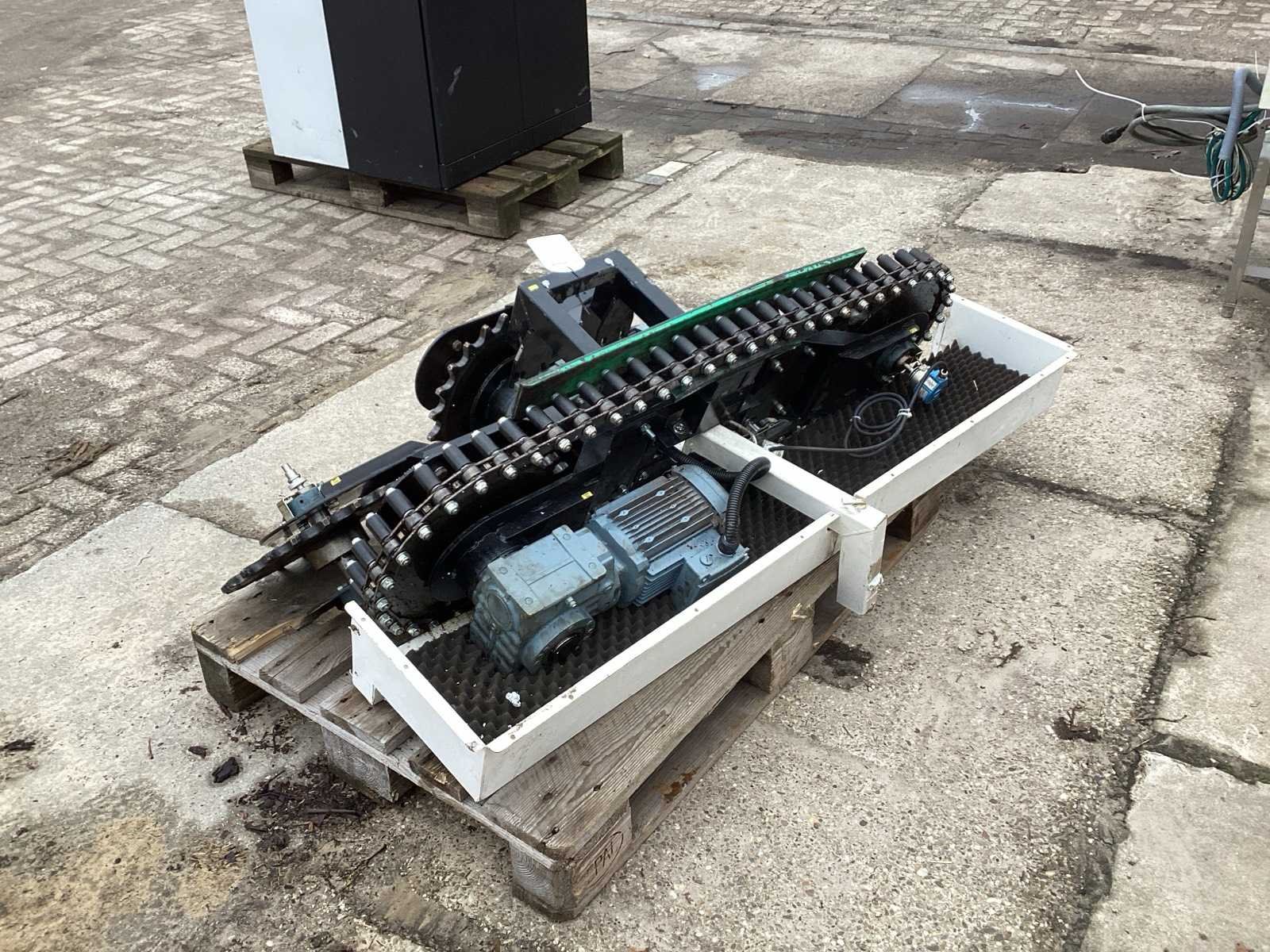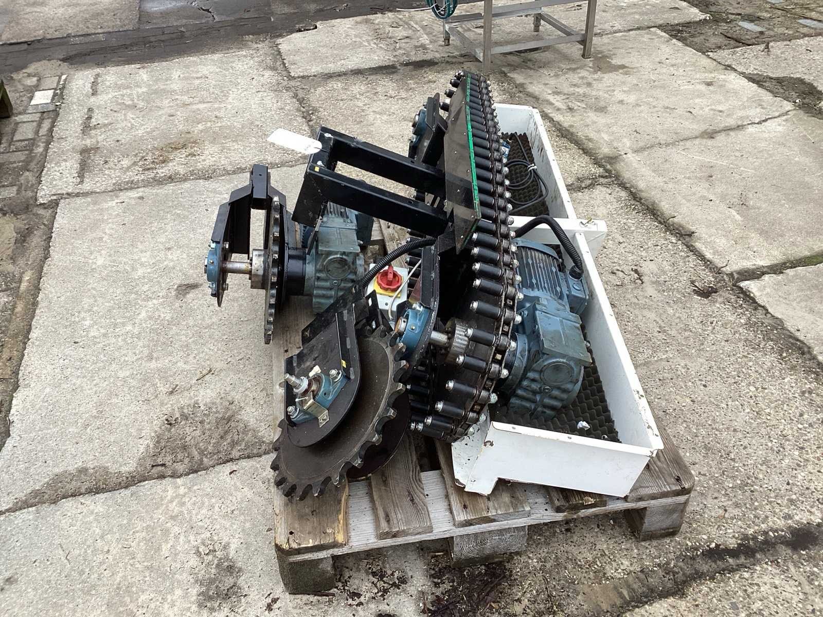 Voorzien van. 2 elektra motoren- reductor; ketting wielen; wordt gebruikt in de kleding industrie Elektrisch aangedreven: true