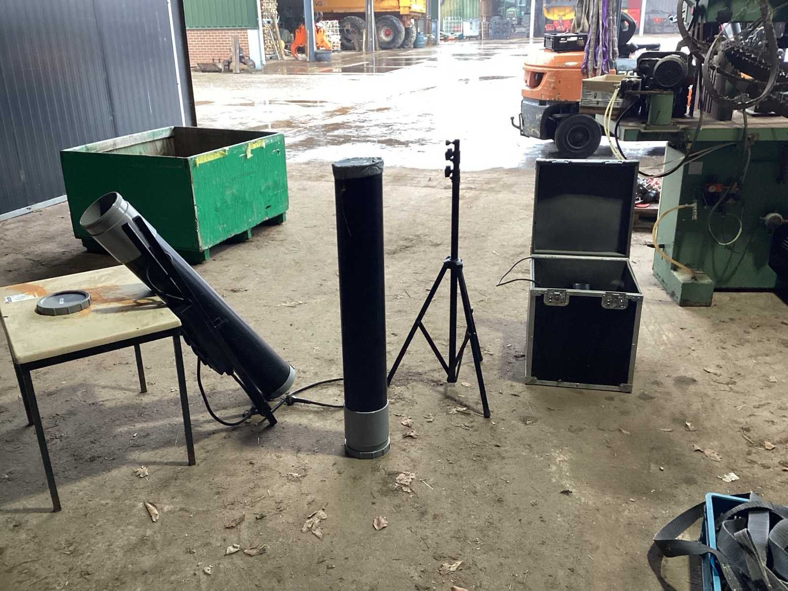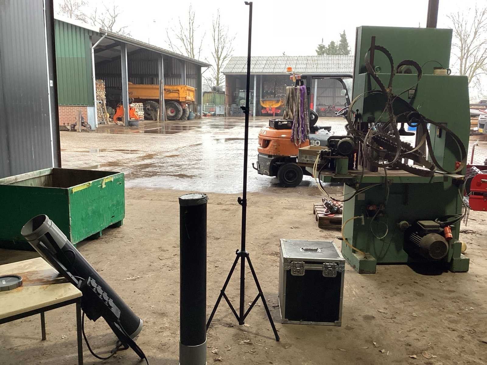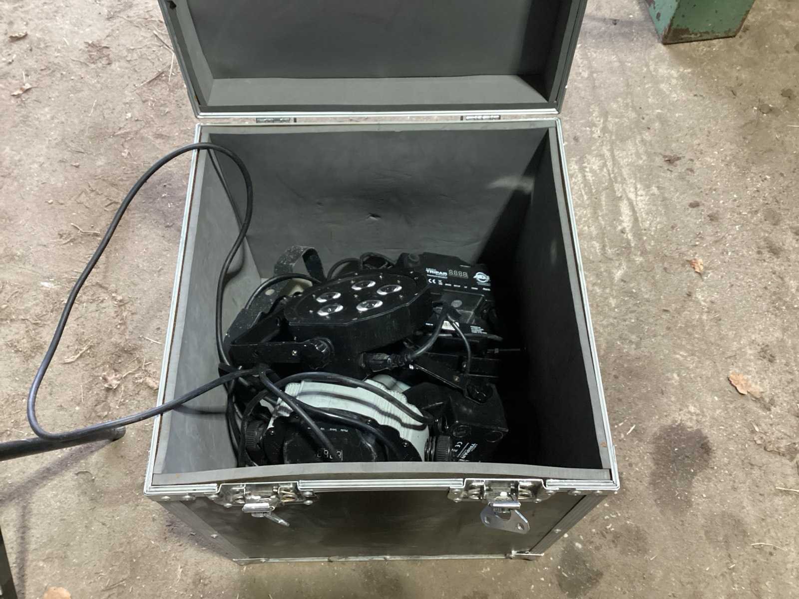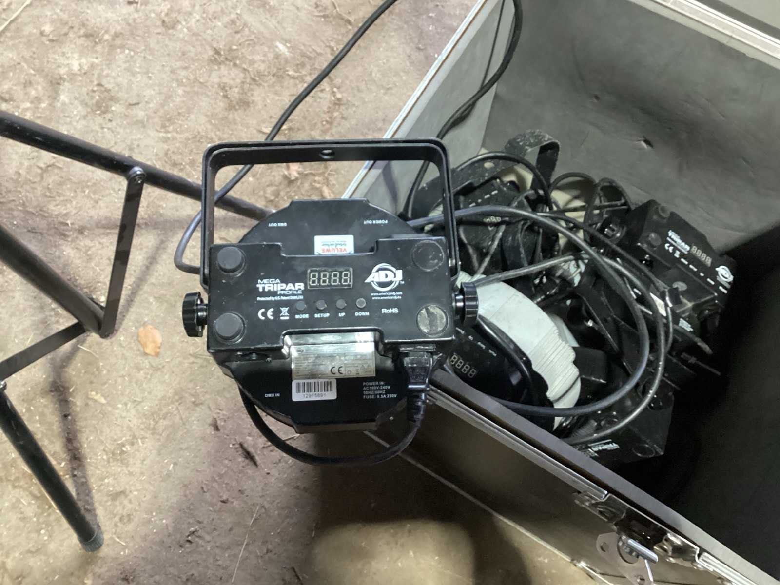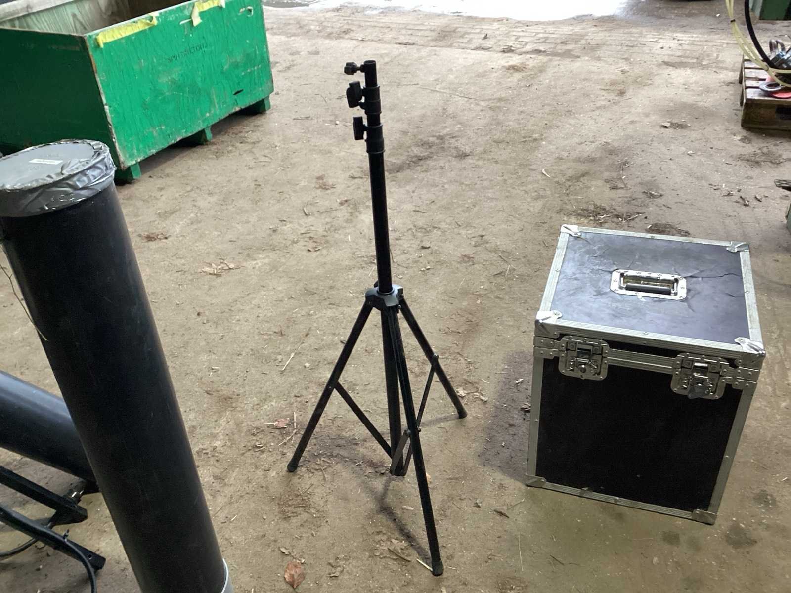 Voorzien van. Statieven voor lampen; kist met lampen; steunen met stroom verdeel blokken