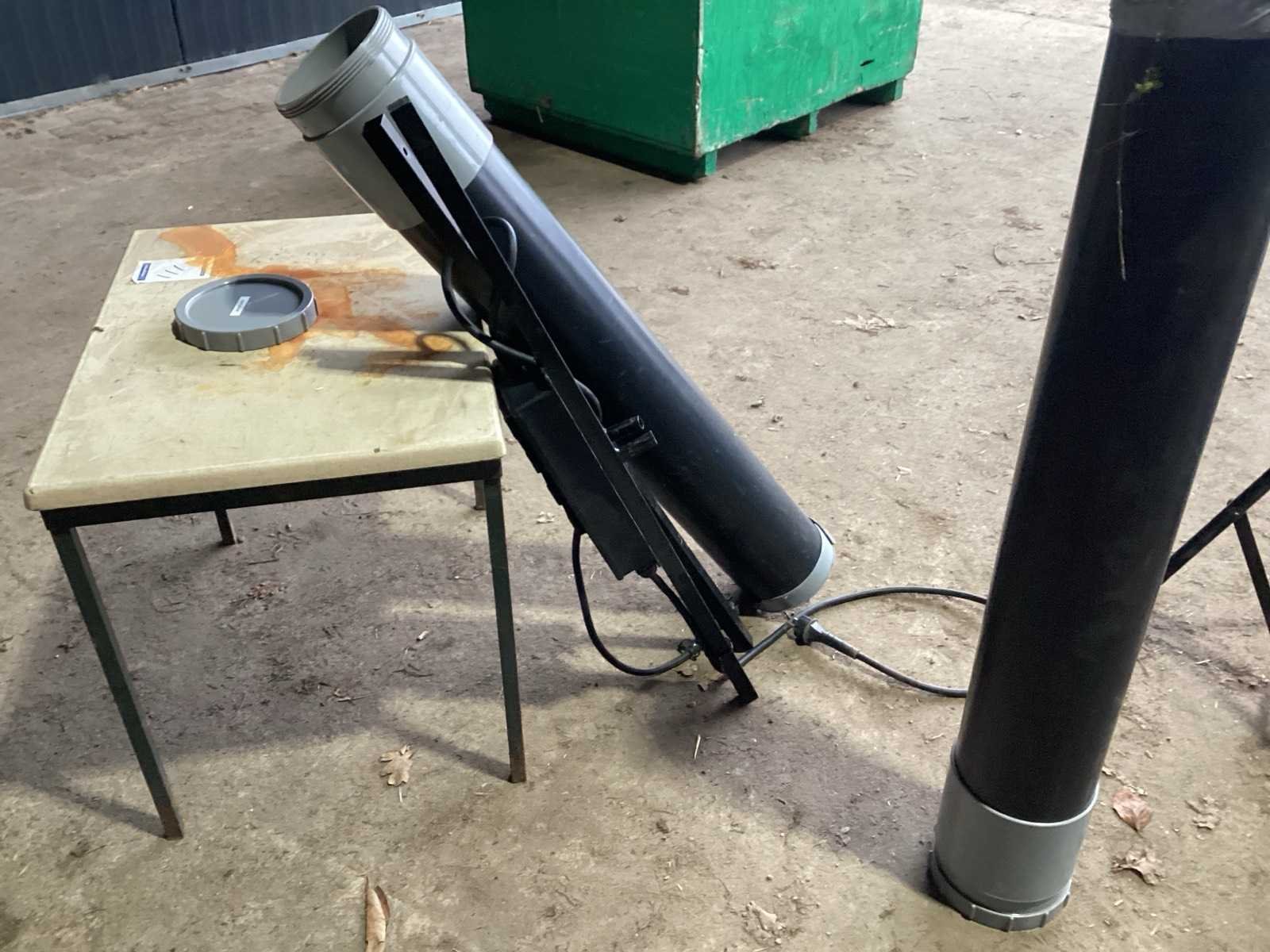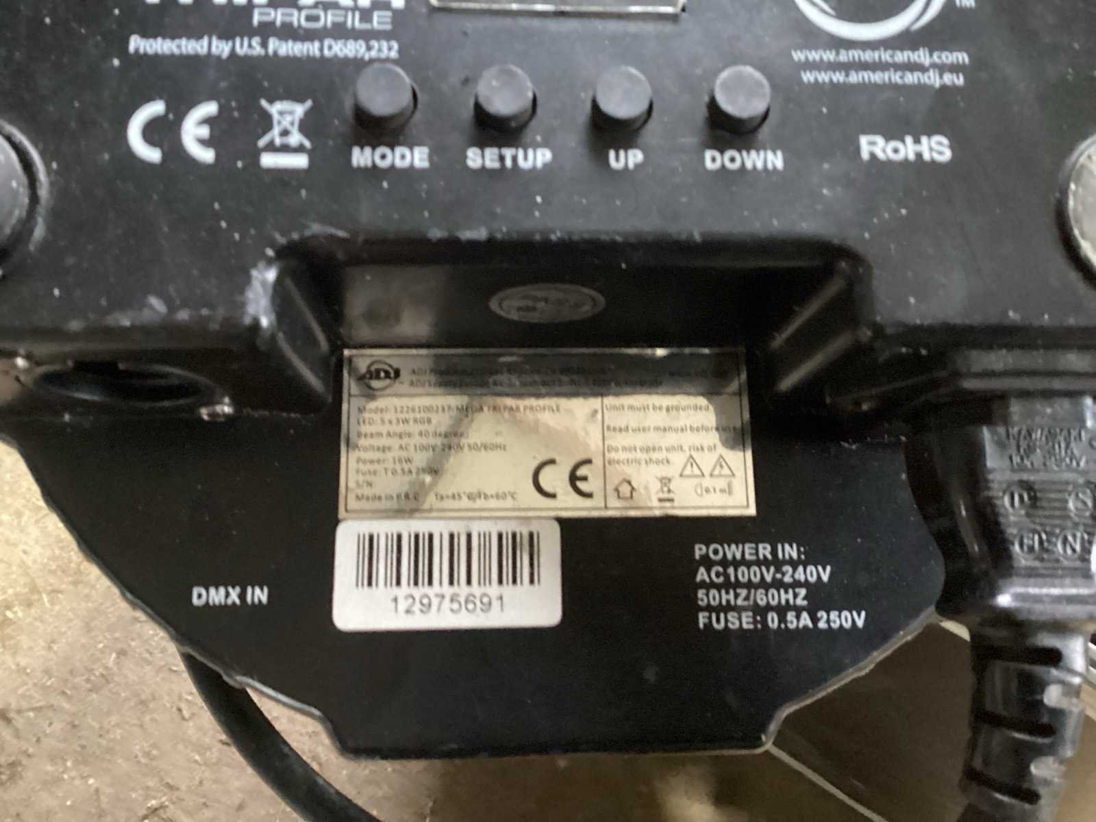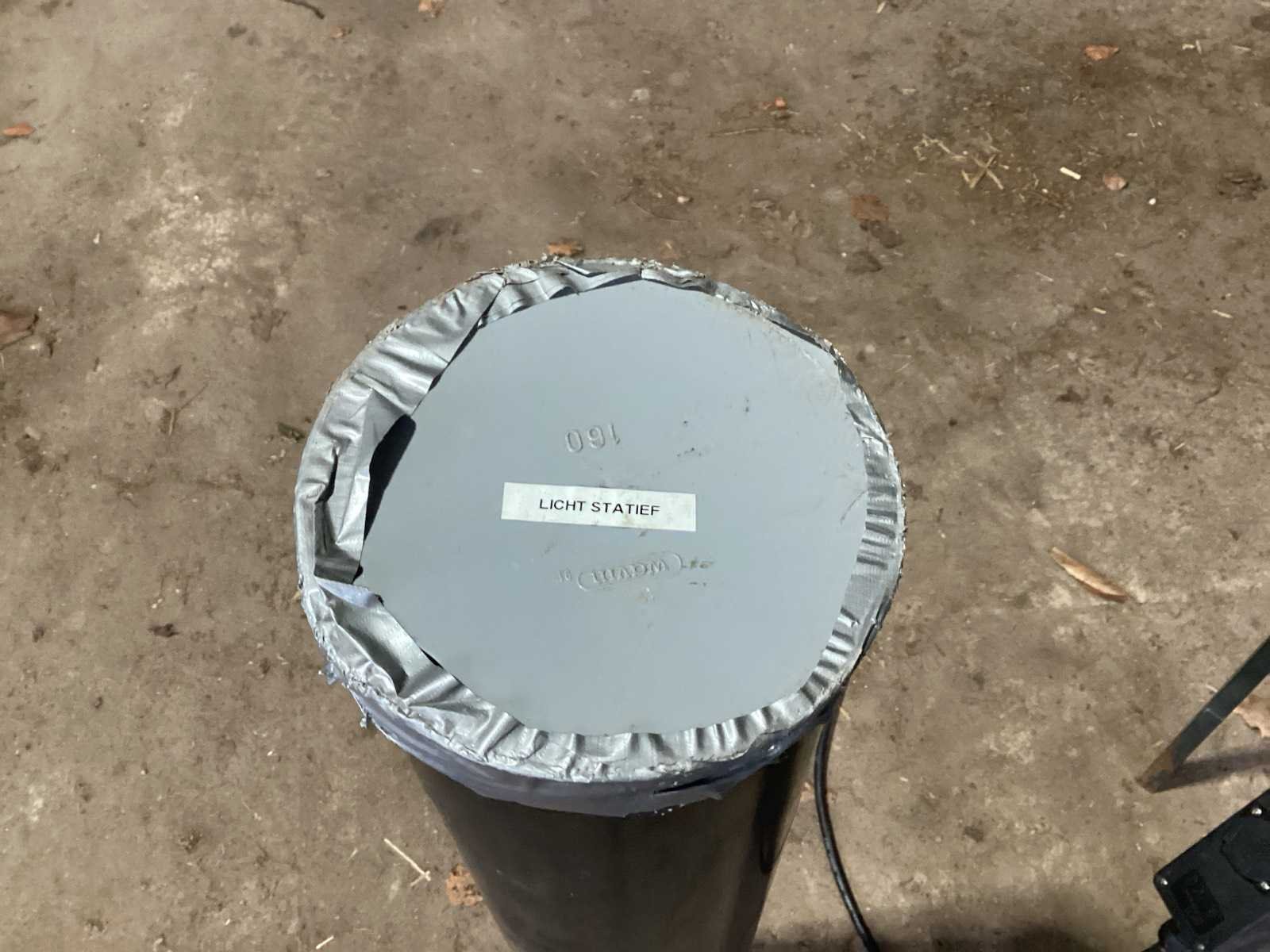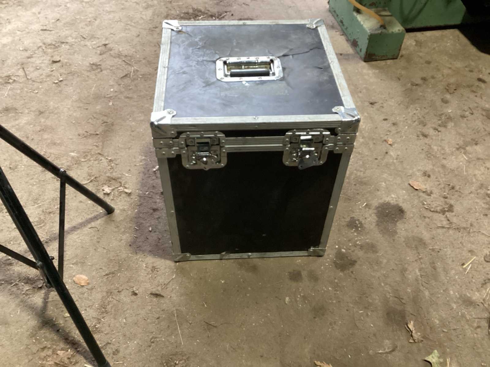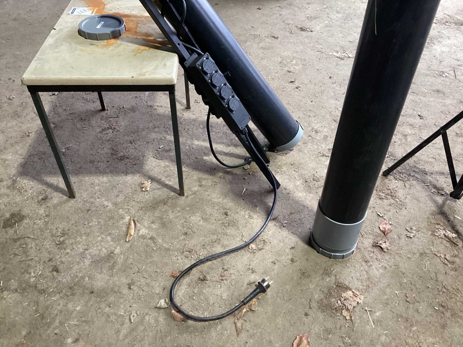 Voorzien van. Statieven voor lampen; kist met lampen; steunen met stroom verdeel blokken