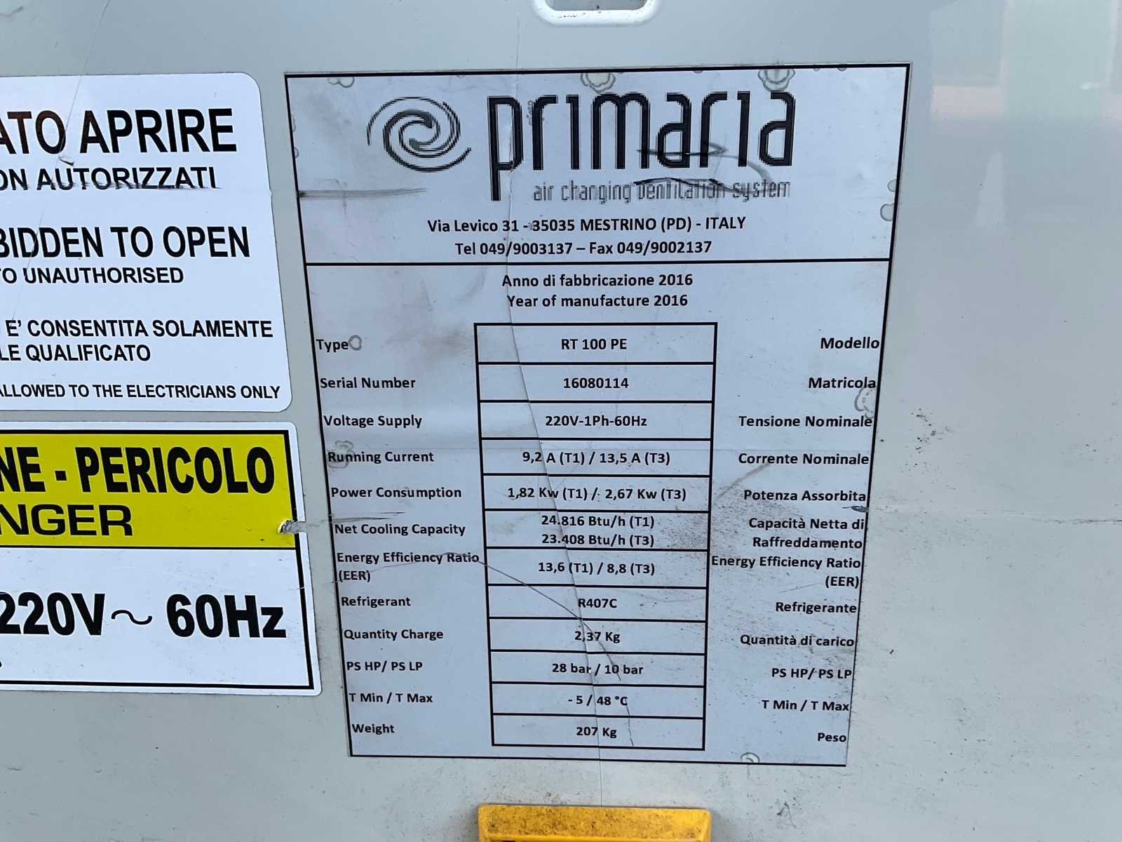 Vermogen: 1,82kW, Gewicht: 207kg, Type: Koudemiddel: R407C, Afmeting: 110x100x120cm. Merk: Primaria Type: RT100 PÉ Serienummer: 16080114