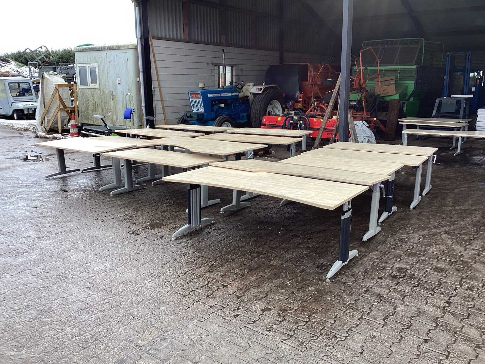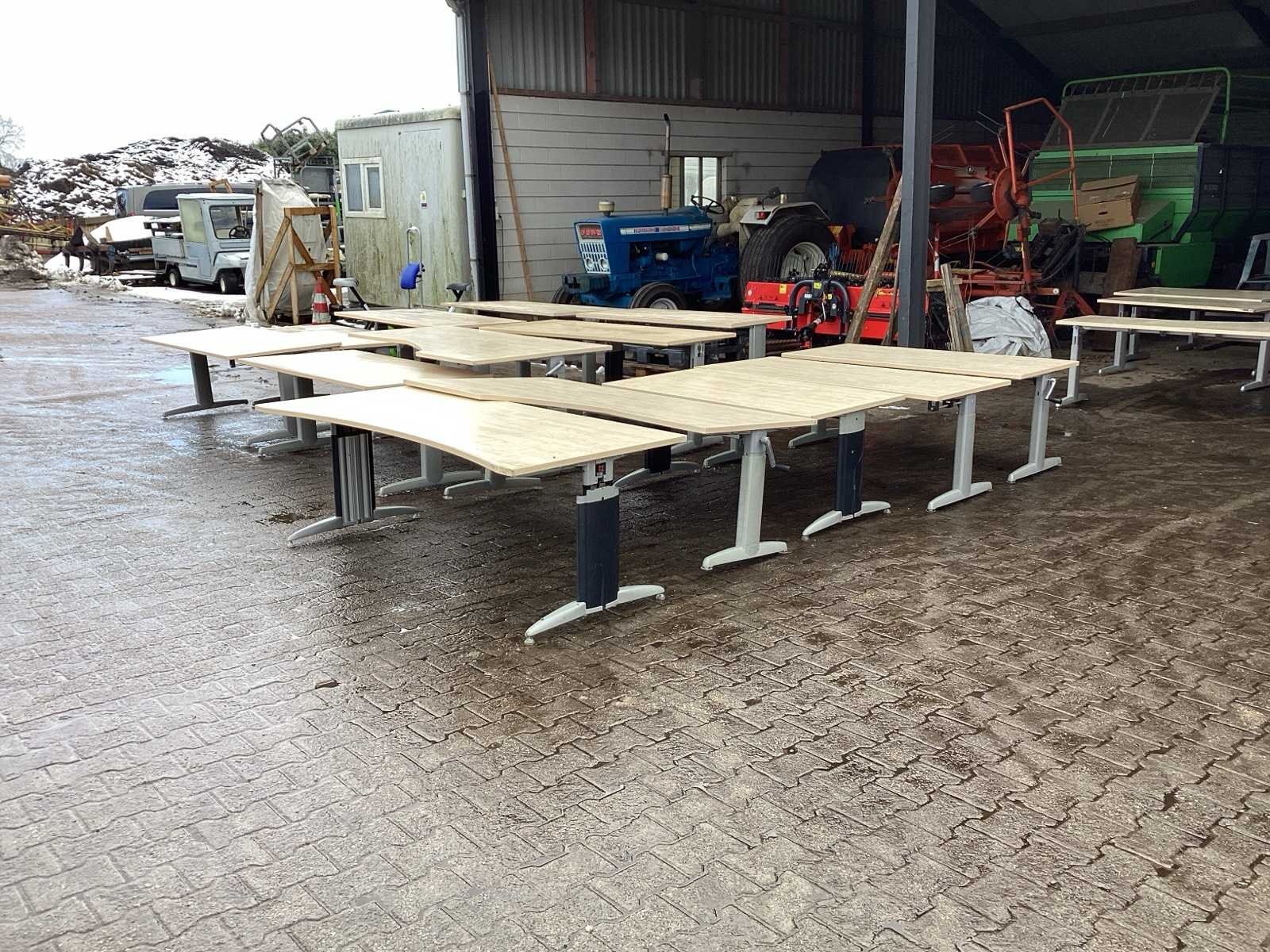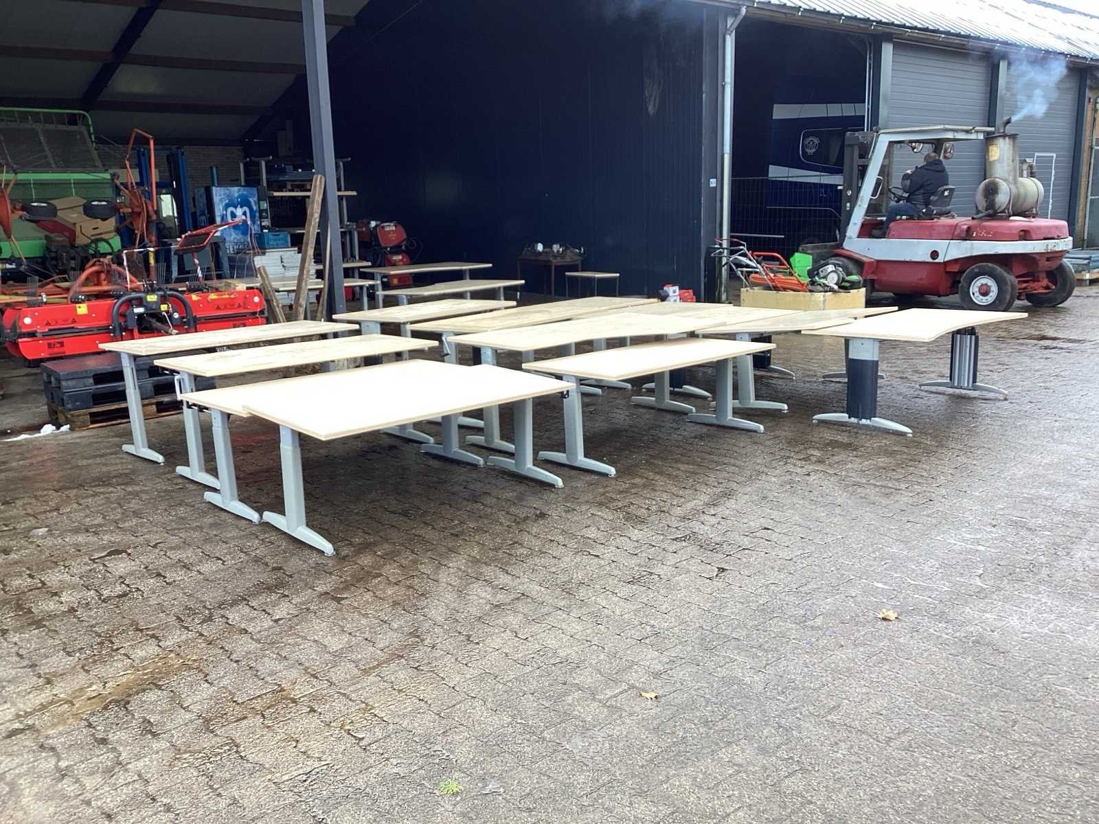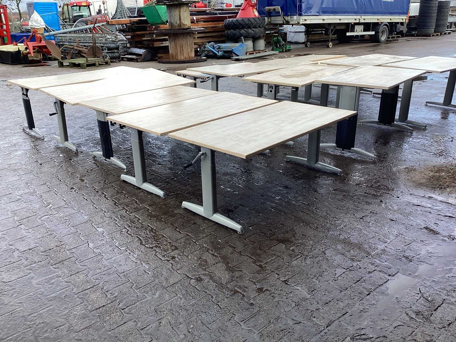 Voorzien van. Diverse bureau’s; in hoogte verstelbaar; de bladen zijn beschadigd; diverse modellen; totaal aantal bureaus 17 x en 4 tafels Merk: Markant