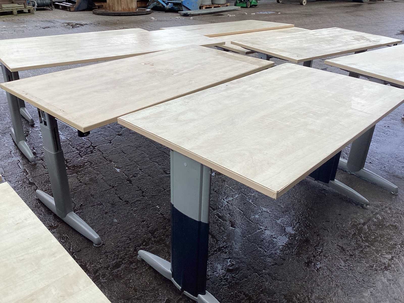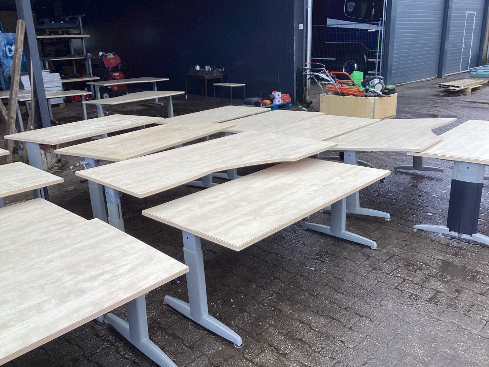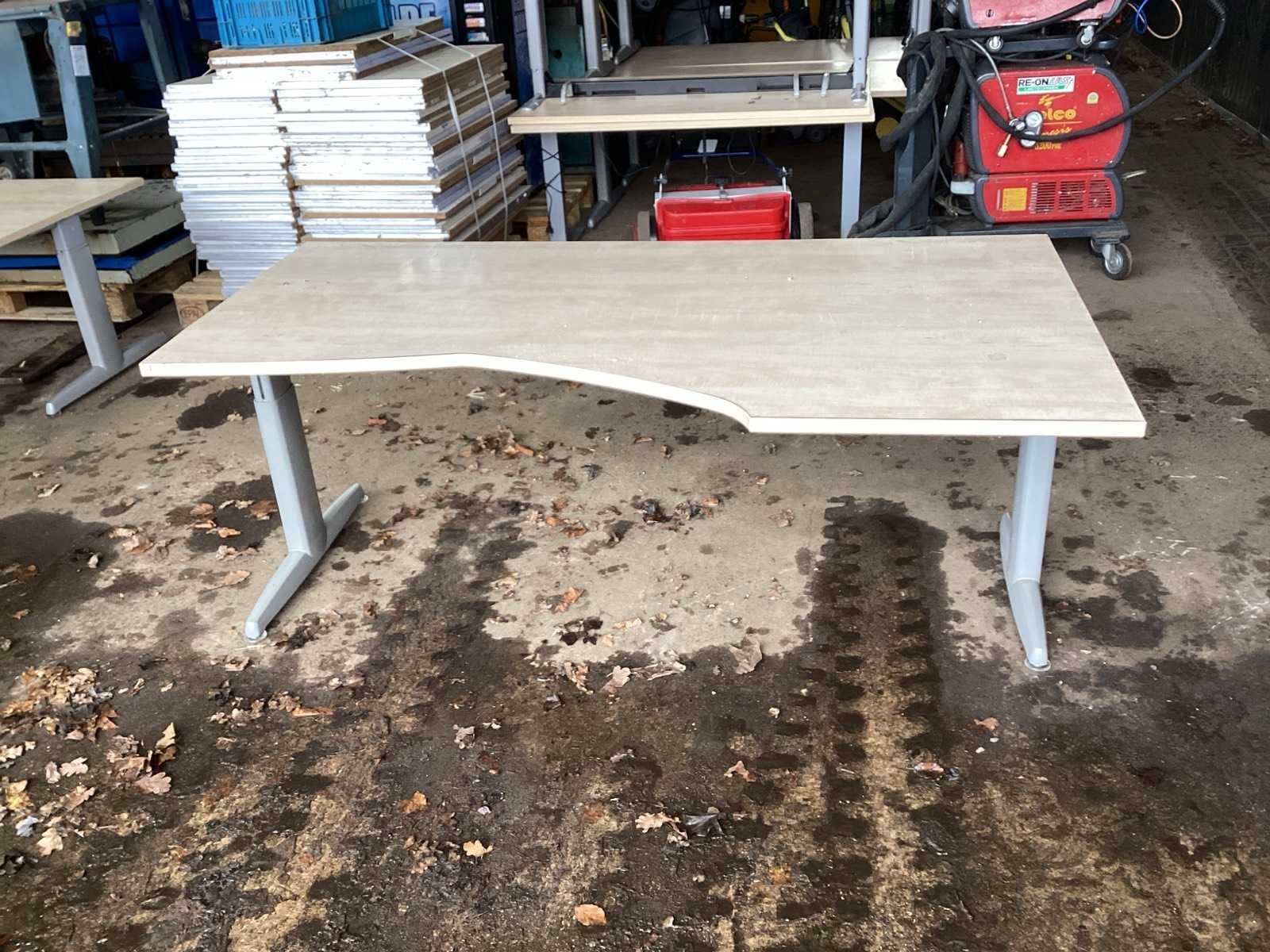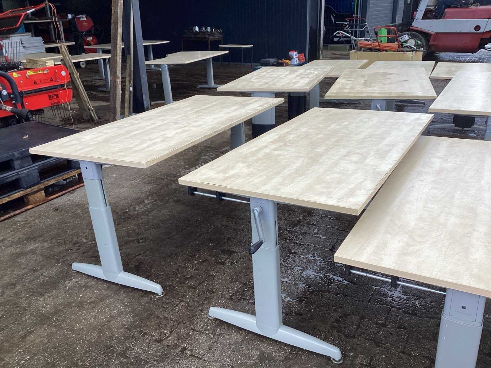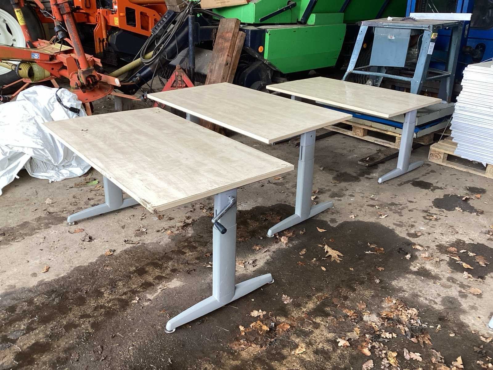 Voorzien van. Diverse bureau’s; in hoogte verstelbaar; de bladen zijn beschadigd; diverse modellen; totaal aantal bureaus 17 x en 4 tafels Merk: Markant