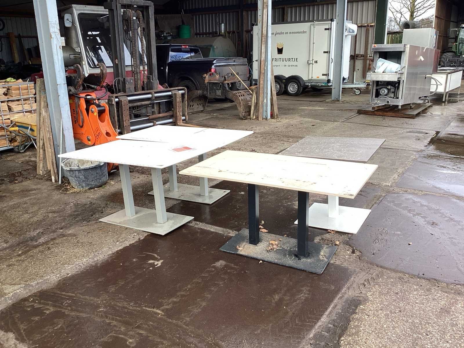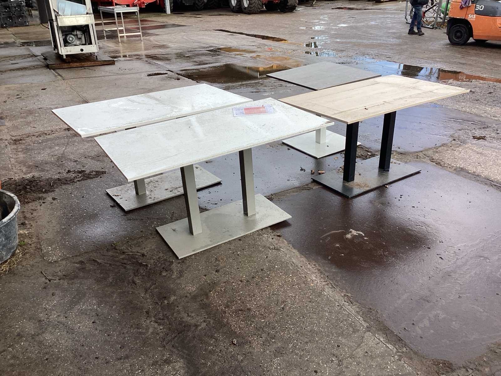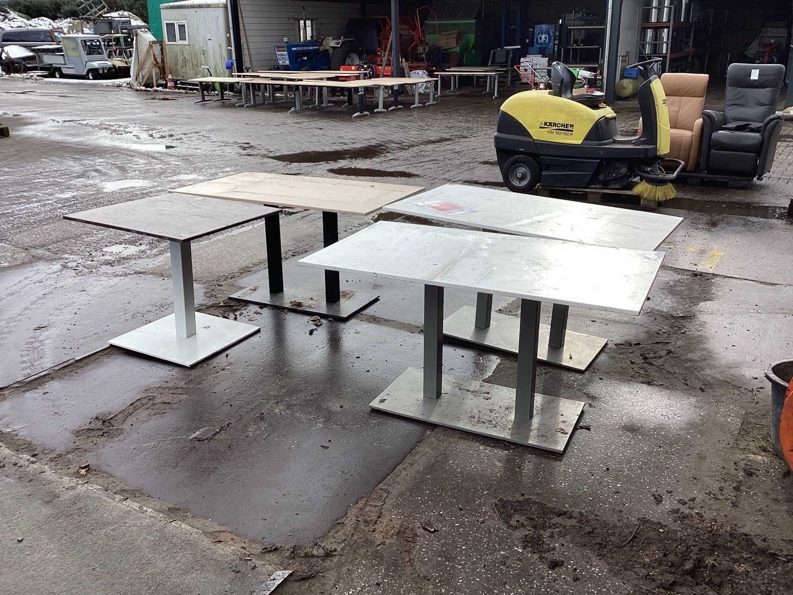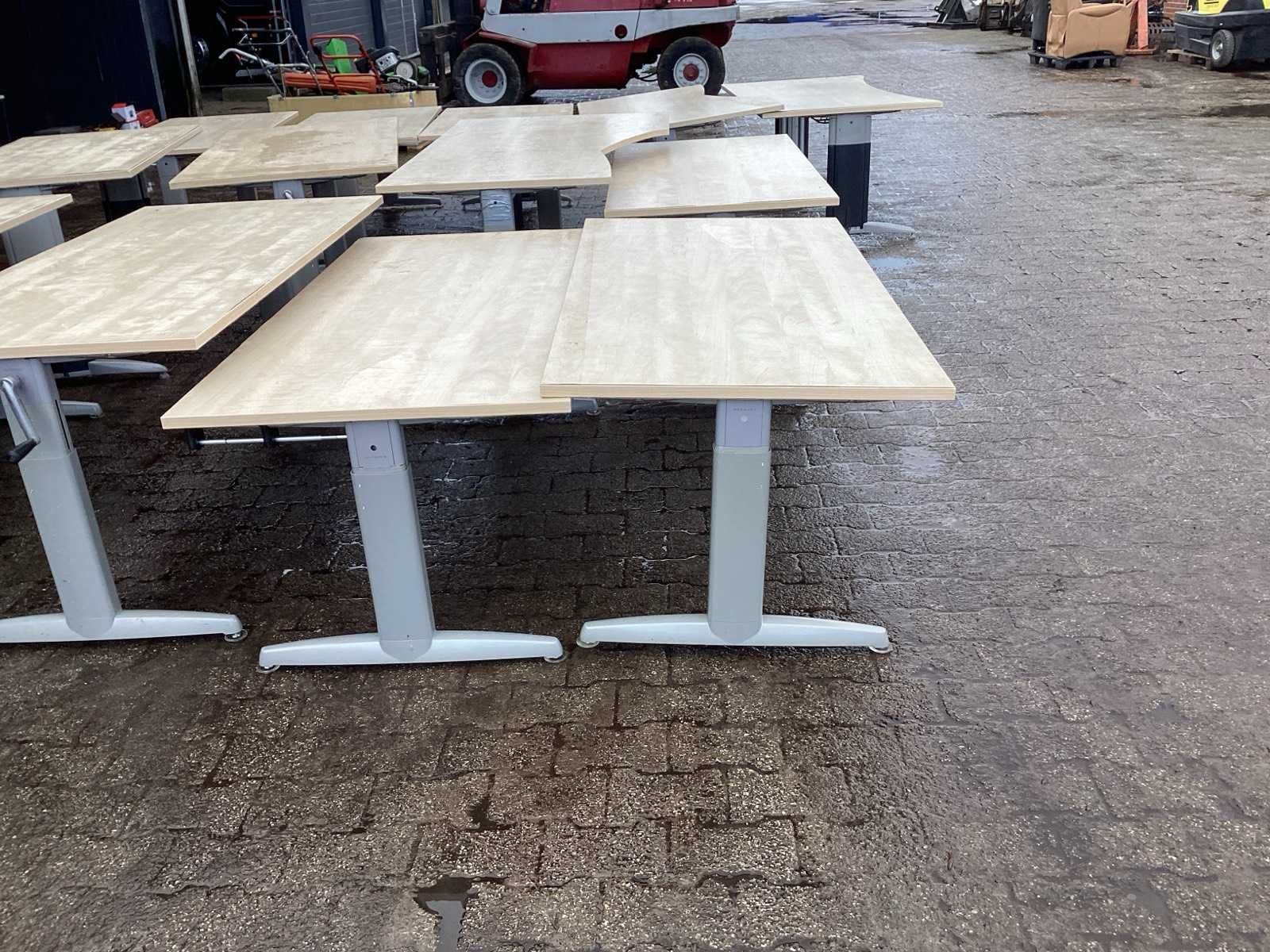 Voorzien van. Diverse bureau’s; in hoogte verstelbaar; de bladen zijn beschadigd; diverse modellen; totaal aantal bureaus 17 x en 4 tafels Merk: Markant