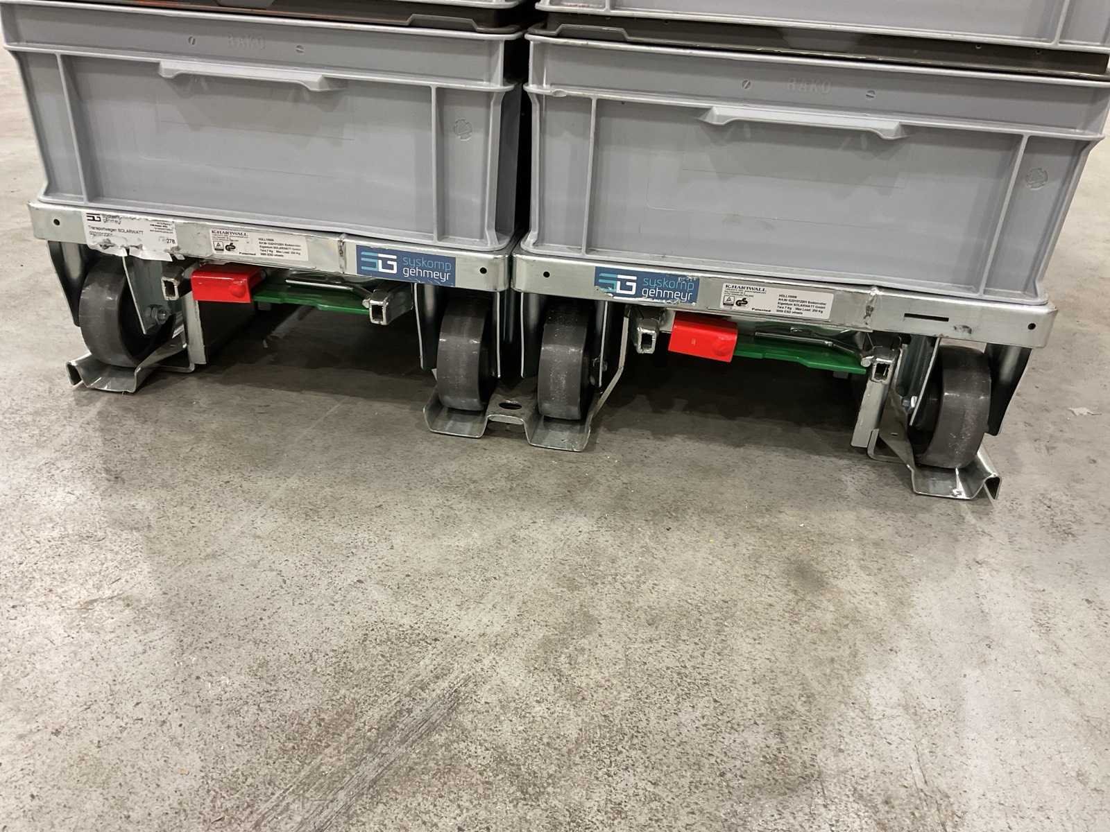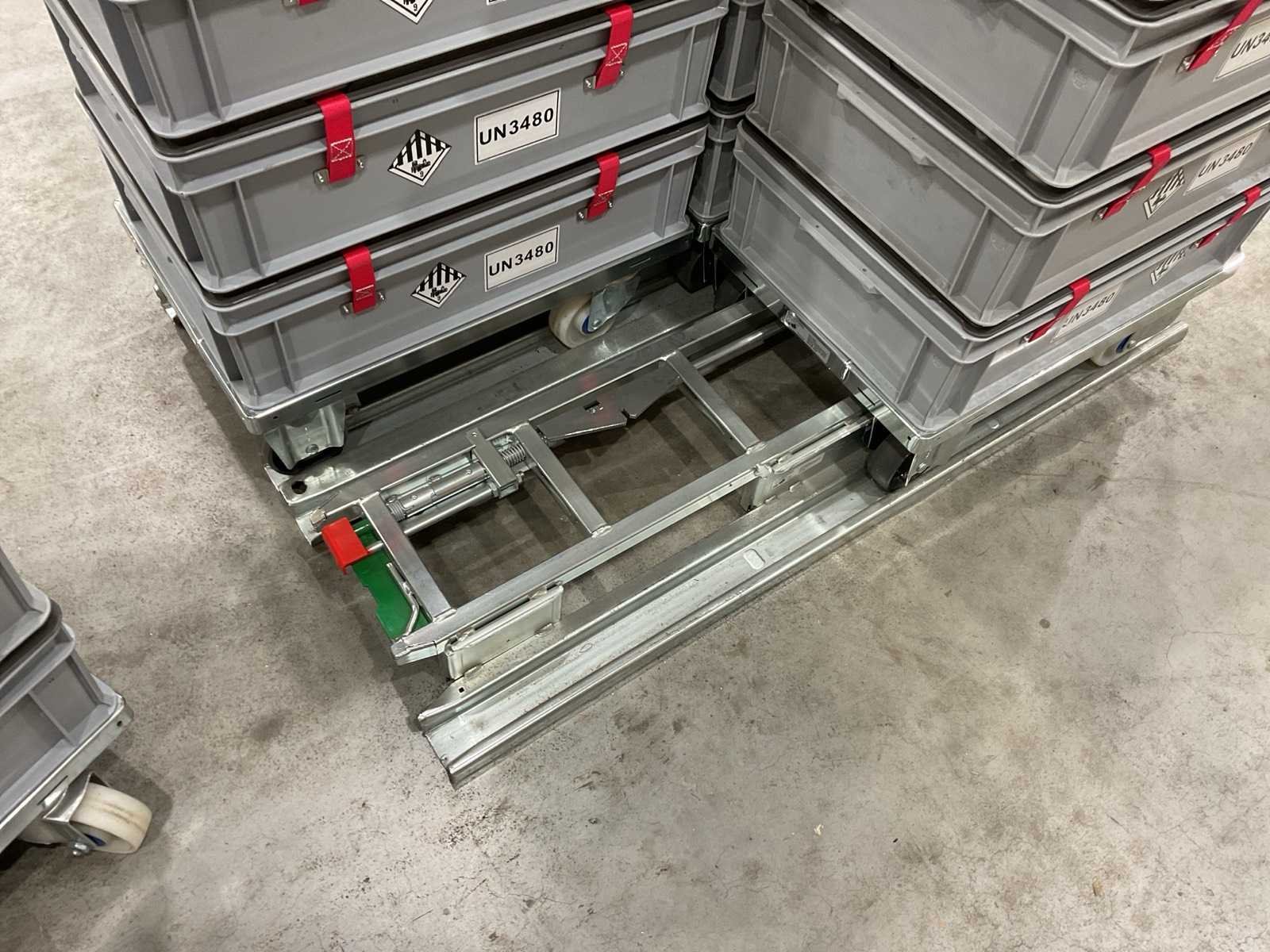 Voorzien van 20 kratten met deksel; 4 karretjes op zwenkwielen; 5 kratten per kar; afmeting per krat L: 600mm B: 400 H: 160mm Merk: Auer-packaging Totale afmeting L: 1200mm Totale afmeting Breedte: 800mm Totale afmeting Hoogte: 1050mm
