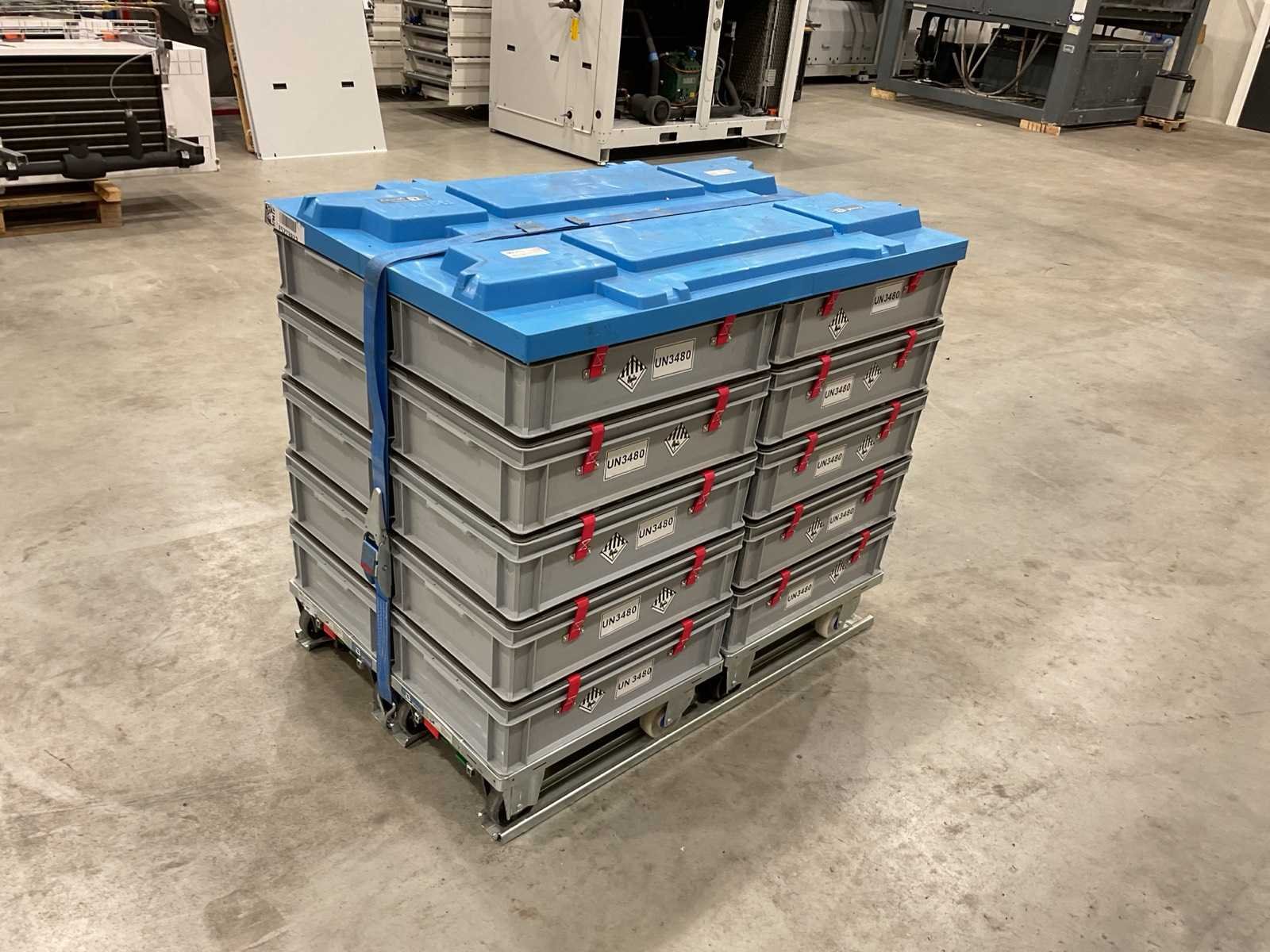Voorzien van 20 kratten met deksel; 4 karretjes op zwenkwielen; 5 kratten per kar; afmeting per krat L: 600mm B: 400 H: 160mm Merk: Auer-packaging Totale afmeting L: 1200mm Totale afmeting Breedte: 800mm Totale afmeting Hoogte: 1050mm