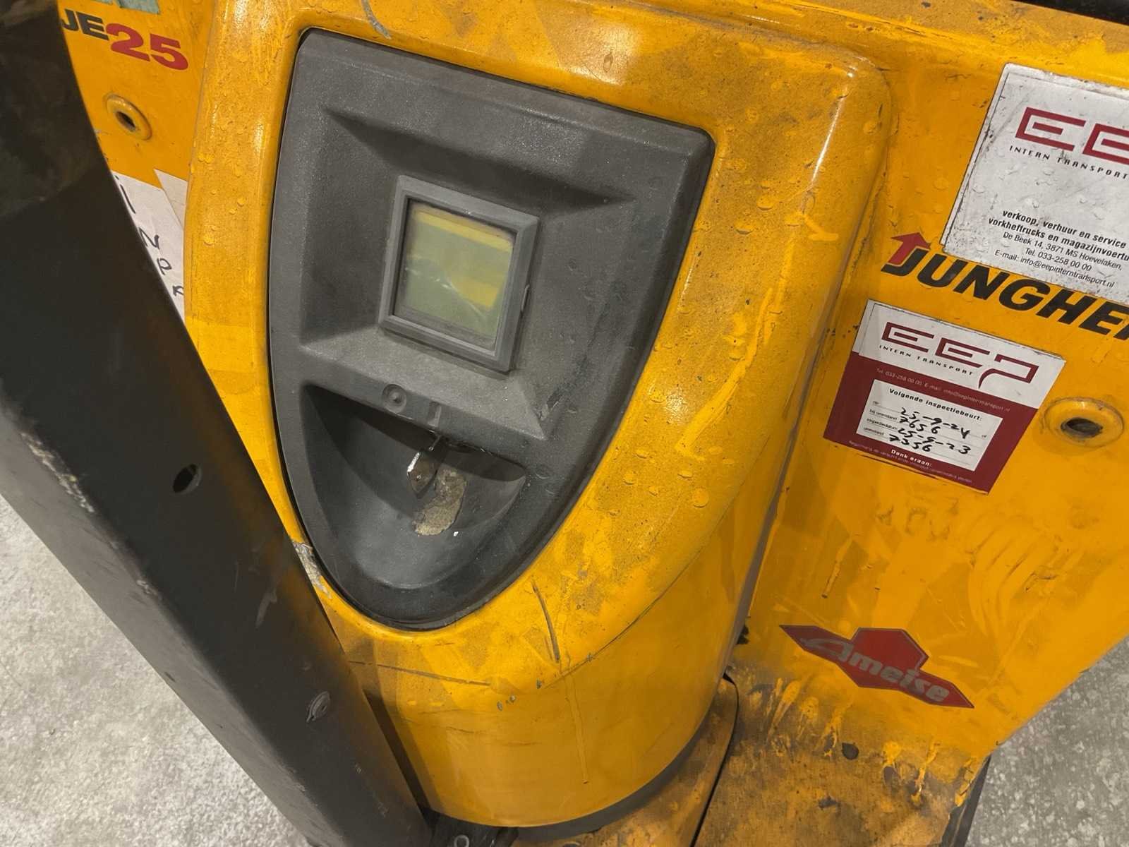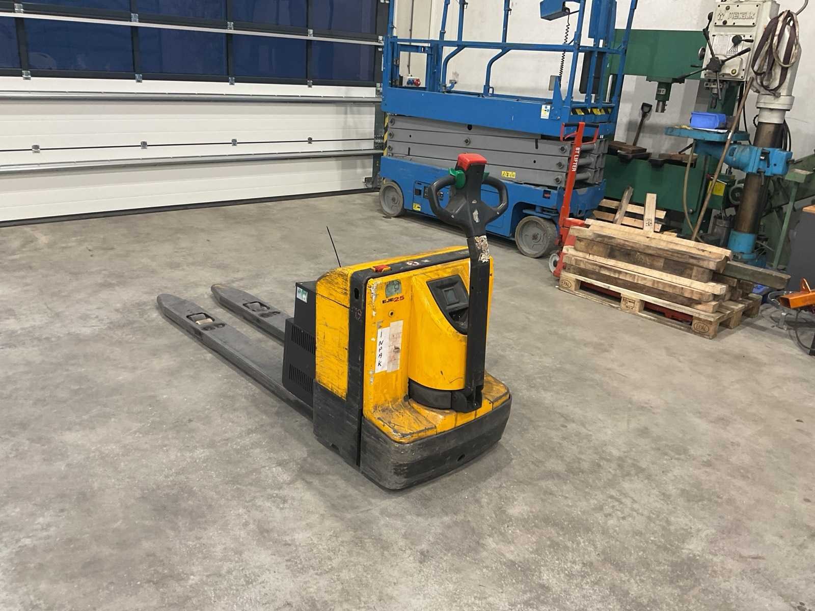 Voorzien van lader 230v; lepel lengte 195cm; werking Onbekent accu leeg Merk: Jungheinrich Type: EJE 25 Hefvermogen: 2000kg Totale afmeting L: 2600mm Totale afmeting Breedte: 700mm Totale afmeting Hoogte: 1300mm